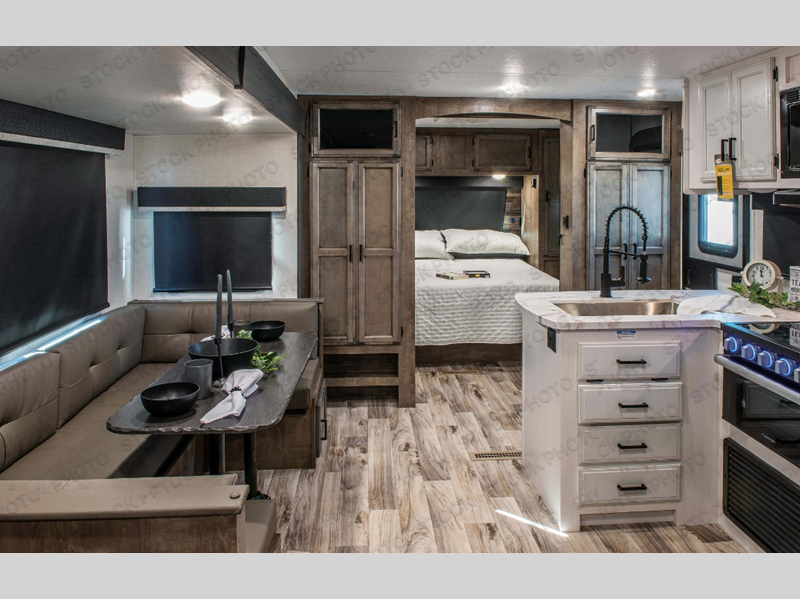 Every Venture RV SportTrek lightweight travel trailer is constructed to offer peace of mind and the comforts of home! Their purposeful residential kitchens are packed with handy features like a Furrion oven and three burner cooktop, a large stainless steel sink with a cover and dish drying rack, plus a 12V refrigerator. You will find plenty of storage throughout, including Safe-Tek hidden storage with a charging center and StorMore nightstands on either side of the bed behind the full-length closets. And the magnetic slam-latch baggage doors and spacious pass-through storage area will hold your outdoor gear in place. They even come with a hot and cold exterior shower and SporTrek's Weather Shield which includes a forced air heated and enclosed underbelly, high output A/C ducting, and more features that will let you extend your camping season. You will also love the new residential upgraded furniture, Serta memory foam mattress, barn style passage doors, and many more comforts!