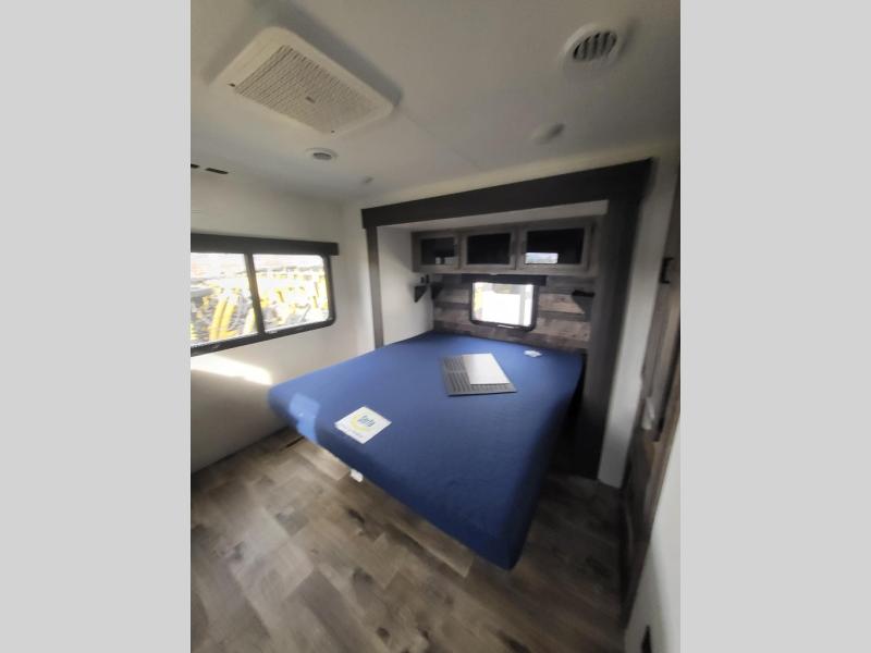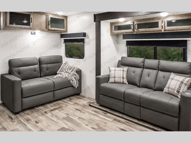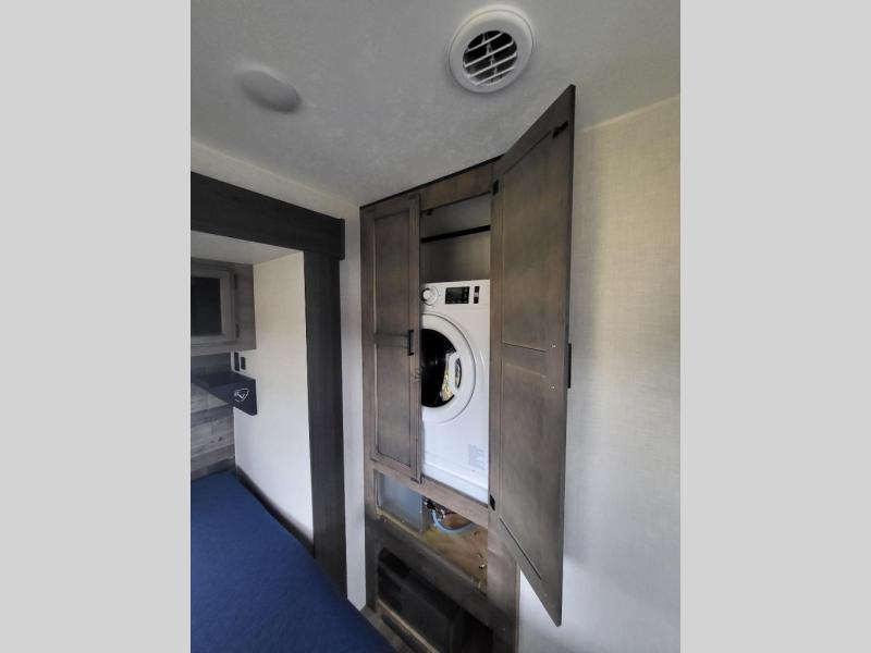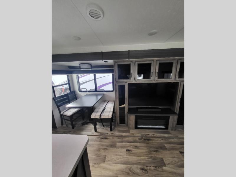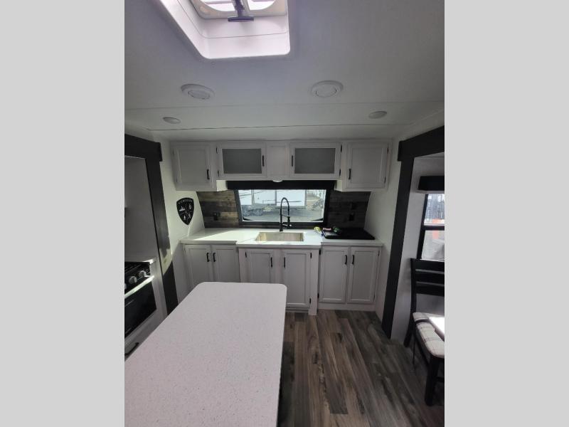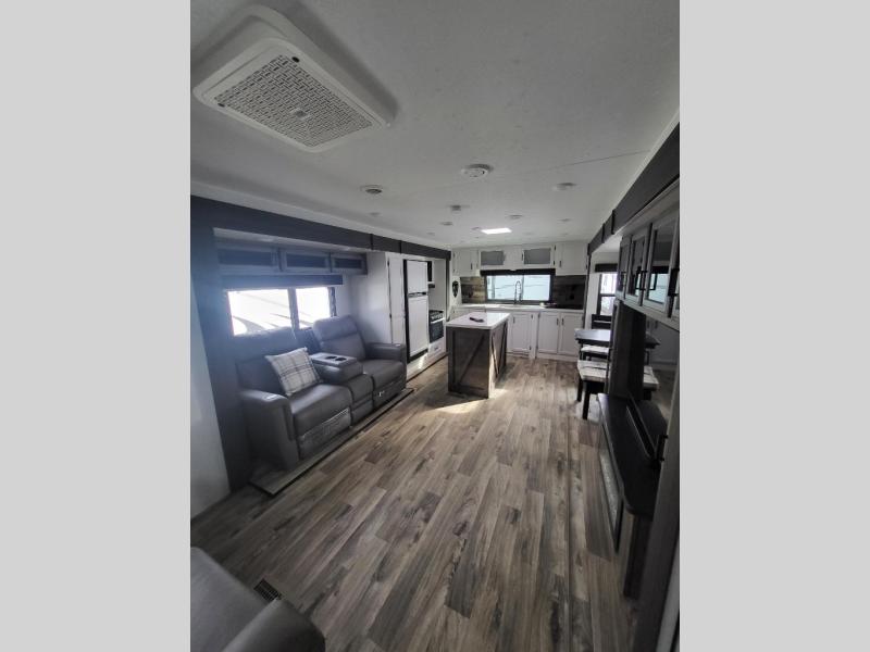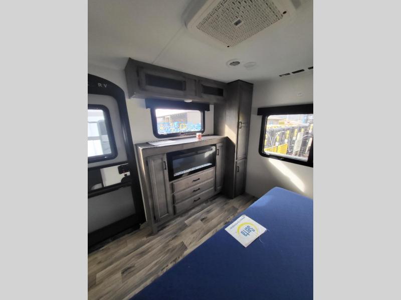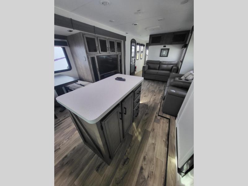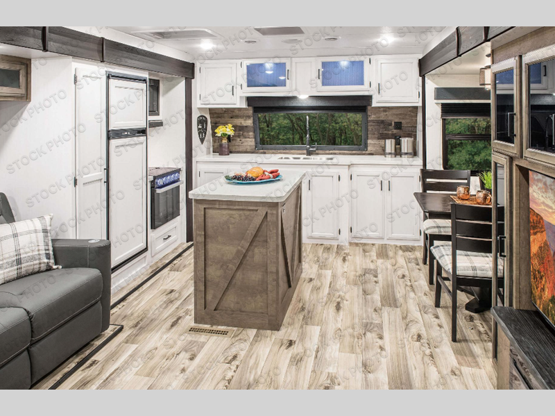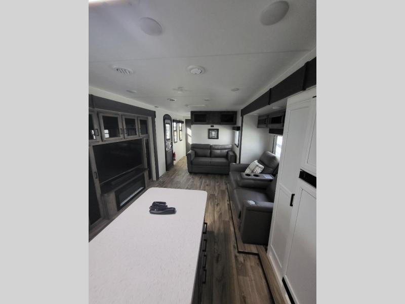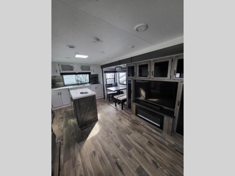 Comfort and convenience is what you will find all throughout this travel trailer! The front kitchen has a large single-bowl under-mount stainless steel sink with lots of countertop space on either side of it, a three burner cooktop, a 10 cu. ft. refrigerator to keep your perishables fresh, a pantry for your snacks, and a kitchen island to make meal prepping even easier. You can enjoy your meals at the table and chairs then relax on either the 64" sofa or theater seating with USB charging ports. You will feel right at home in the rear private bedroom with a 70" x 80" Sleep Tight king bed slide, a dresser with a 30" frameless fireplace, and a wardrobe that is prepped to add an optional washer and dryer, plus you even have an entrance/exit door to the unit with triple pull-out aluminum steps. There is an exterior campfire café with a refrigerator, a sink with countertop space, and a griddle for juicy burgers!