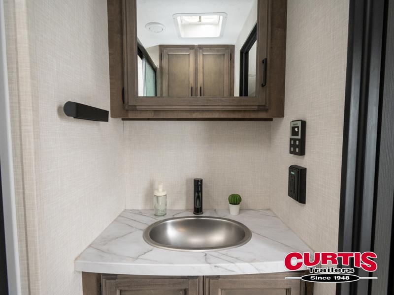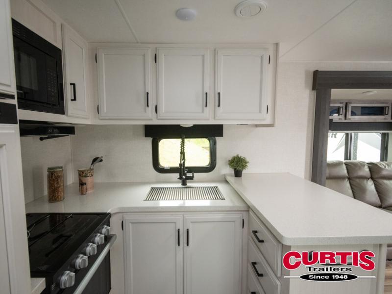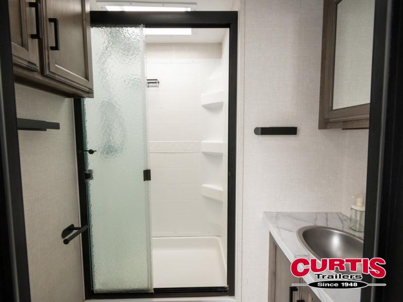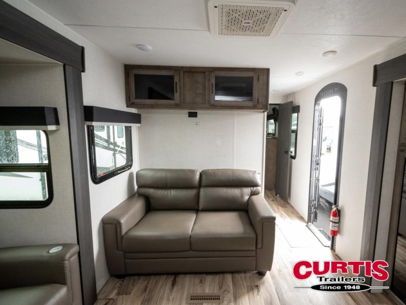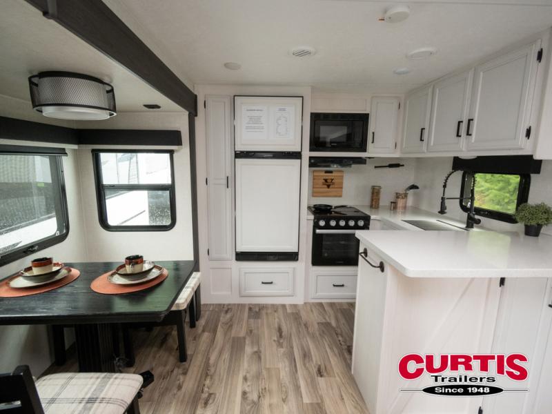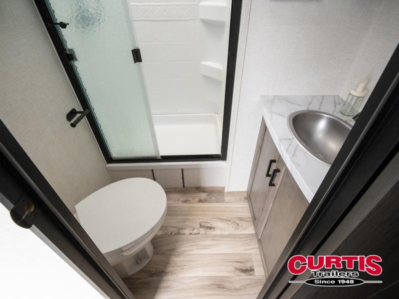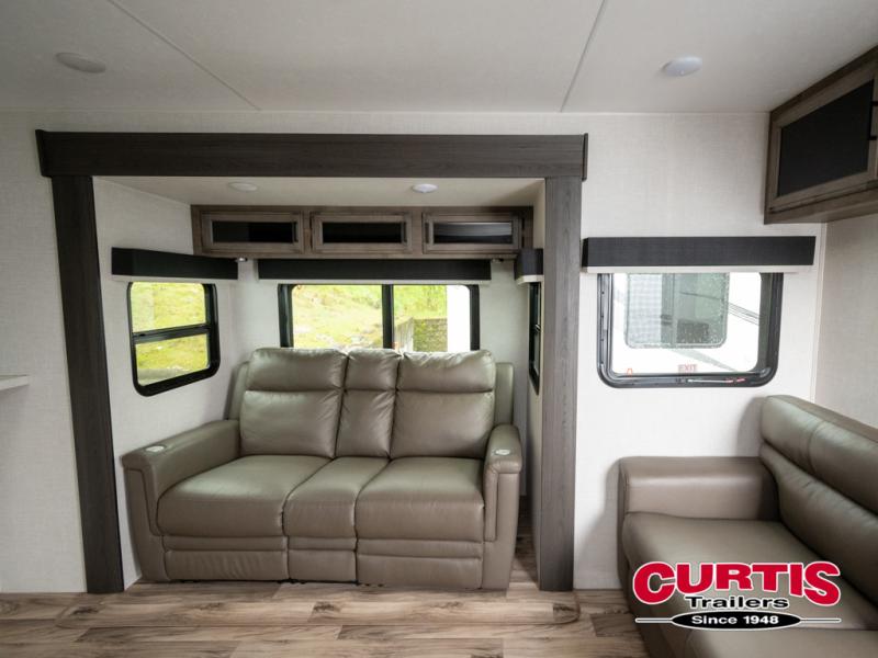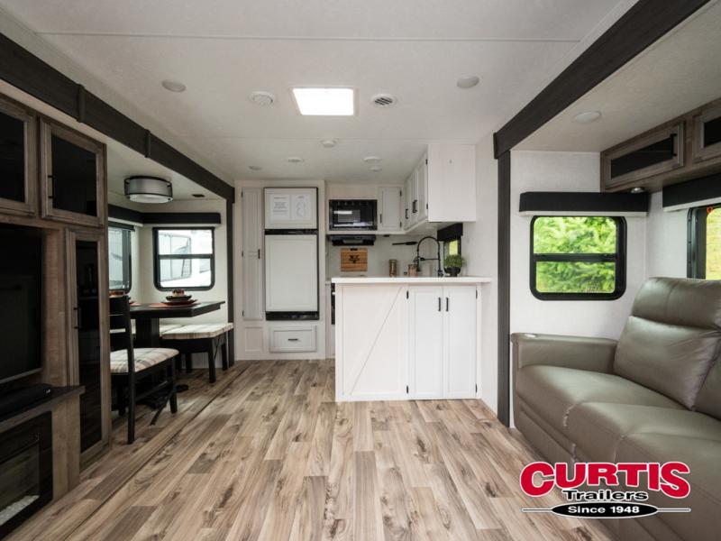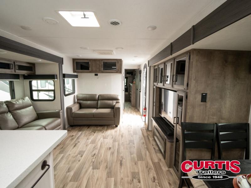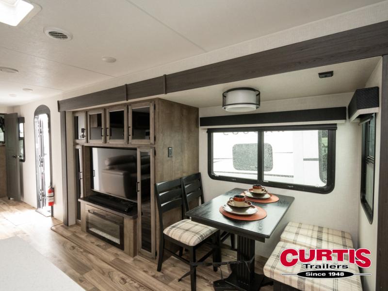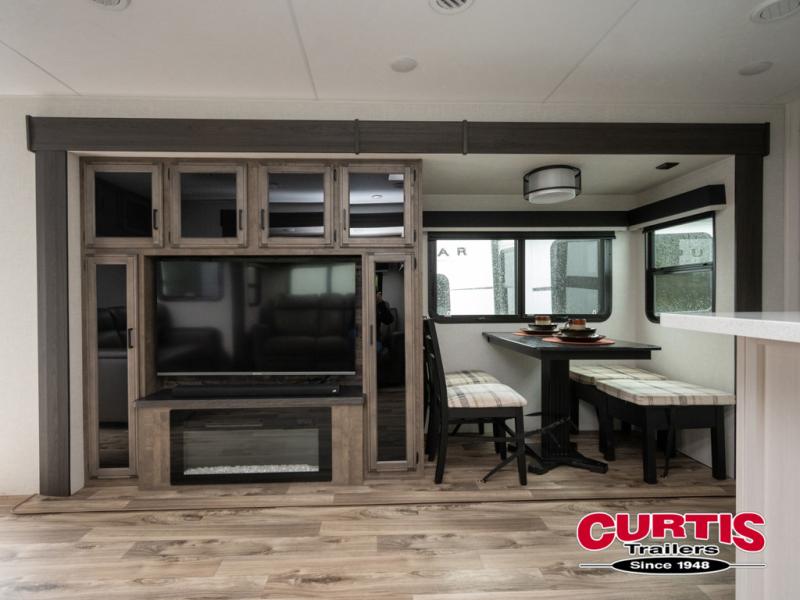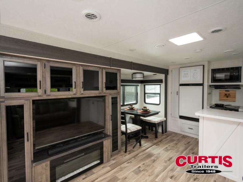 The chef will feel right at home cooking in the rear kitchen with all of the countertop space in this travel trailer! They can even head outside to breathe in some fresh air while cooking at the exterior campfire café with a refrigerator, a sink with countertop space, and a griddle. Relax each night in the middle living area with the 64" sofa and the slide that has theater seating with USB charging across from the entertainment center with a TV and 30" frameless fireplace. When you're ready to wind down your nights, take a hot shower in the full bathroom with the 30" x 36" shower then head to the front private bedroom and either read a book at the window seat or lay in the 70" x 80" sleep tight king bed slide while watching a movie with the TV or watch the 30" frameless fireplace!