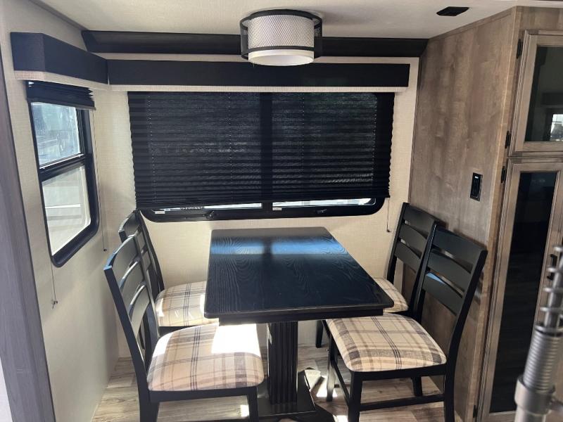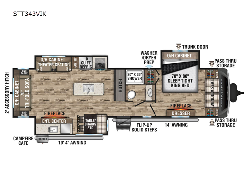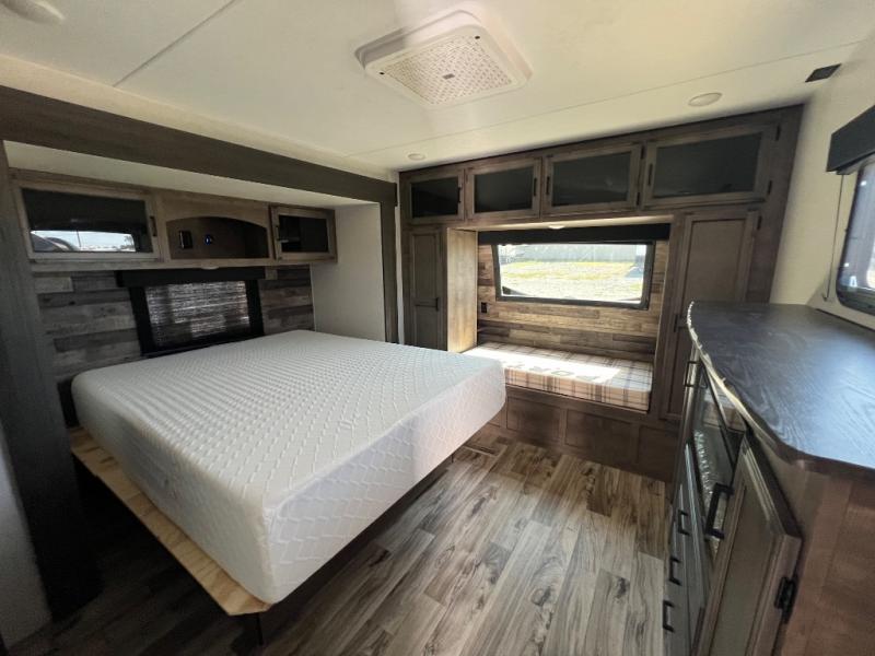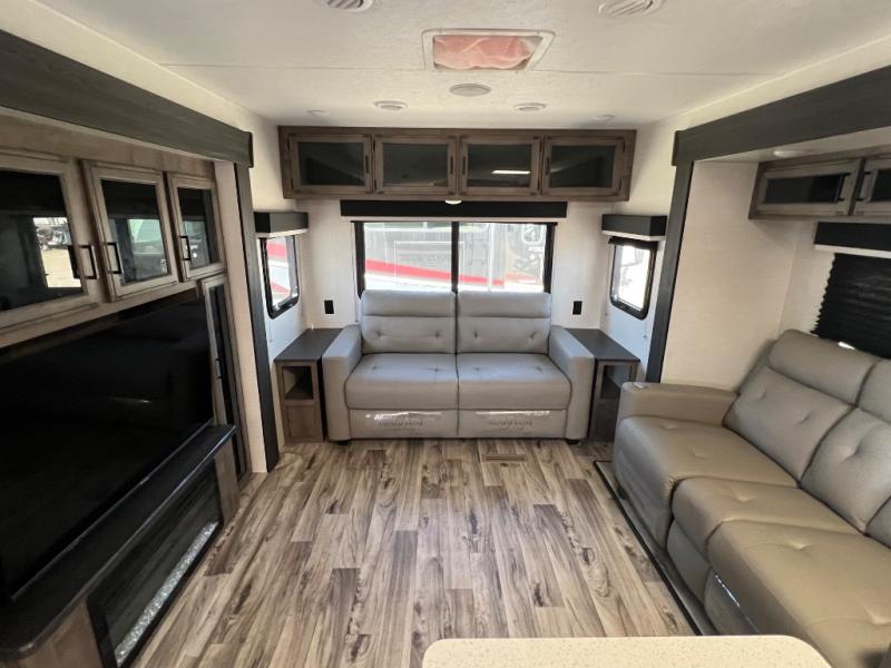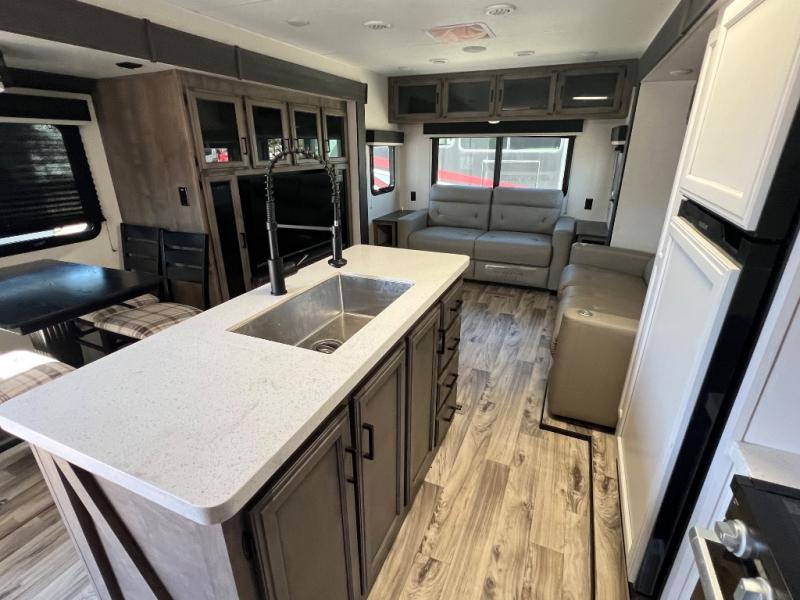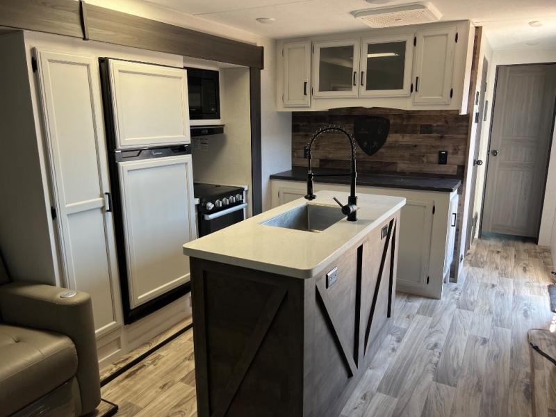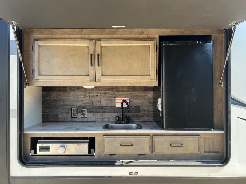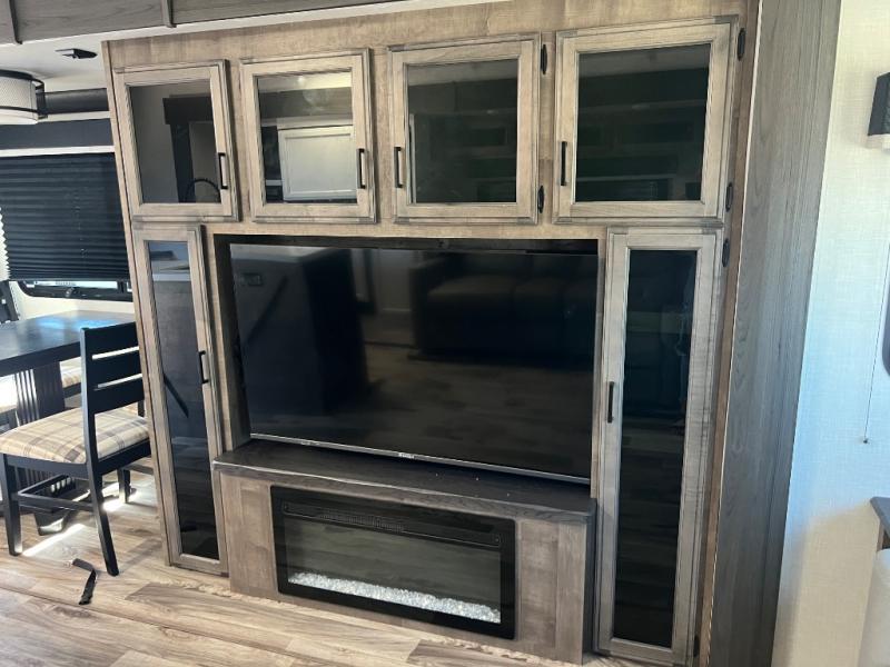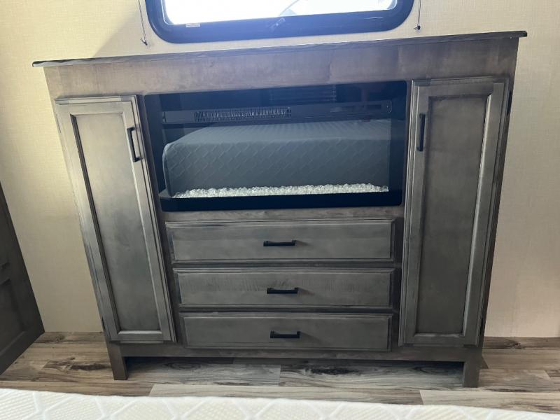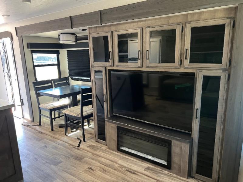 Pack your bags and hitch up this travel trailer for a great weekend camping trip! The front private bedroom has a 70" x 80" Sleep Tight king bed slide to lay your head at night, a dresser with a 30" frameless fireplace, a window seat with shelves on either side for your books, and a wardrobe with washer and dryer prep. Freshen up each morning in the full bathroom with the 30" x 36" shower then head to the kitchen to fry up some eggs on the three burner cooktop and pour a cold glass of orange juice stored in the 10 cu. ft. refrigerator. The kitchen island will make your meal prepping easier and the table and chairs offer a comfortable place to enjoy your meals or play card games. You could even cook your meals at the exterior campfire café and set up a table underneath one of the two power awnings!