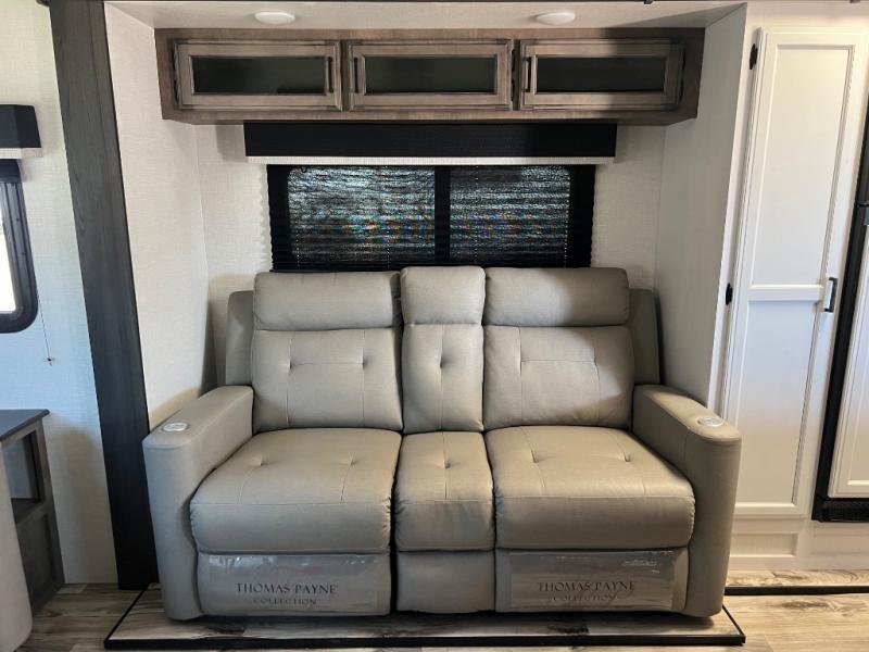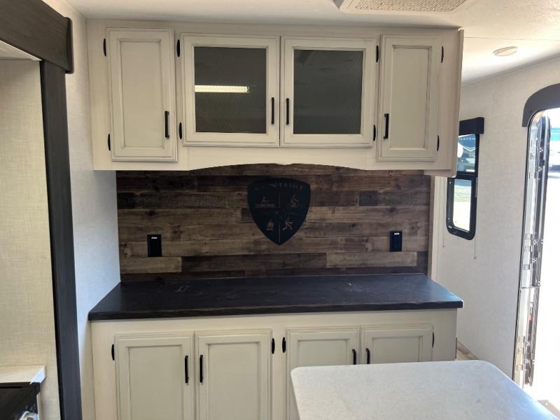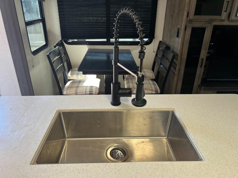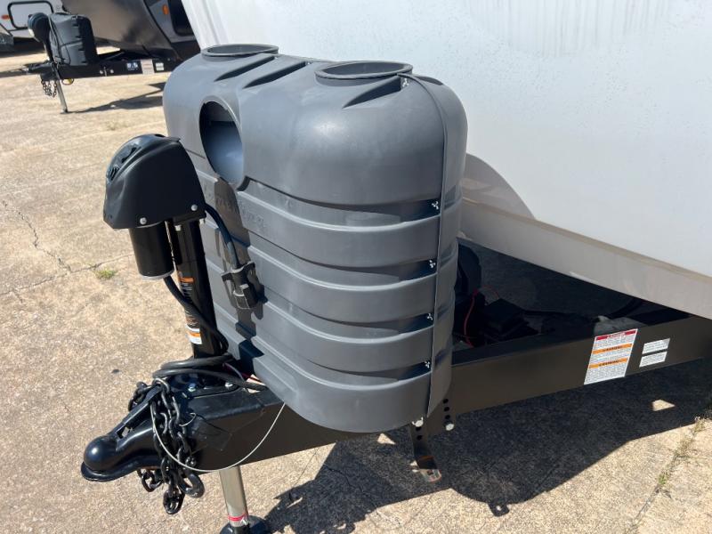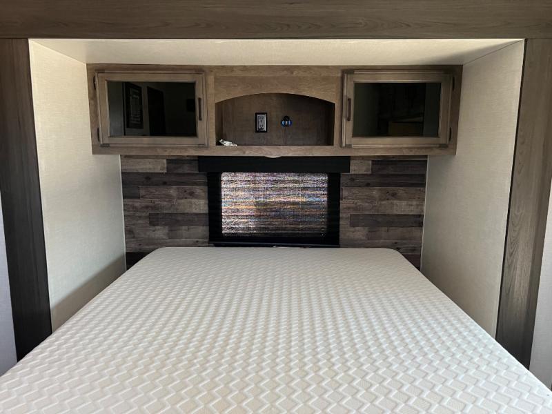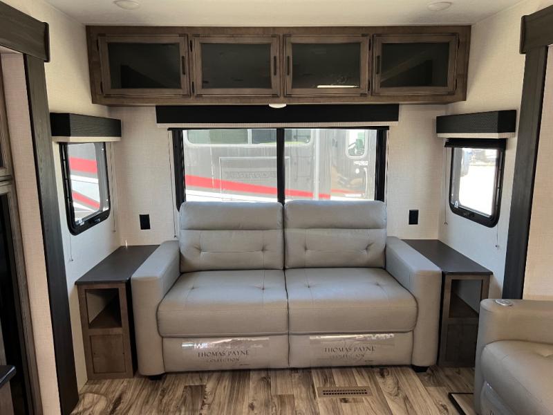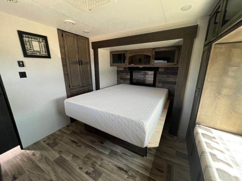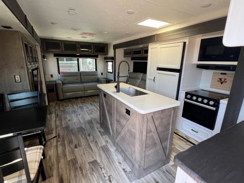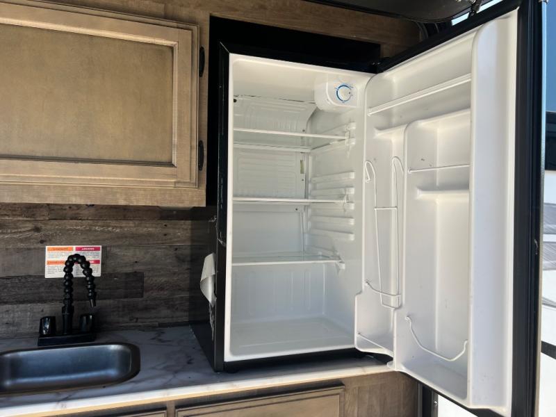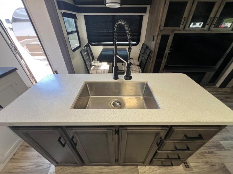 Pack your bags and hitch up this travel trailer for a great weekend camping trip! The front private bedroom has a 70" x 80" Sleep Tight king bed slide to lay your head at night, a dresser with a 30" frameless fireplace, a window seat with shelves on either side for your books, and a wardrobe with washer and dryer prep. Freshen up each morning in the full bathroom with the 30" x 36" shower then head to the kitchen to fry up some eggs on the three burner cooktop and pour a cold glass of orange juice stored in the 10 cu. ft. refrigerator. The kitchen island will make your meal prepping easier and the table and chairs offer a comfortable place to enjoy your meals or play card games. You could even cook your meals at the exterior campfire café and set up a table underneath one of the two power awnings!