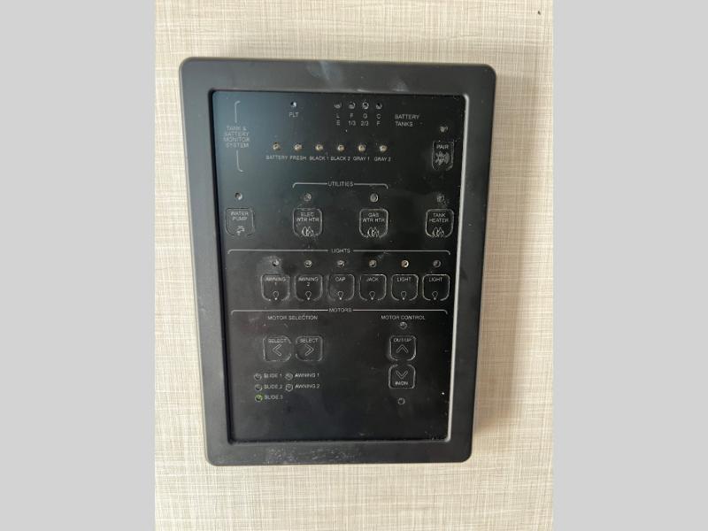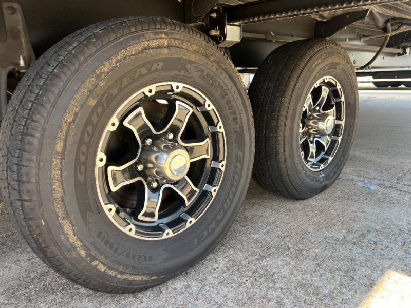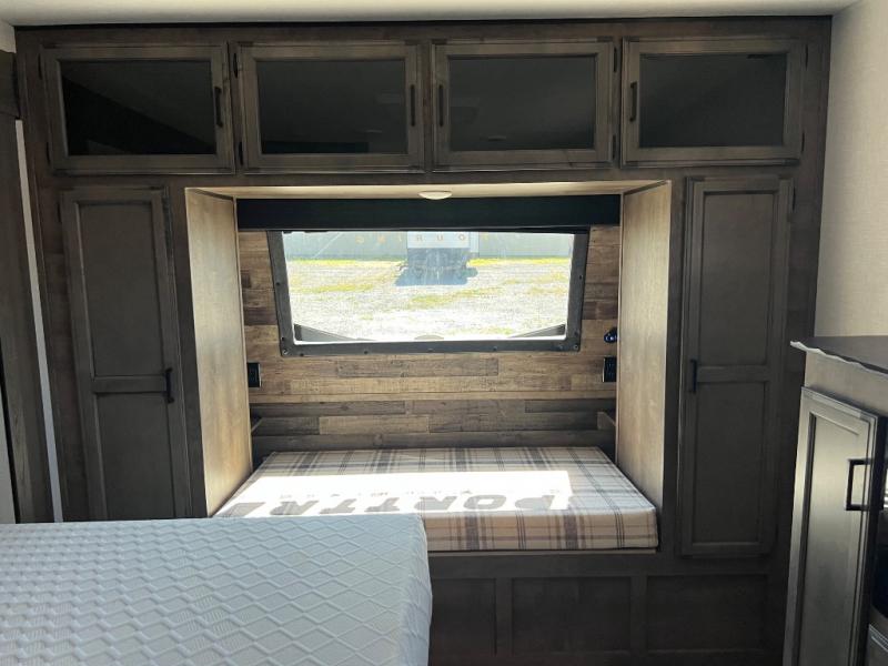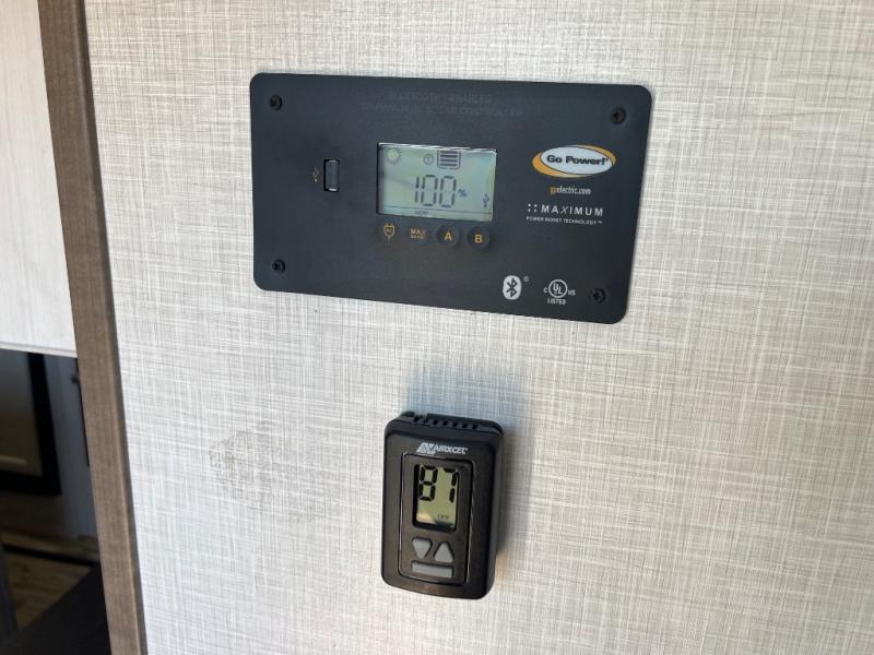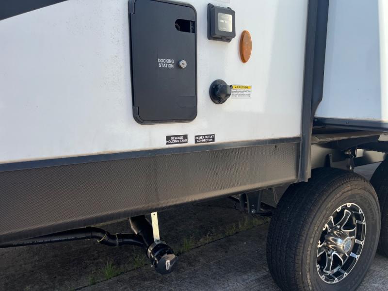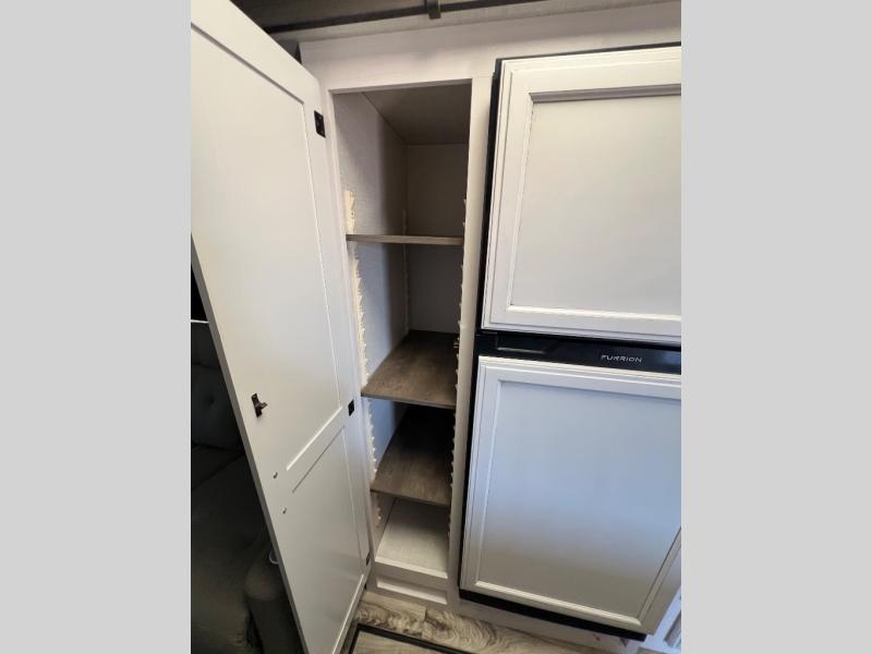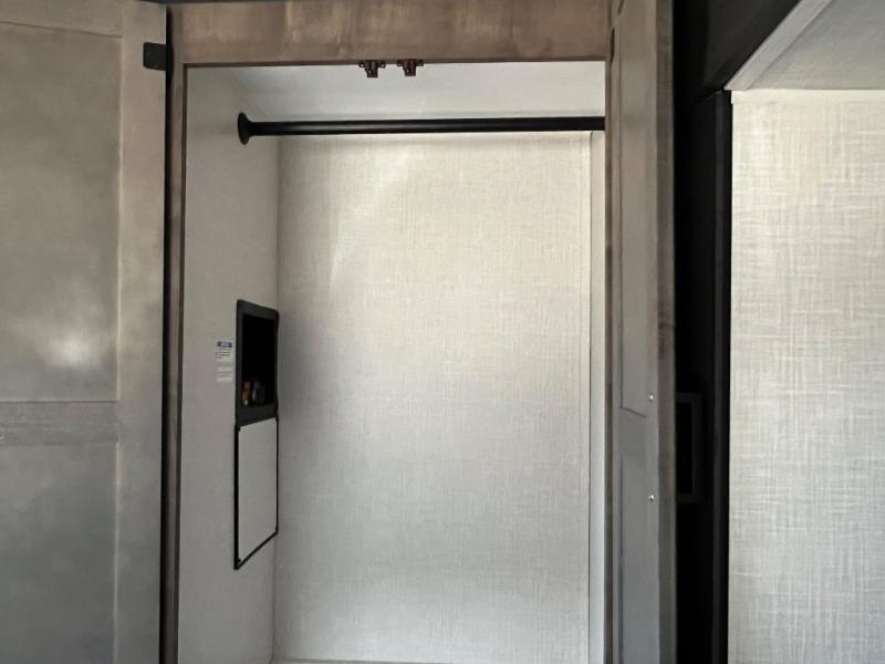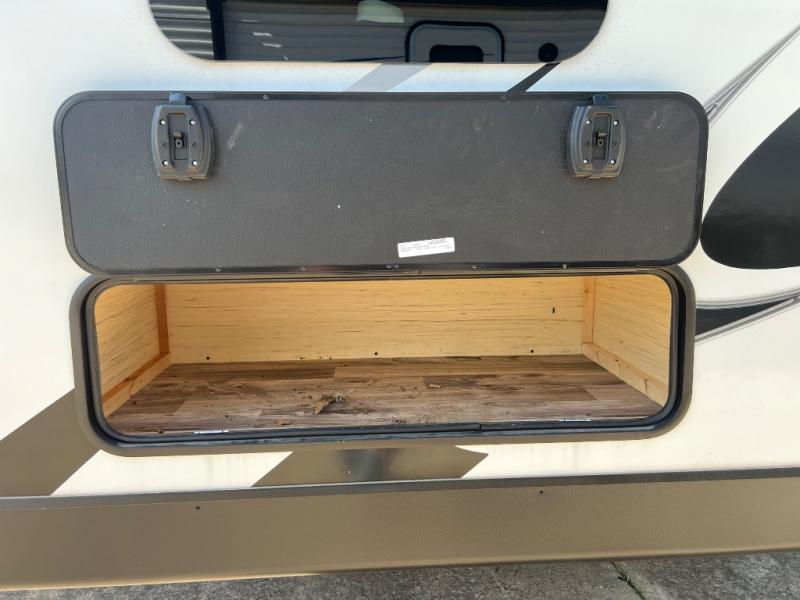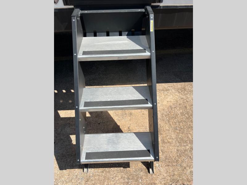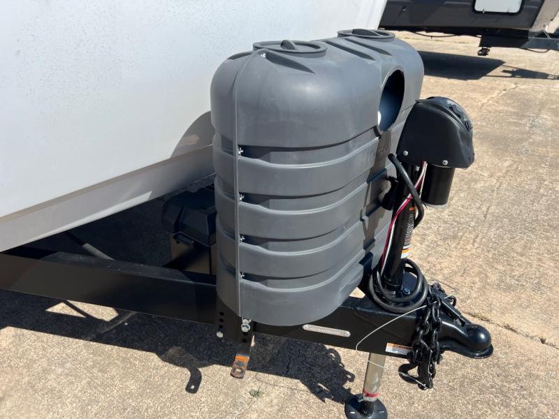 Pack your bags and hitch up this travel trailer for a great weekend camping trip! The front private bedroom has a 70" x 80" Sleep Tight king bed slide to lay your head at night, a dresser with a 30" frameless fireplace, a window seat with shelves on either side for your books, and a wardrobe with washer and dryer prep. Freshen up each morning in the full bathroom with the 30" x 36" shower then head to the kitchen to fry up some eggs on the three burner cooktop and pour a cold glass of orange juice stored in the 10 cu. ft. refrigerator. The kitchen island will make your meal prepping easier and the table and chairs offer a comfortable place to enjoy your meals or play card games. You could even cook your meals at the exterior campfire café and set up a table underneath one of the two power awnings!