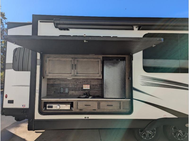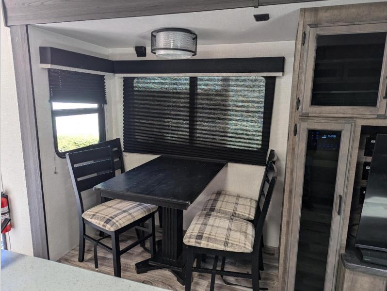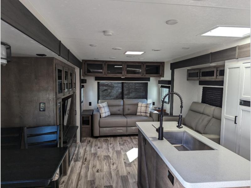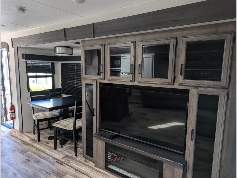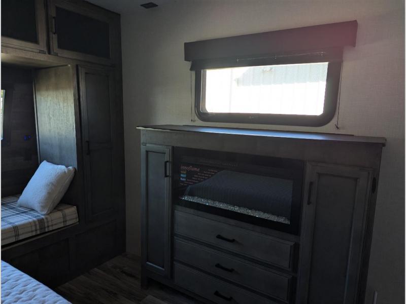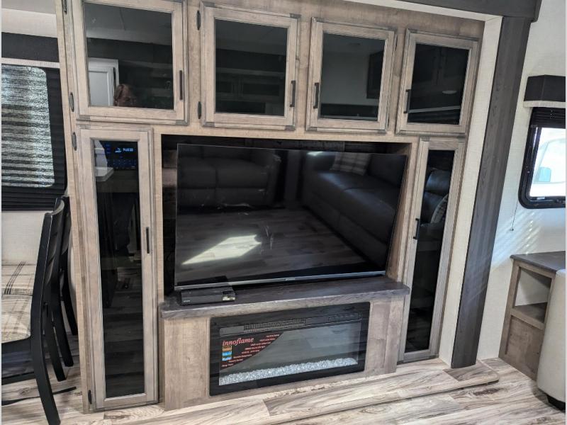 Pack your bags and hitch up this travel trailer for a great weekend camping trip! The front private bedroom has a 70" x 80" Sleep Tight king bed slide to lay your head at night, a dresser with a 30" frameless fireplace, a window seat with shelves on either side for your books, and a wardrobe with washer and dryer prep. Freshen up each morning in the full bathroom with the 30" x 36" shower then head to the kitchen to fry up some eggs on the three burner cooktop and pour a cold glass of orange juice stored in the 10 cu. ft. refrigerator. The kitchen island will make your meal prepping easier and the table and chairs offer a comfortable place to enjoy your meals or play card games. You could even cook your meals at the exterior campfire café and set up a table underneath one of the two power awnings!
