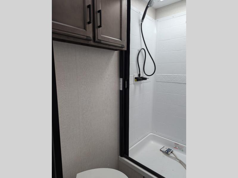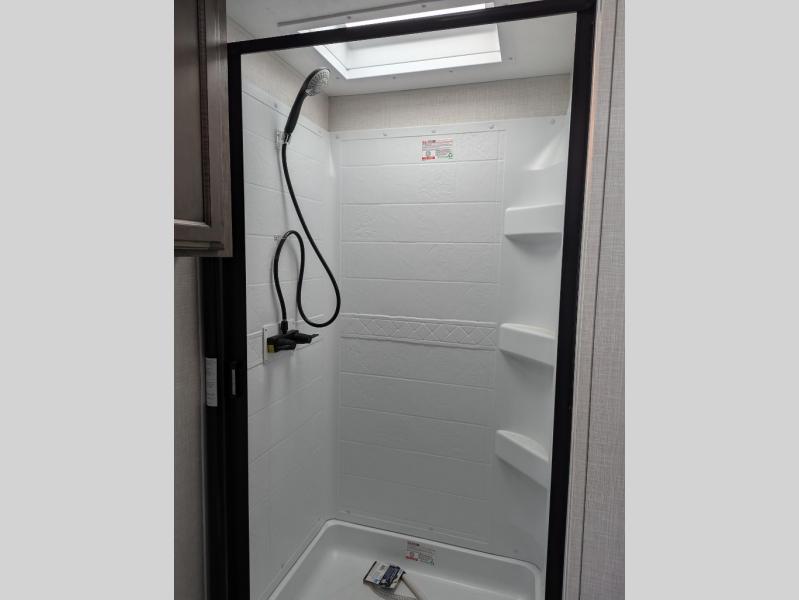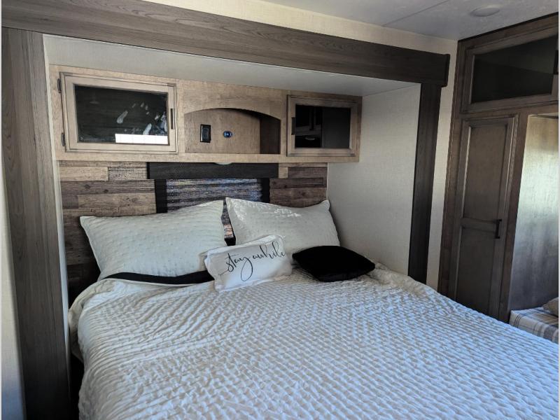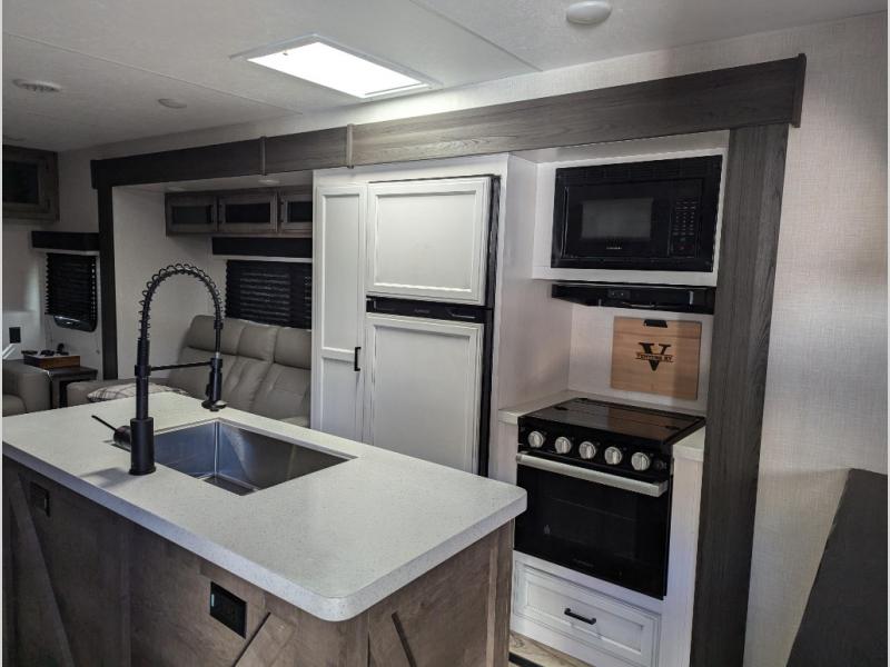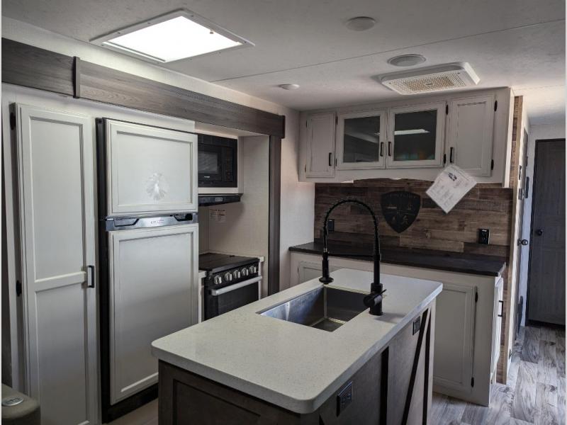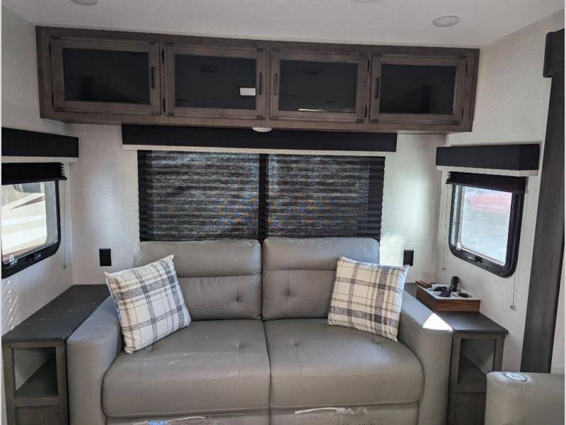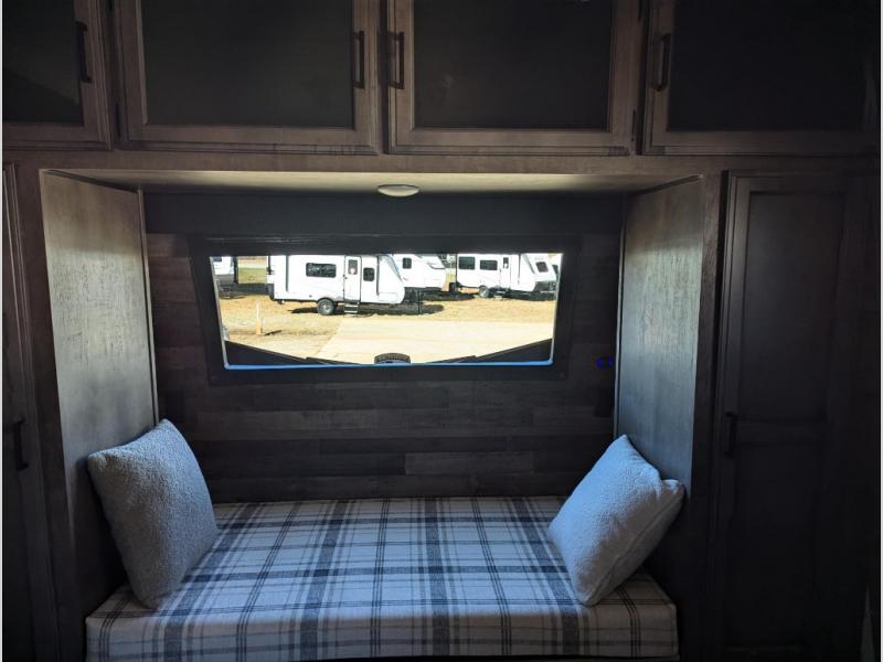 Pack your bags and hitch up this travel trailer for a great weekend camping trip! The front private bedroom has a 70" x 80" Sleep Tight king bed slide to lay your head at night, a dresser with a 30" frameless fireplace, a window seat with shelves on either side for your books, and a wardrobe with washer and dryer prep. Freshen up each morning in the full bathroom with the 30" x 36" shower then head to the kitchen to fry up some eggs on the three burner cooktop and pour a cold glass of orange juice stored in the 10 cu. ft. refrigerator. The kitchen island will make your meal prepping easier and the table and chairs offer a comfortable place to enjoy your meals or play card games. You could even cook your meals at the exterior campfire café and set up a table underneath one of the two power awnings!