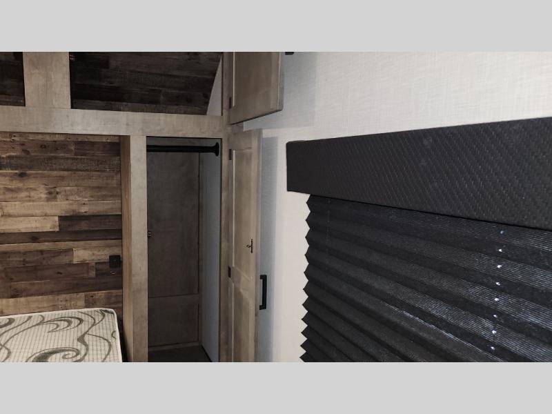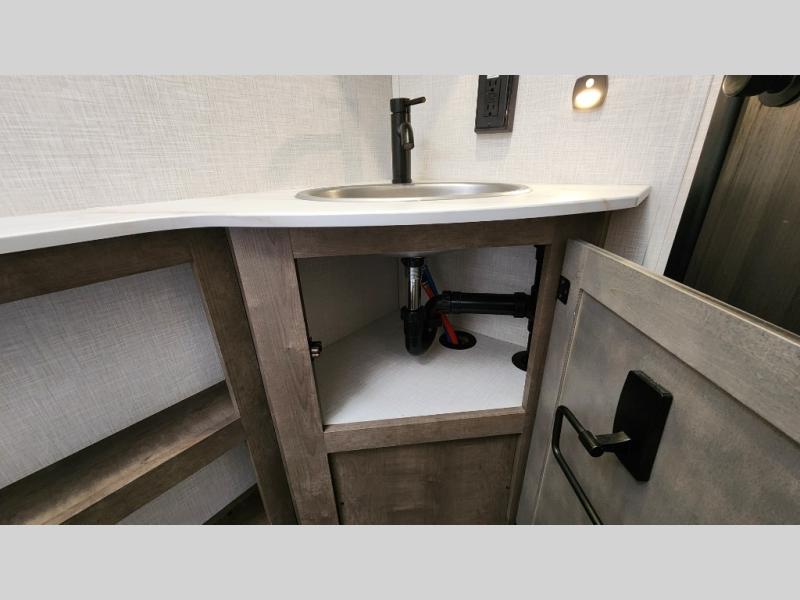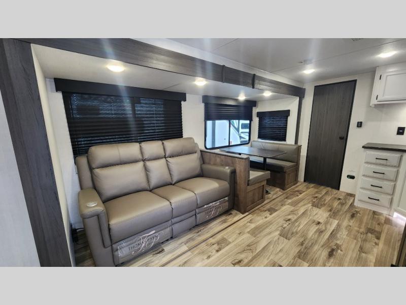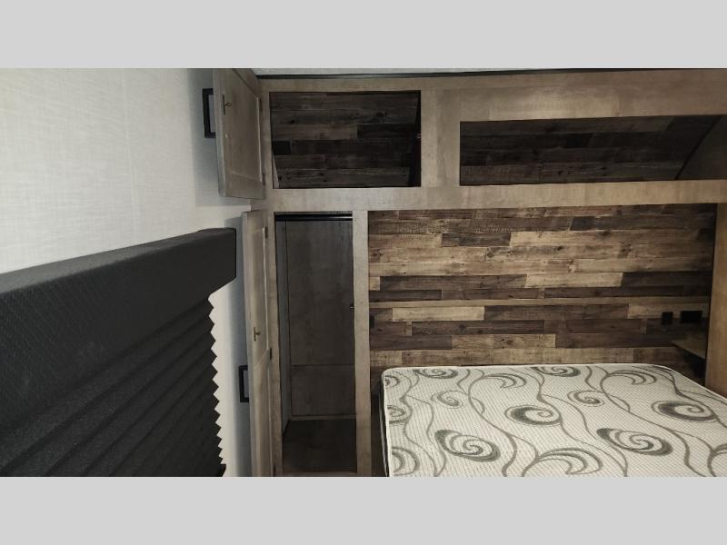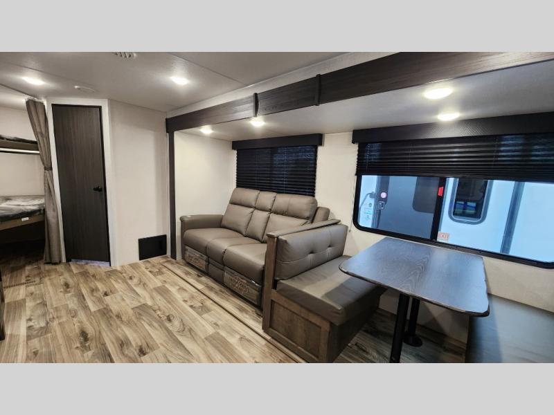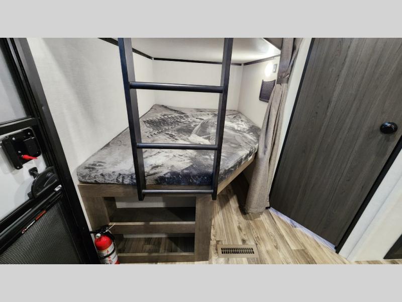 Inside, you’ll find a thoughtfully designed floorplan that maximizes space without adding unnecessary weight. The private front bedroom delivers quiet evenings and cozy mornings, while the rear bunkhouse gives kids and guests their own dedicated retreat. A roomy slideout opens up the living area, creating a welcoming environment for dining, playing, or simply relaxing after a day on the trails. Premium touches like solid-surface countertops, modern cabinetry, upgraded entertainment options, and a well-appointed kitchen ensure you enjoy both function and style on every trip.