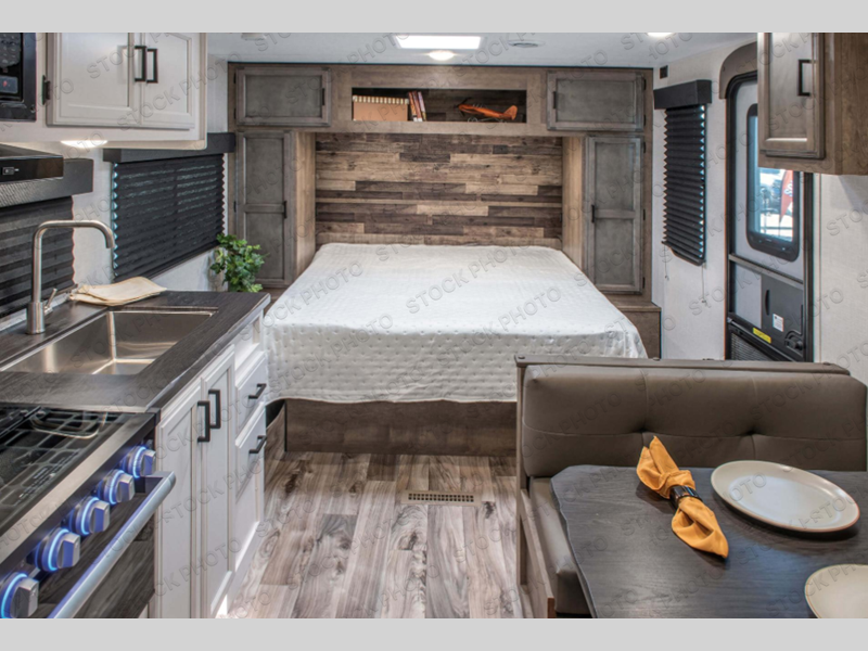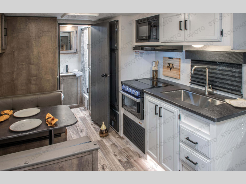 If you want to experience nature while not sacrificing creature comforts, this travel trailer is for you! The full rear bath includes a 30" x 36" shower with a motion-activated nightlight and a linen closet to keep towels organized. You will love sleeping on the Sleep Tight queen bed with dual wardrobes and shelves on either side of the bed, and the booth dinette lets one or two little ones sleep here. It will be so easy to whip up breakfast on the Furrion oven with a three burner cooktop or make instant oatmeal in the microwave oven. There is also a 10 cu. ft. 12V refrigerator and a pantry for food storage, and don't overlook the exterior with its refrigerator, 16' awning, and flip-up solid steps!