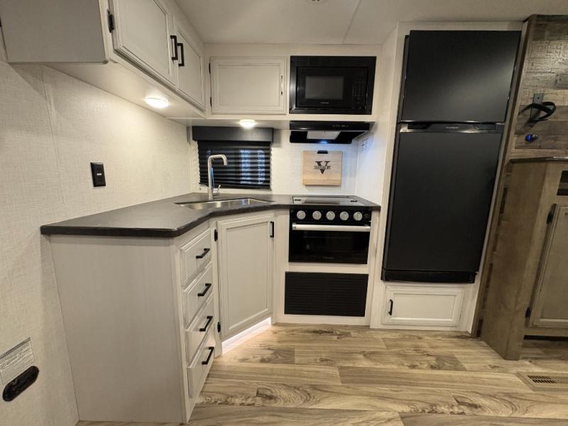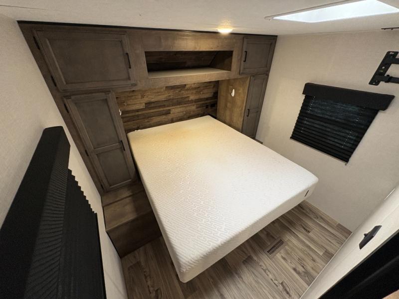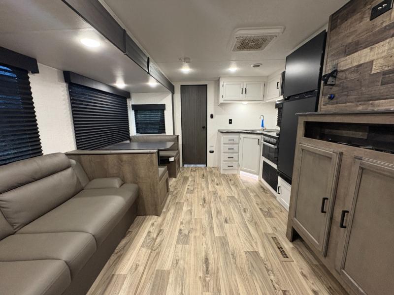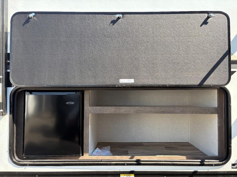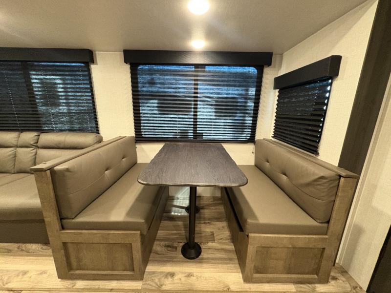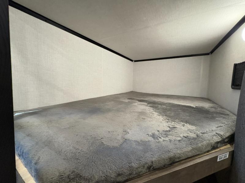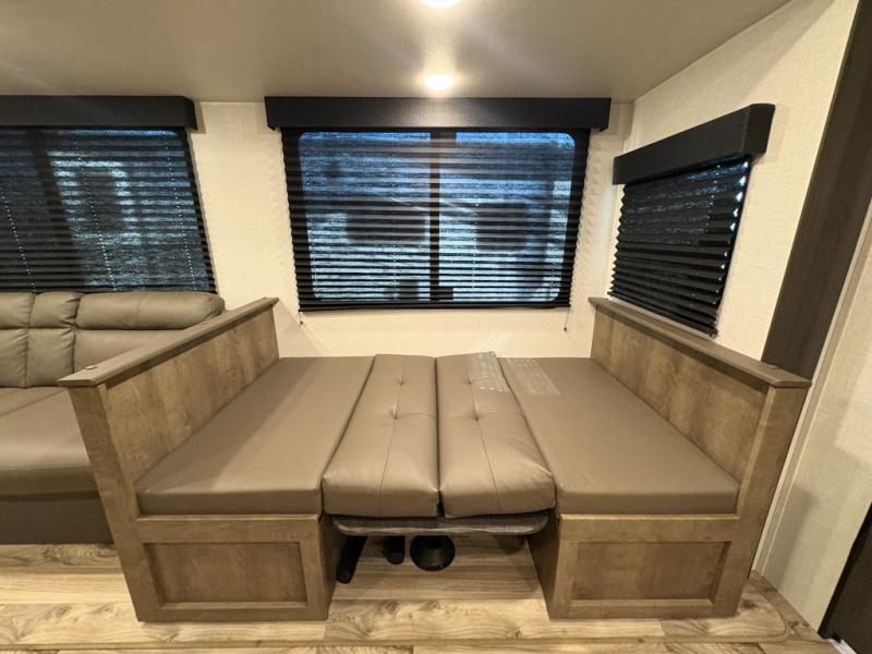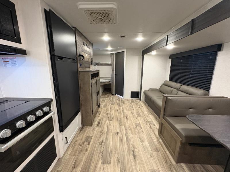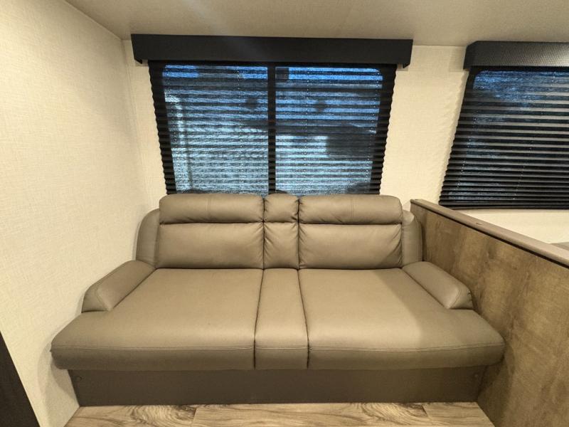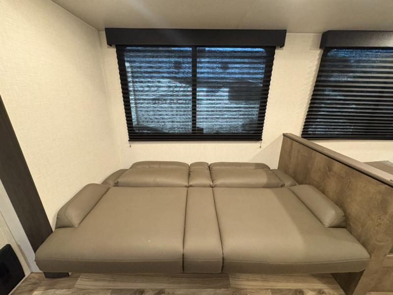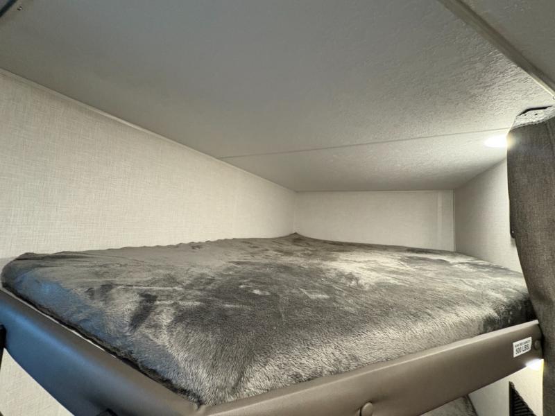 How does double-size bunks and an outdoor refrigerator sound in your next RV? You'll enjoy those features and more; come take a look! The large slide out provides your crew with ample space to relax on the 70" sofa or booth dinette, and the full bath will let everyone freshen up after a day of hiking. Head to the full kitchen to prepare lunch on the Furrion oven with a three burner cooktop, and there is a 10 cu. ft. 12V refrigerator for perishables. You will also love the walk-in pantry with coat hooks for added storage space. The Sleep Tight queen bed in the front private bedroom will have feeling right at home. Head outdoors to enjoy the 20' awning and outdoor refrigerator, or grab your fishing poles from the pass-through storage and head to the lake!