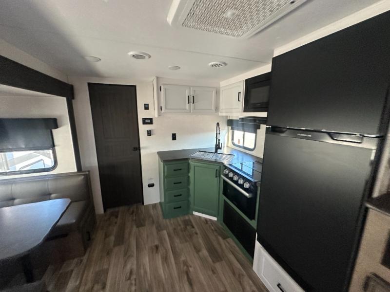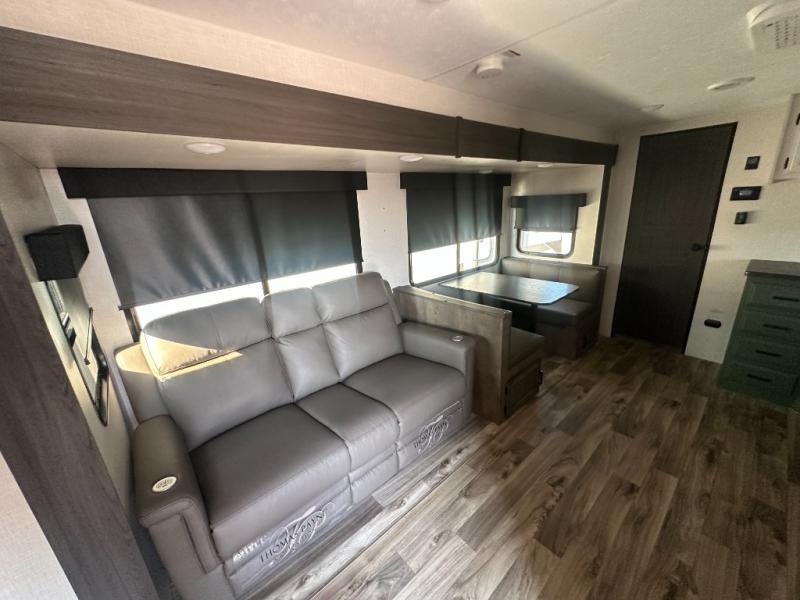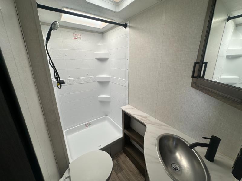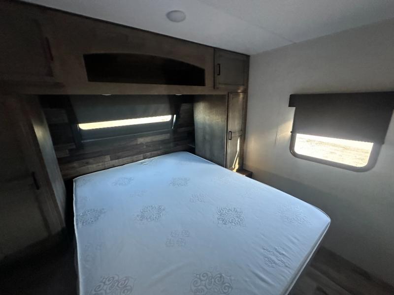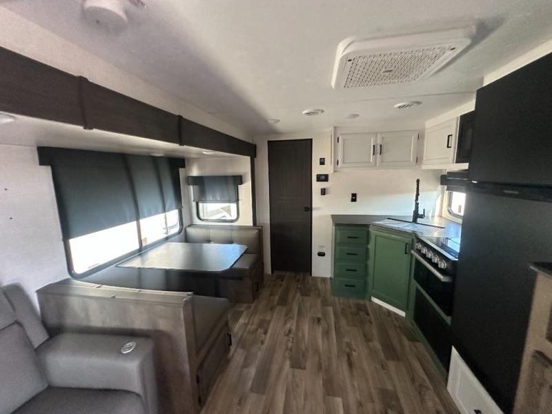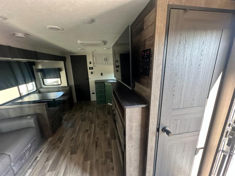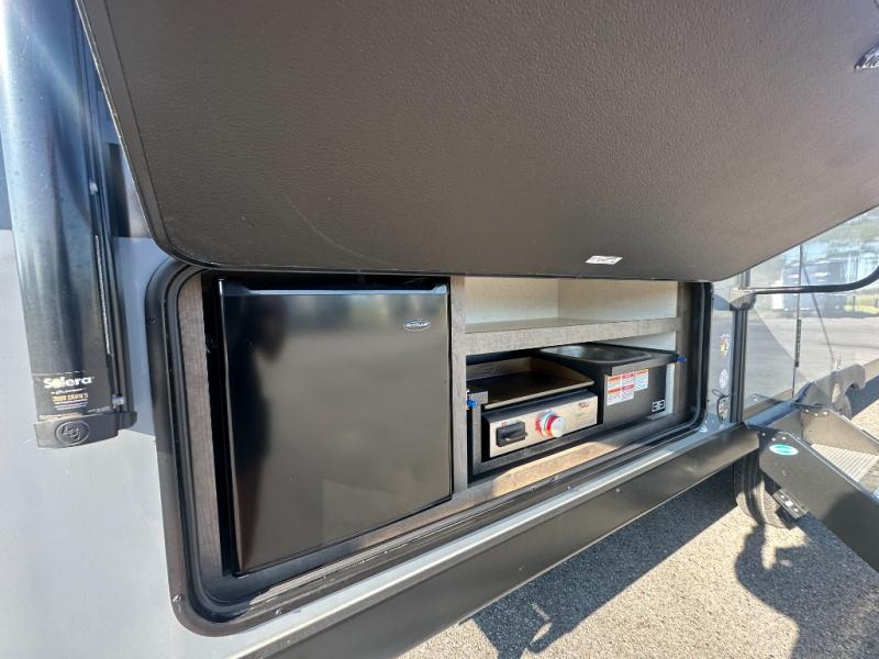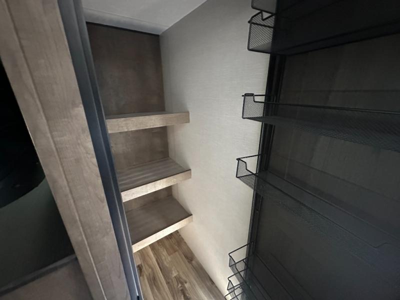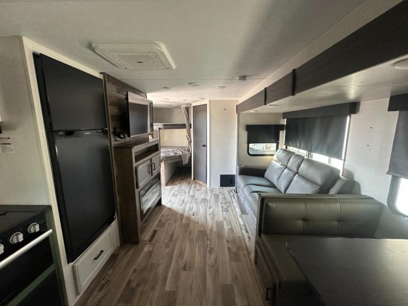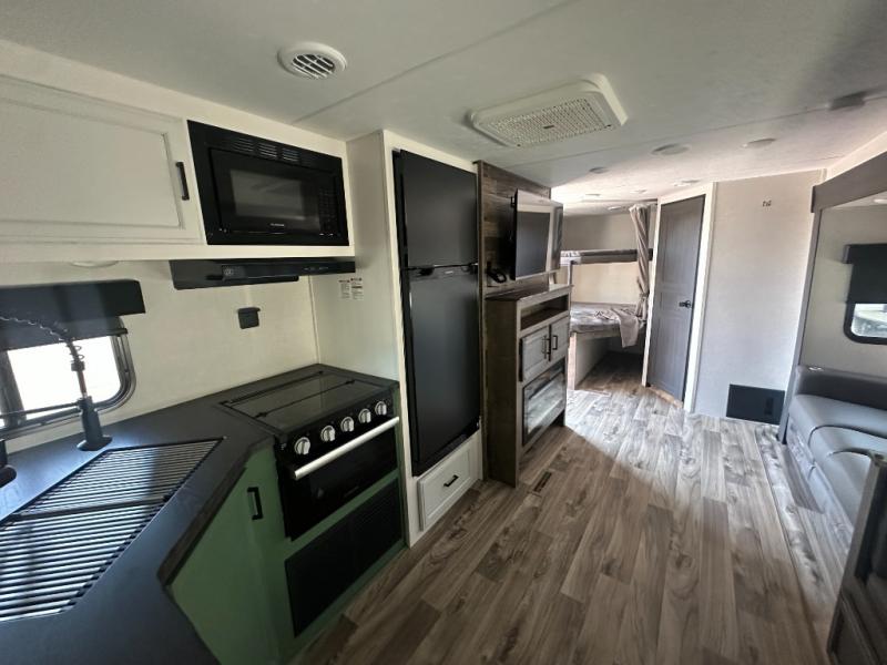 The whole family will have a fun time camping in this travel trailer! You will appreciate having your own space with the front private bedroom that has a sleep tight queen bed to lay your head on at night, and wardrobes on either side to hang your clothes. The kids can sleep on the set of 51" x 75" double bed bunks and can even invite a friend or two to tag along and sleep on either the 70" sofa or the 42" booth dinette once they are converted. Everyone can freshen up in the rear corner bathroom featuring a 30" x 36" shower. Behind the entertainment center is a walk-in pantry with coat hooks so you can store your jacket and groceries. The chef will enjoy cooking at the outside campfire café on the griddle, plus there is a refrigerator, and a sink for cleaning up!