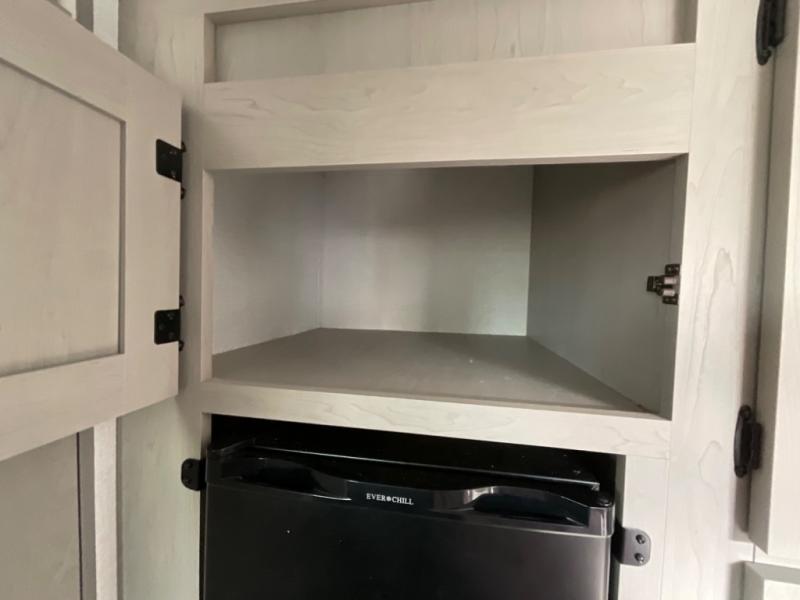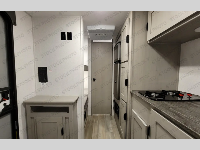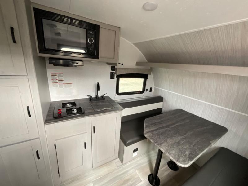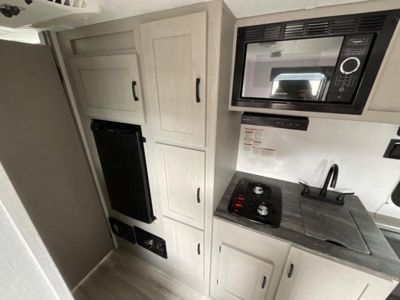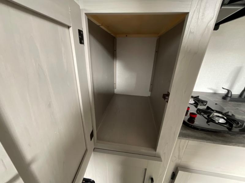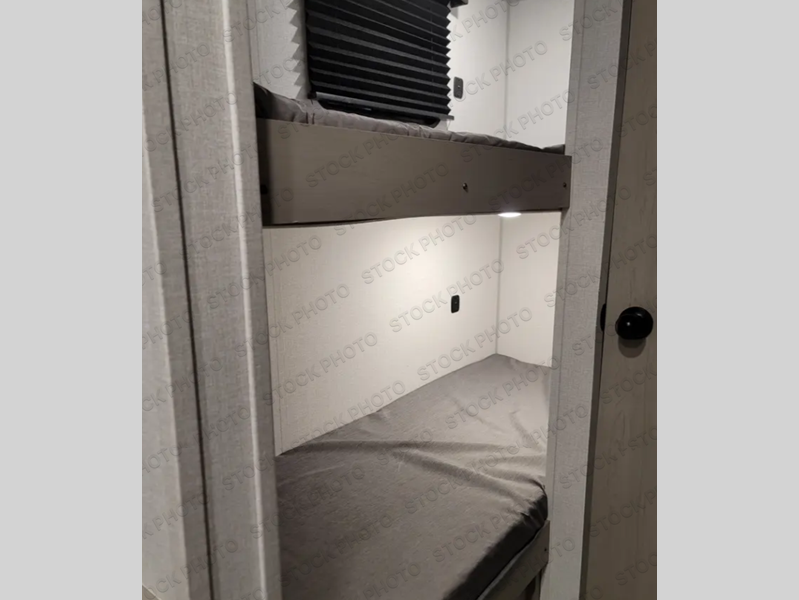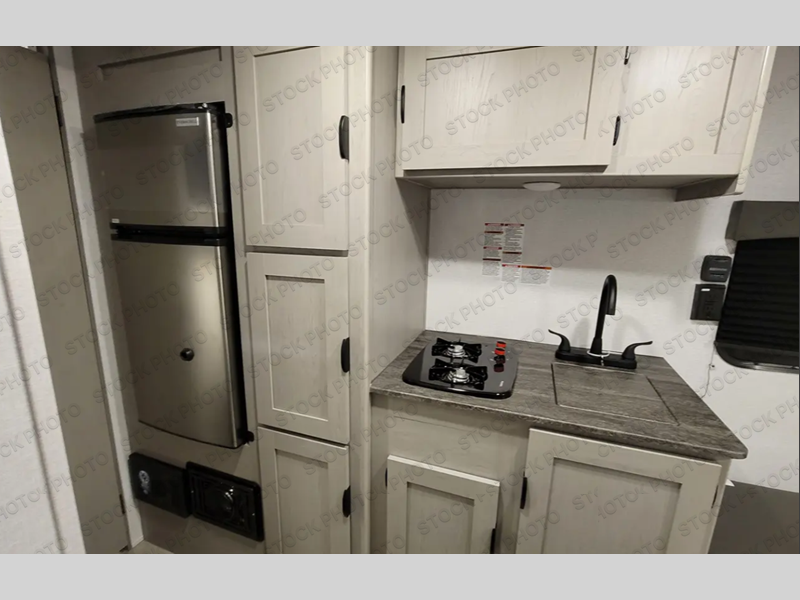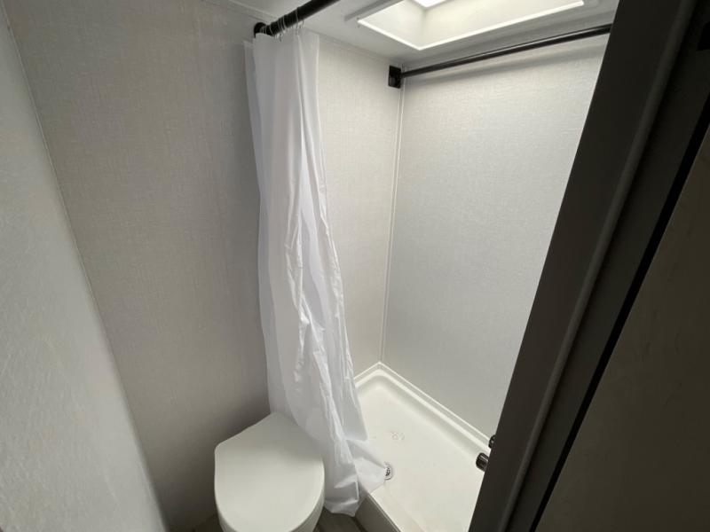 The perfect bunk model for your family or group of four. Twin bunks in the rear corner provide sleeping for the kids, and two can sleep on the front both dinette once converted to a queen bed at night. There is a two burner cooktop and single sink for inside meals, with plenty of storage cabinets both above the kitchen area and along the roadside wall. This is where you will also find a refrigerator for your perishables. The rear corner bath includes a private shower and toilet. You will love the skylight over the shower to provide more headroom and natural lighting inside.