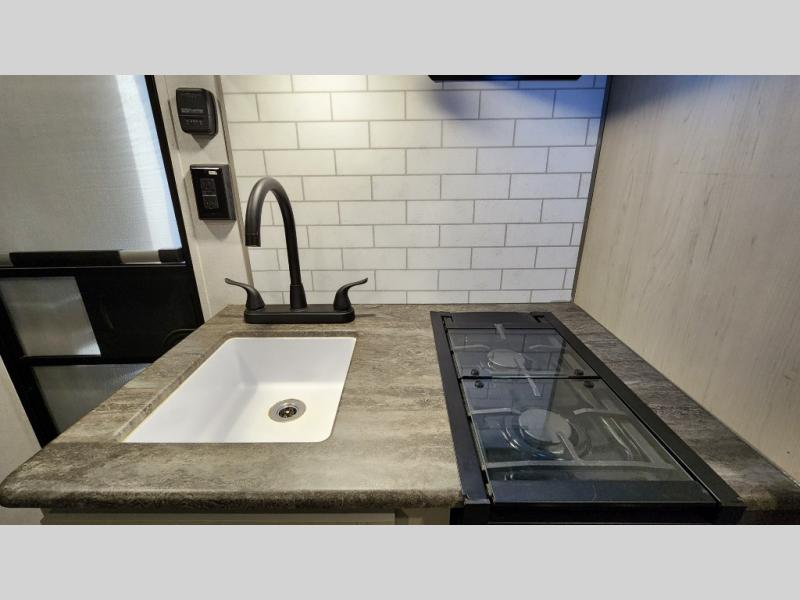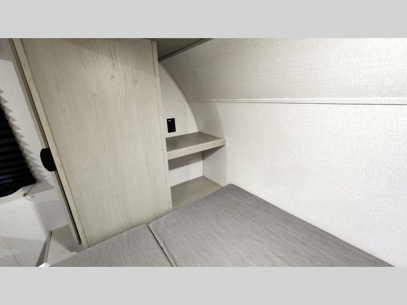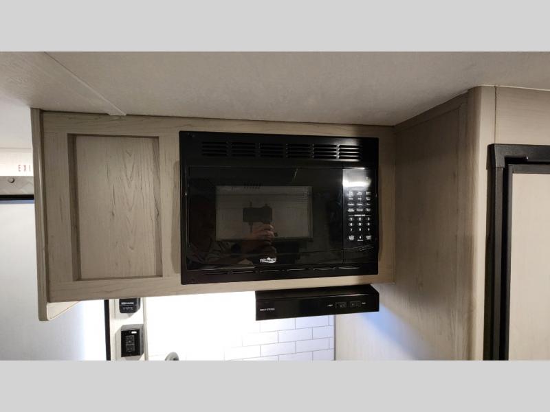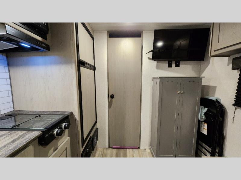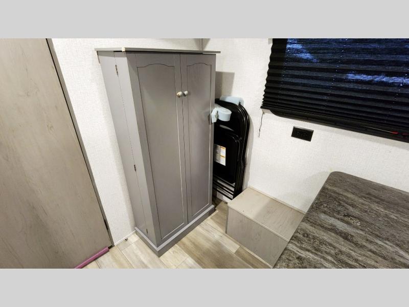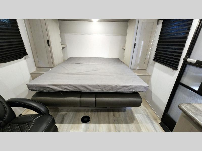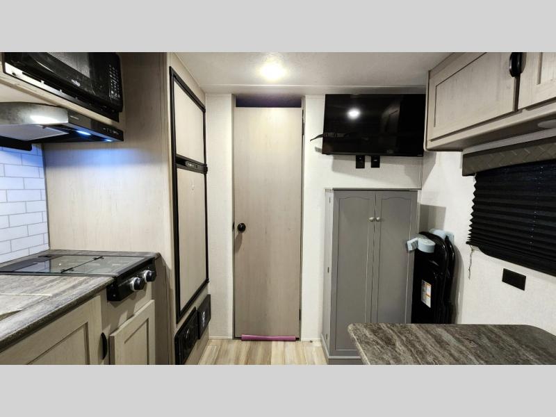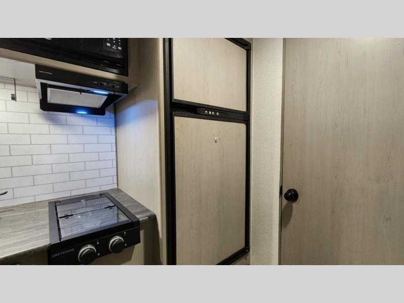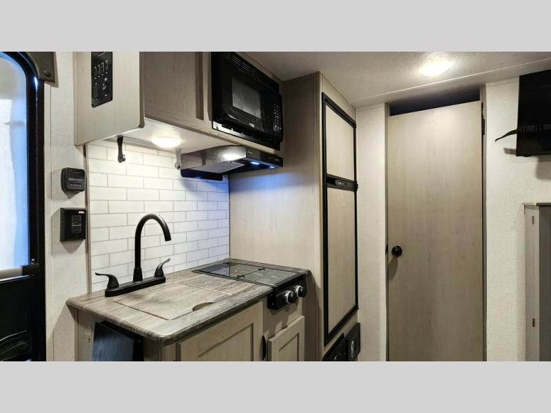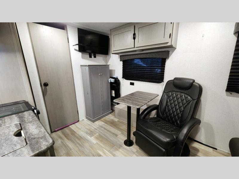 Take this versatile couple's travel trailer to your favorite destinations! It features a front jackknife sofa "Murphy Bed" for you to have ample seating during the day and at night a comfy bed. There are also two wardrobes with a private shelf on each end and an overhead shelf above for your things. There is additional seating with two recliner chairs including a table between opposite the kitchen area. This space also features overhead storage. The full rear bath offers a 24" x 36" shower, sink with medicine cabinet and linen storage as well. You can easily cook simple camp meals using the two burner cooktop or the microwave. On the exterior, a front pass-through storage compartment is available for all of your outdoor gear!