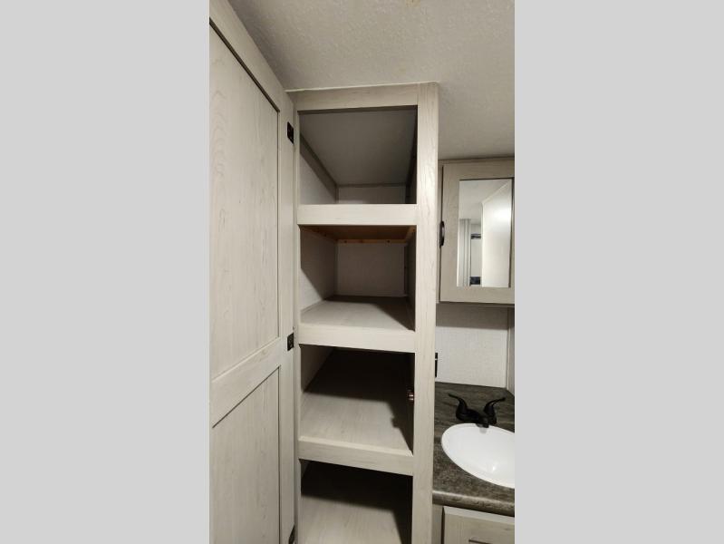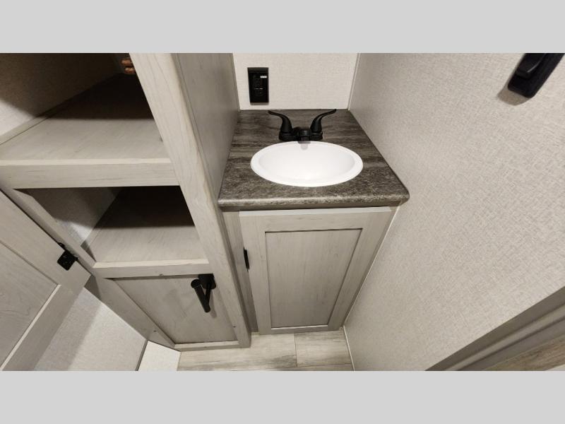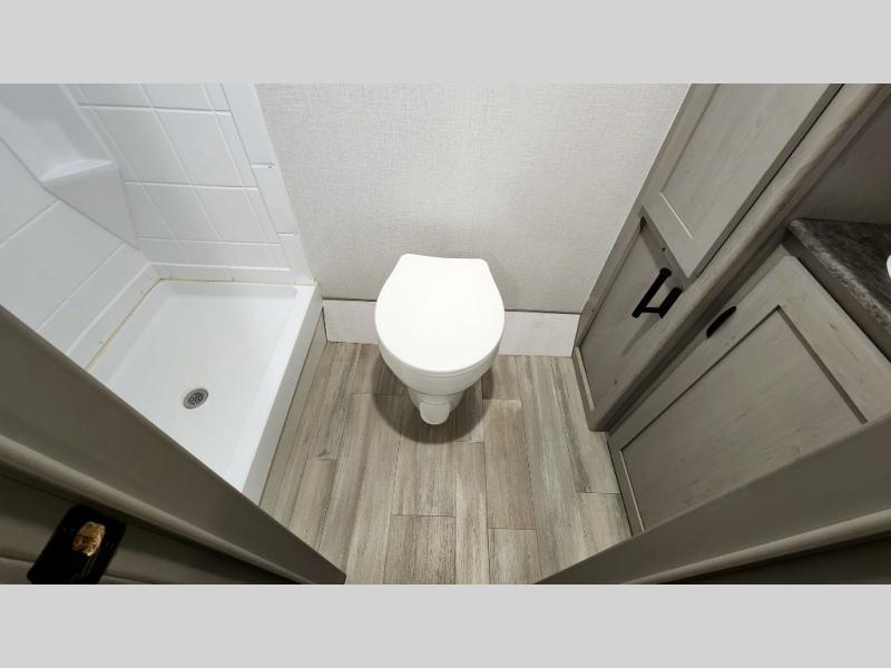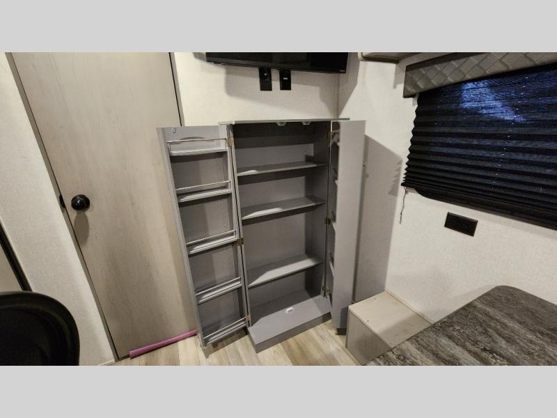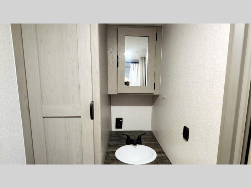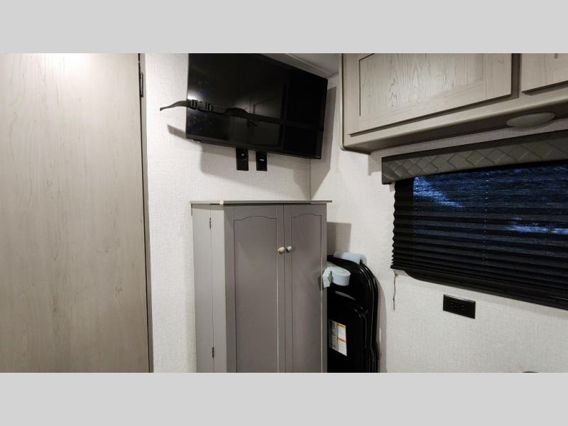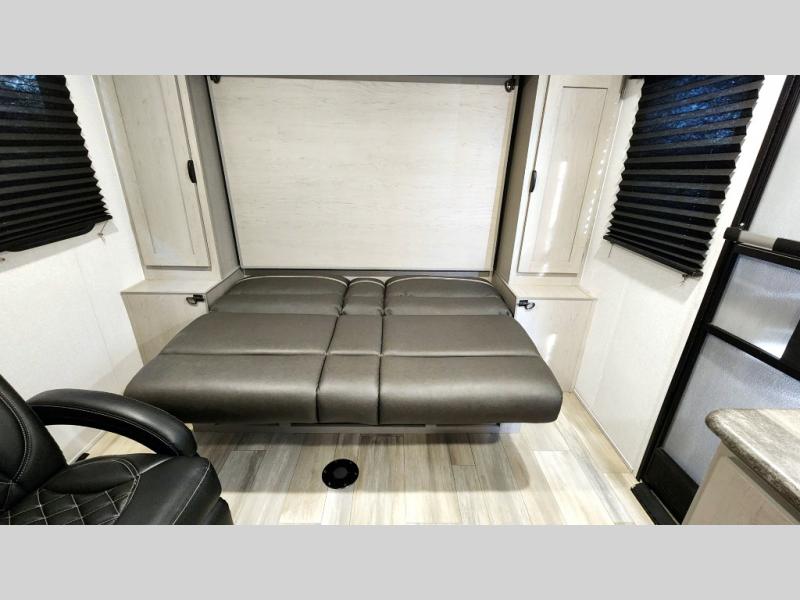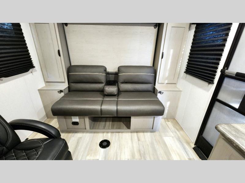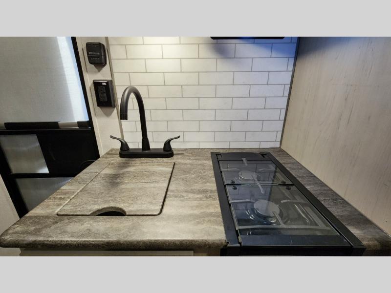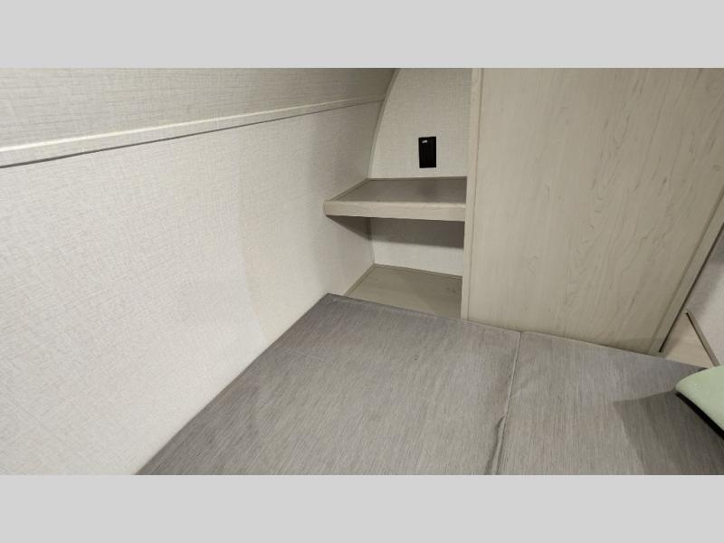 Take this versatile couple's travel trailer to your favorite destinations! It features a front jackknife sofa "Murphy Bed" for you to have ample seating during the day and at night a comfy bed. There are also two wardrobes with a private shelf on each end and an overhead shelf above for your things. There is additional seating with two recliner chairs including a table between opposite the kitchen area. This space also features overhead storage. The full rear bath offers a 24" x 36" shower, sink with medicine cabinet and linen storage as well. You can easily cook simple camp meals using the two burner cooktop or the microwave. On the exterior, a front pass-through storage compartment is available for all of your outdoor gear!