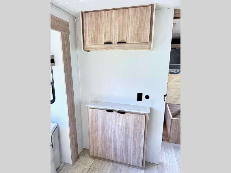 Enjoy your Access in the great outdoors! This unit features a large slide for added walking around space inside. There is sleeping for two to six depending on size and furniture choices starting with the front private bedroom featuring a space saving sliding door. You can also sleep two on the optional tri-fold sofa within the slide, and the dinette opposite can be converted for one or two little ones. You will find ample storage throughout in overhead storage cabinets, under bed storage and wardrobes, plus more. The kitchen appliances are also within the large slide, plus you will find a nice size sink in the rear roadside corner with storage both above and below. A convenient rear corner bathroom allows you to skip the use of the camp facilities and enjoy cleaning up in the privacy of your own unit. Here you will find a 30" x 36" shower, porcelain toilet and a vanity with sink and corner medicine cabinet. You will also appreciate the exterior storage door within the slide and there is also convenient pass-through storage for your larger camp items to be neatly tucked away when not in use.