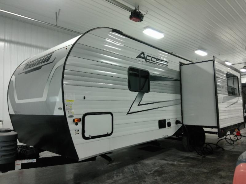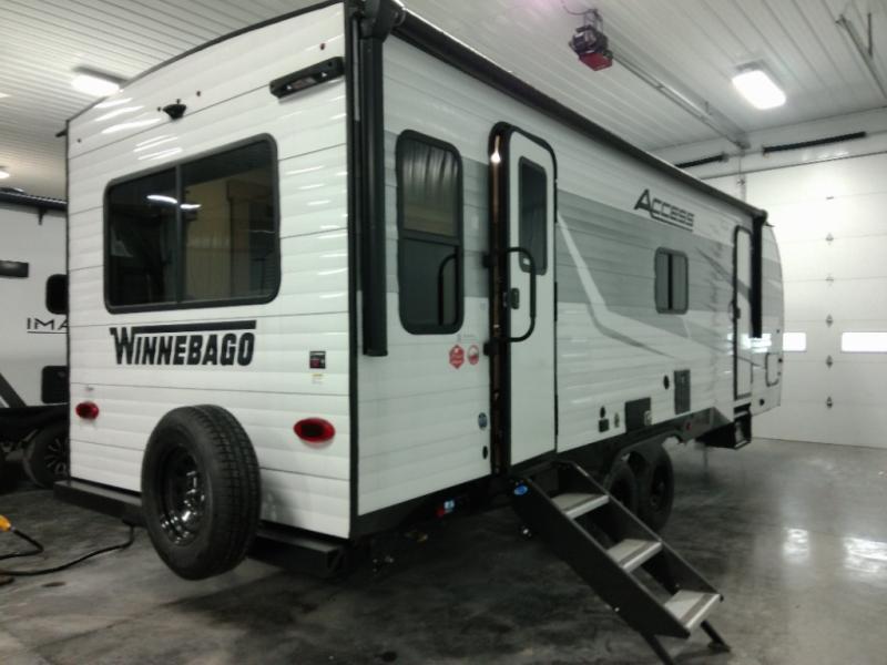 With any Winnebago Access travel trailer you will find thoughtful, clean, and contemporary designs filled with premium features that all have come to expect on any Winnebago towable. The powered stabilizer jacks make setting up camp easy with just the touch of a single button. You will appreciate the stylish exterior front profile and thicker sidewall metal for greater aerodynamics plus strength and durability. With a fully enclosed underbelly you can easily extend your camping season into the colder months, and the 12 volt tank pad heaters will keep you from having frozen pipes. On the inside, a porcelain toilet, larger skylights for more natural lighting, abundant storage, and spacious living areas making every camping trip more enjoyable. And, the 200 watt solar power reduces the need for shore power which makes it easy to go off-grid. Make your choice today and Access your next adventure!