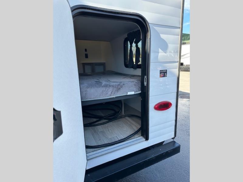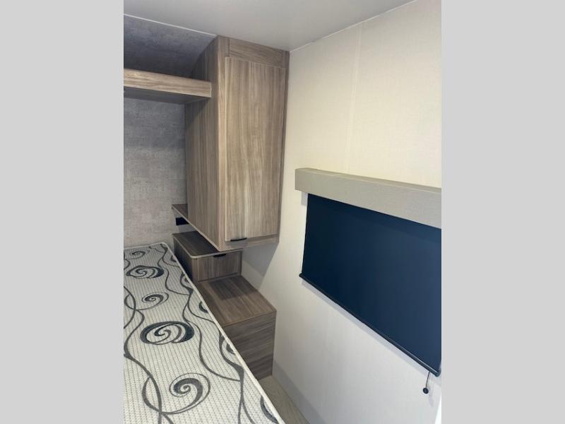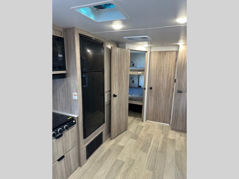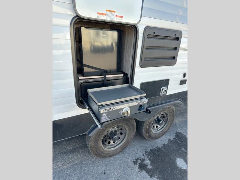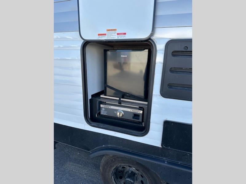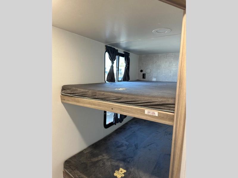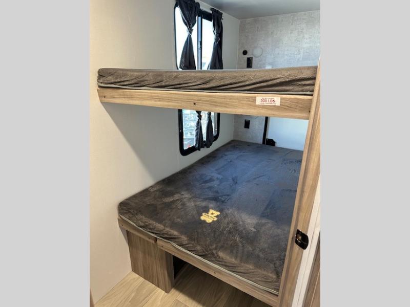 Your family of eight will enjoy camping in this Access camper. You will have the choice of cooking both inside and out with the accessible outdoor kitchen featuring a pull-out griddle and 1.6 cu. ft. refrigerator for drinks. On the inside, a three burner cooktop, pantry for dry goods, and a 10 cu. ft. refrigerator make creating meals and snacks easy. For sleeping, your family will find comfort in a set of 44" x 74" bunks located in a private bunk room with storage cubbies for your belongings, a booth dinette that can also be transformed into sleeping for one or two at night depending on size, plus the front private bedroom which features a queen bed. Besides the dinette for seating, you also have theater seating for two inside. Add an optional TV for movie watching when the weather doesn't cooperate outdoors for fun activities. On the exterior, you will find a convenient Pack-N-Play door beneath the bunks, plus an exterior pass through storage compartment up front for lawn chairs, outdoor games, and so much more.