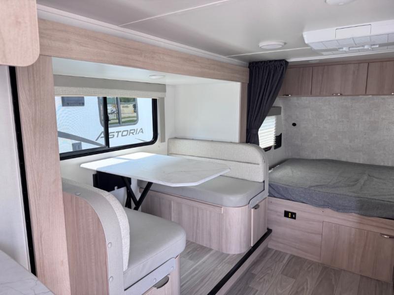 Don't pass your chance to camp comfortably with your spouse in this travel trailer! Up front there is a 54" x 74" full-size bed for a great night's rest. Scramble up some eggs with the three burner cooktop and grab a cup of orange juice from the 10.3 cu. ft. refrigerator then head to the 44" x 72" booth dinette slide to enjoy your meal. The dinette can also transforms into an extra sleeping space if you want a tag along guest. Everyone can freshen up in the rear corner bathroom and watch their favorite movies on the Smart TV!