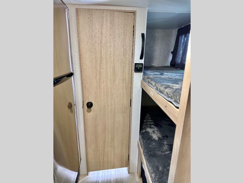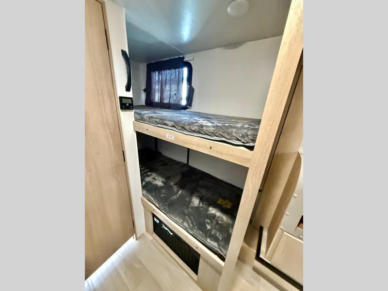 Get ready for a fun family weekend in the great outdoors with this trailer only steps away to enjoy inside comforts! The cook will love having everything to make warm meals, and can easily store leftovers in the 10.3 cu. ft. 12V refrigerator, plus the flip-up counter gives them more space to prep or dry the dishes. The front 54" x 74" full bed has a divider curtain for privacy at night and the rear corner 28" x 72" bunk beds are conveniently next to the private toilet and shower room. The booth dinette slide gives you a place to dine as well as sleep one more person, plus you will love the extra floor space that it provides. You might like to choose the EZ Glide Sofa Sleeper and table option in its place, the option is yours!