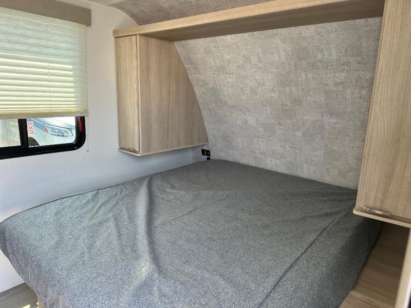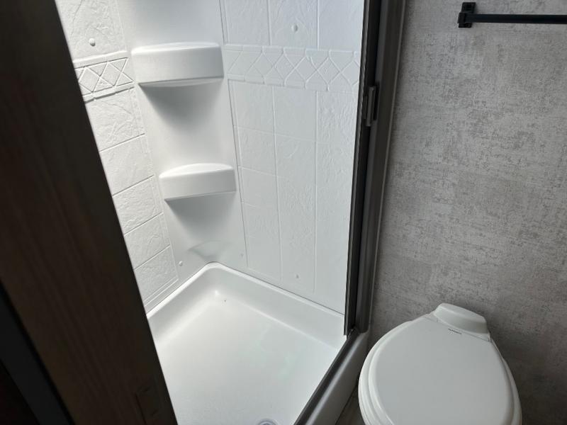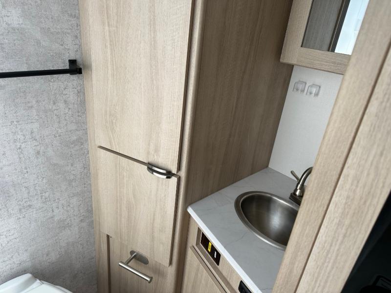 Pack your bags and head to the campground with this travel trailer! You will love all that it has to offer from the full rear bathroom to the front 60" x 74" RV queen-size bed with dual wardrobes on either side of the bed. The 44" x 72" booth dinette slide is not only a great place to enjoy your meals at or play card games, but it can also be transformed into an extra sleeping space if you want to bring along a guest. When you don't feel like making dinner, you can easily pop in some leftovers or a bag of popcorn into the convection microwave and relax while you watch a movie on the Smart TV!