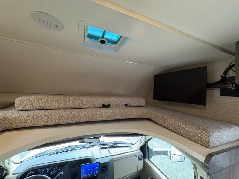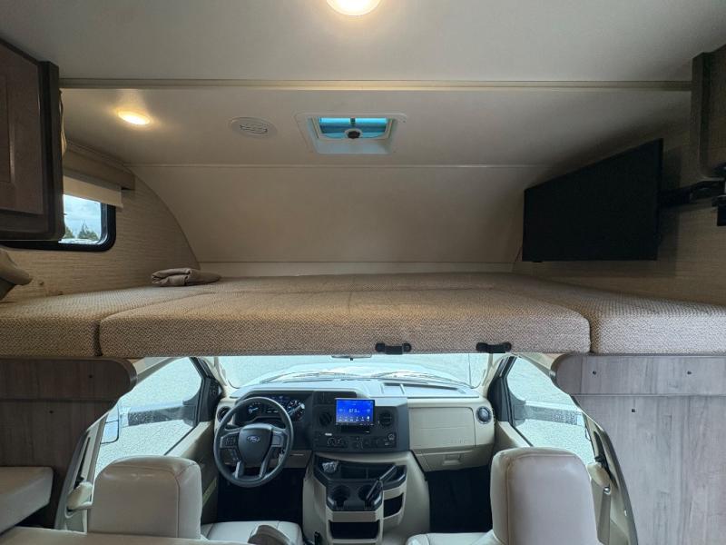 Start living your best travel life in this motorhome! After a long day of traveling, enjoy a good night's rest on the 60" x 75" bed in the rear corner bedroom which also has a nightstand, a wardrobe to keep your clothes looking nice, and a TV location for your entertainment. If you have others who wish to join you then they can sleep on the 57" x 95" bunk over cab with a TV location or even on the 45" x 74" U-shaped dinette once converted. Don't worry about eating fast food while you travel either thanks to the three burner range with glass cover and oven and the two way double door 6.3 cu. ft. refrigerator/freezer with woodgrain paneling. Freshen up after a long day of traveling in the rear corner bathroom with the 23" x 34" shower with a retractable shower door and skylight above for added headroom and natural lighting! This model is shown with the Ford E350 specs. Ford E450 specs available; see dealer for more details.