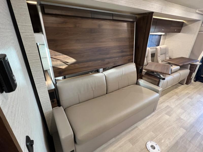 This family-friendly coach offers sleeping space for six when you utilize the Murphy Bed, the cabover bunk and the U-shaped dinette with footrests as sleeping space! If you're not needing the extra sleeping space, just choose the optional theater seating in place of the dinette. During the day, the sofa easily replaces the Murphy bed so you can dine at the pedestal table that you grabbed from the front area's location. The heated power control cab seats include armrests, adjustable lumbar support, headrest, recline, slide and manual swivel functions giving you ultimate comfort on the road and while at your RV spot. The cook will love having a galley kitchen with a microwave/convection oven and 12V compressor-driven refrigerator/freezer to keep everyone fed.