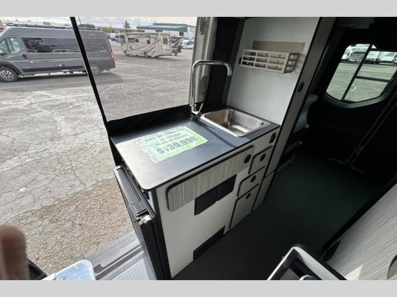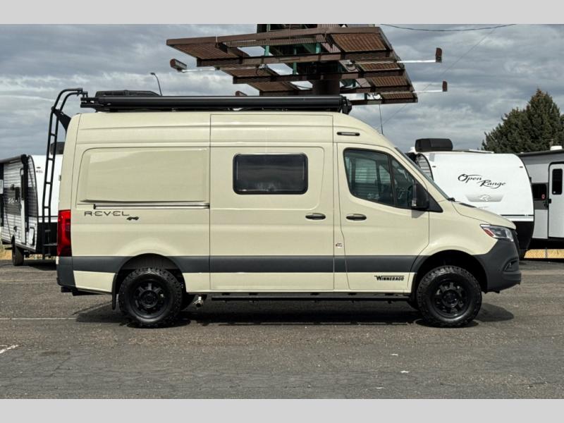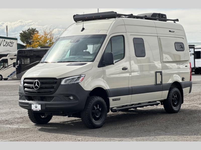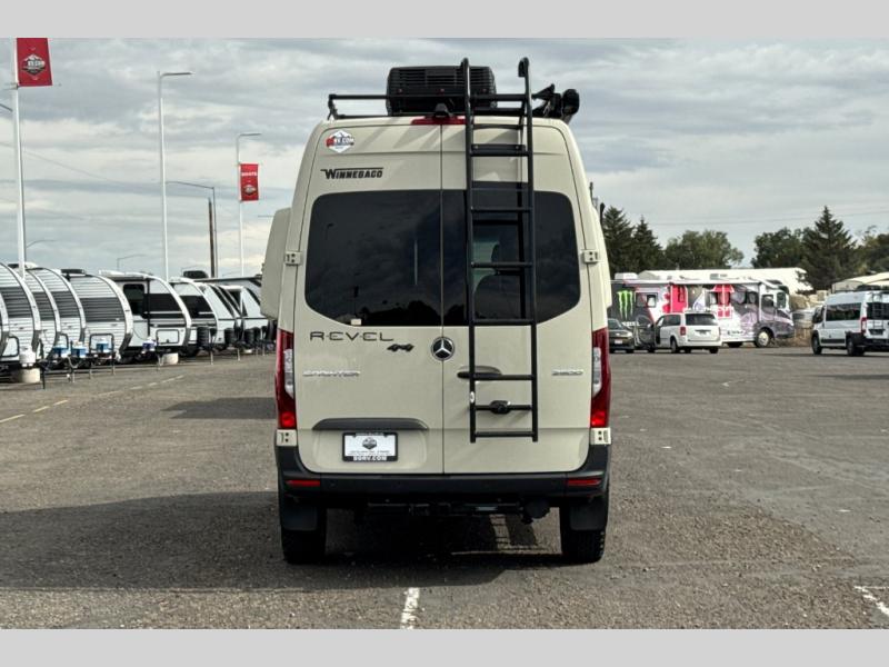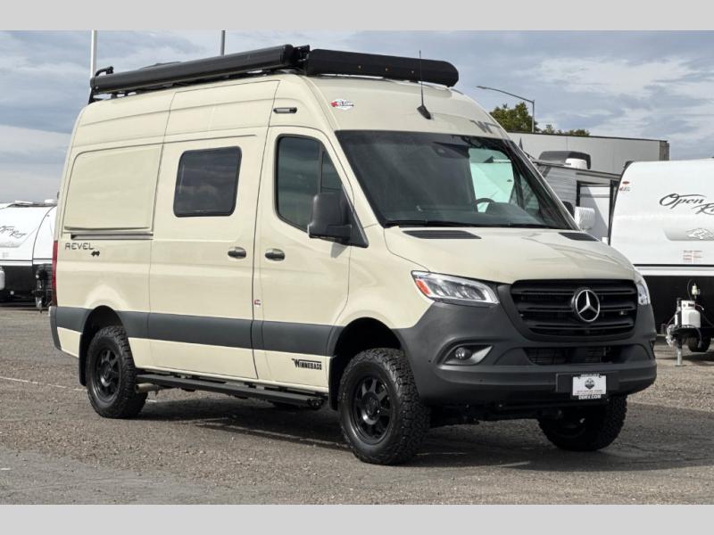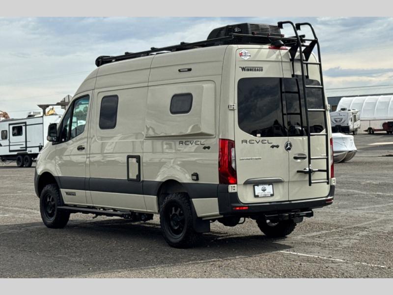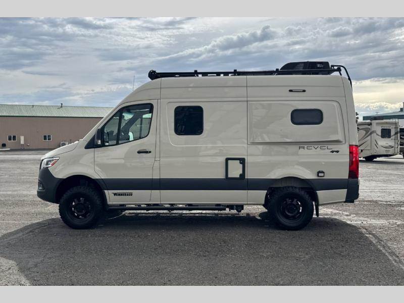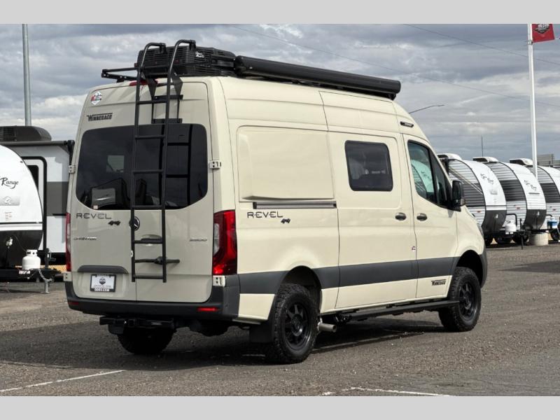 The Revel Class B diesel motorhome allows you to venture off-road thanks to the AWD Sprinter chassis with 2.0L high-output turbo-diesel 4-cylinder under the hood. The Winnebago Power MAX system (8.4kWh Lithionics lithium-ion battery with dual alternator charging capability) and Power Hub Pro which is an exclusive 5-in1 system that delivers off-grid power like nothing before allowing you to stay off-grid for up to 7 days . The interior provides a comfortable and relaxing space featuring modern decor including an updated galley with compression-latch cabinets, a new wall-mounted table, a semi-private wet bath, plus a power lift bed with WinnSleep® mattress technology, and the gear garage below the bed features (6) L-track bases for secure and flexible storage, plus cabinet storage and more. For the freedom to explore in any season, start treating roads like suggestions, and choose this Revel to get you anywhere you dream to go today!