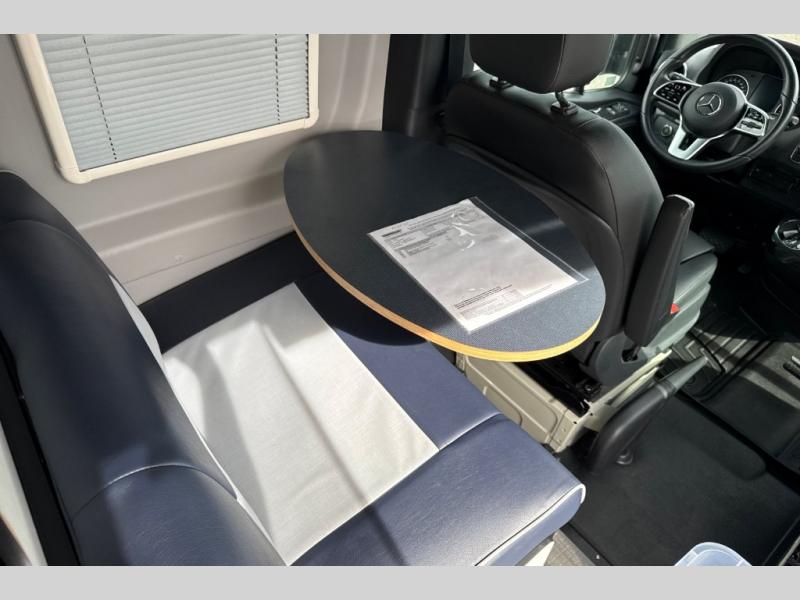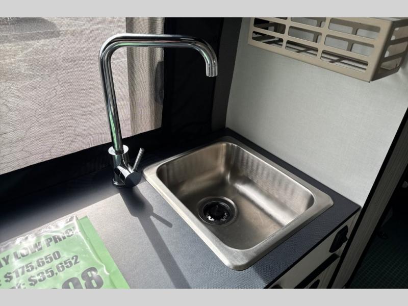 Looking for adventure yet not sure which road you'll take? This camper van offers the outdoor enthusiast a way to venture the unknown. Once at your destination, you can easily set up the interior including a power lift bed in the rear. The cab seats swivel around and there is a bench seat with adjustable table for easy dining opposite. There is even a fold-down outside table to dine outdoors if you want. You will find storage throughout including in the gear garage below the bed where you can store your hiking sticks and backpacks. The cook will have a portable single induction range top, a stainless steel sink, and a counter extension for more prep space plus a refrigerator below the counter. There is also a wet bath to stay clean and refreshed!