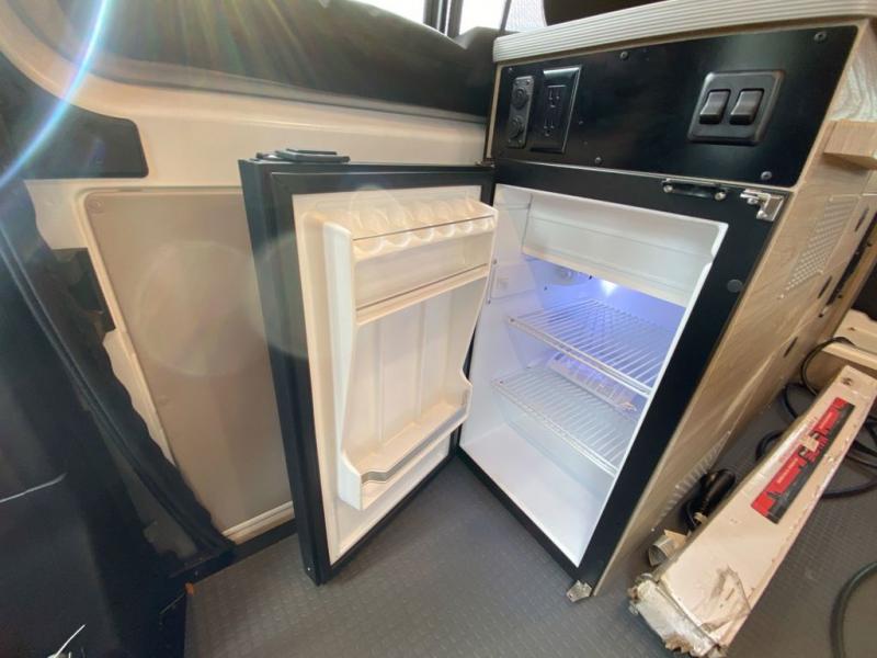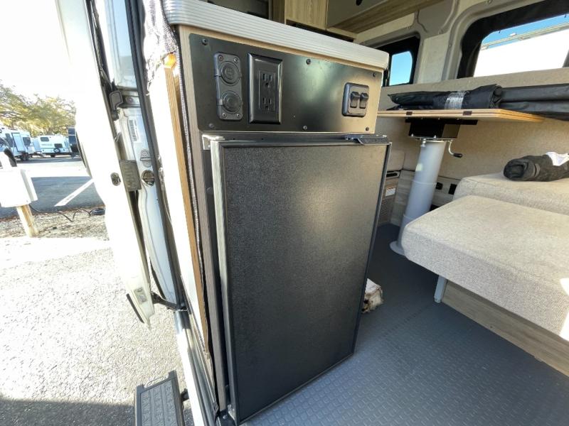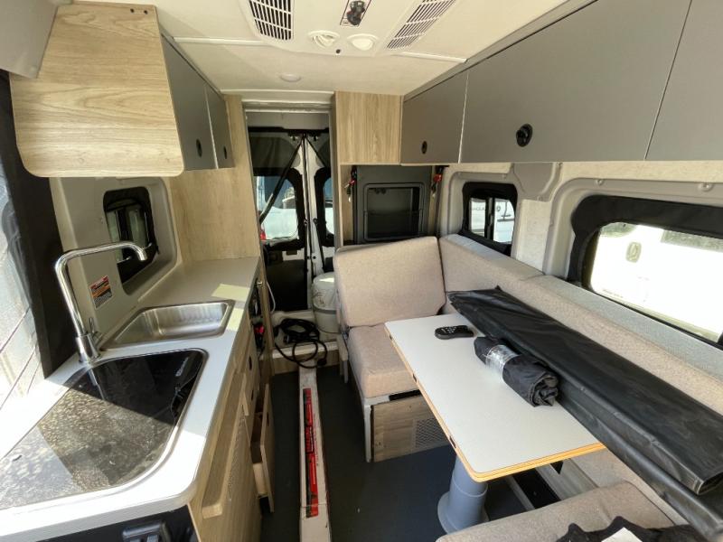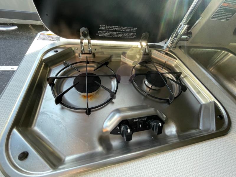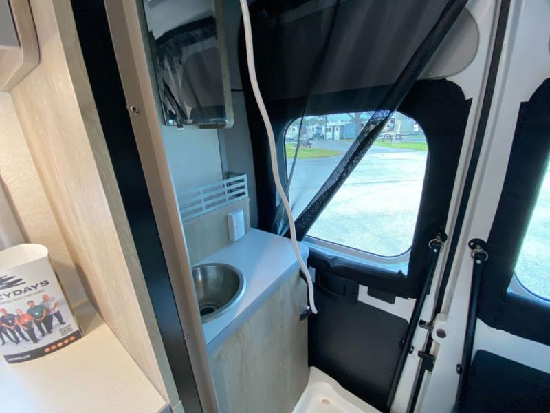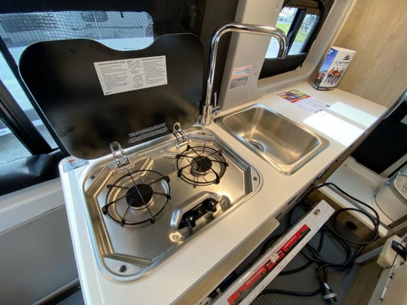 This camper van is perfect for independent travel or if you've got a camping partner to take along with you! The convertible dinette bed can transform into a twin-size bed for one or a double-size bed for two. The three seating modes include a belt mode, sofa mode, or lounge mode for even more comfort. You will find all you need in the kitchen to prepare meals each day, including a two burner range with a glass cover for more counter space and a 3.0 cu. ft. 12V single door compressor-driven refrigerator/freezer for food storage. There is a shower with a wall surround in the rear wet bath, along with a removable cassette toilet, a medicine cabinet with a mirror, and a wardrobe cabinet with added storage. This space could also be used as a mudroom after a day of exploring, or utilize it for storage!