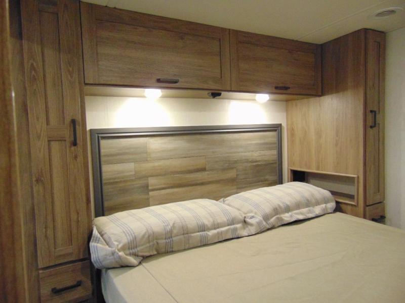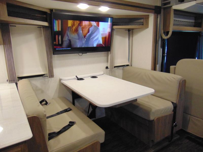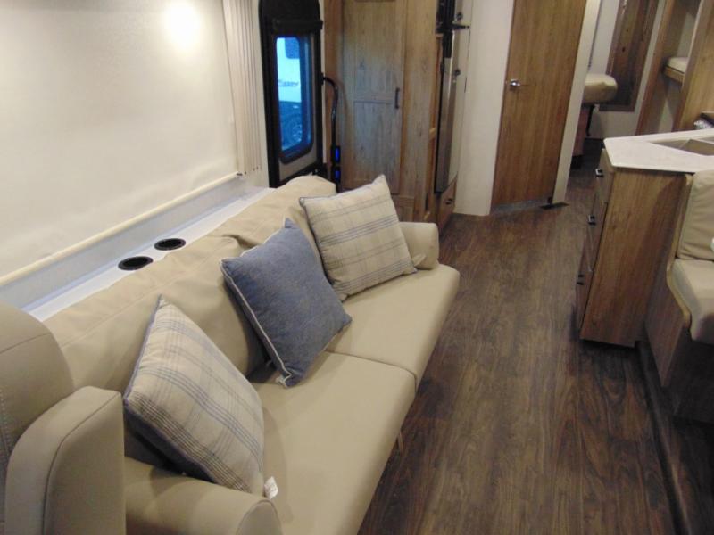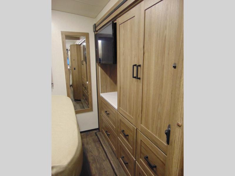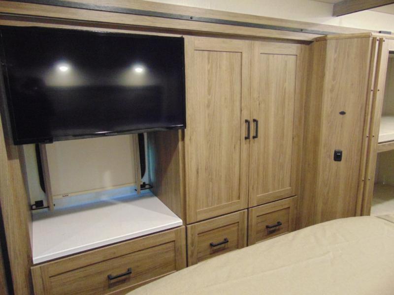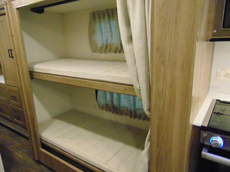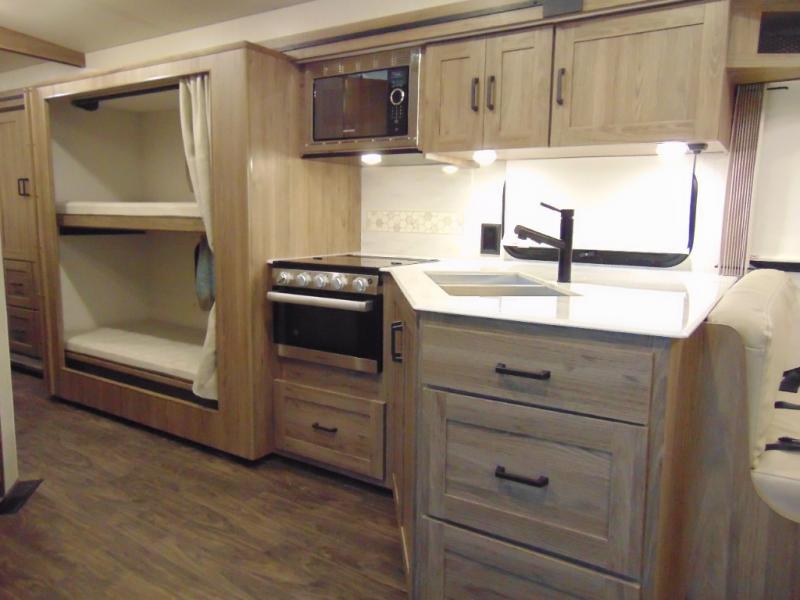 There are bunk beds within the full-wall slide for kids or guests, and the spacious dual entry bath is right across the hall for convenience. The rear bedroom includes a sliding door for privacy, a wardrobe to hang your clothes, plus additional storage and space to add an optional bedroom TV. You can make all your meals with the appliances provided, and dine at the dinette with a Hi-Lo table. The furniture also doubles as extra sleeping space, and you might like to add the optional StudioLoft bed.