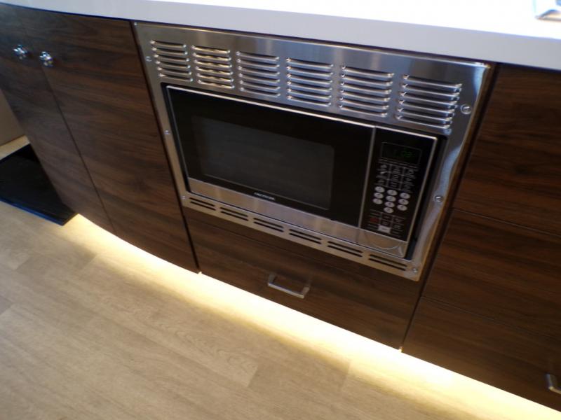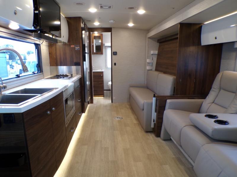A couple or family will enjoy the look of the interior each time they take this View Class C diesel motorhome on the road. With the curved cabinets, the lighted soft-close galley drawers, and the sprung-cushion dinette and sofa seats, there will surely be a favorite feature for everyone. You will be able to easily set up the queen Murphy+ bed when it's time for bedtime while the kids sleep on the bunk above the cab or the U-shaped dinette. You might like to add the theater seating option with swivel tables if you don't need that extra sleeping space. Everyone can get cleaned up in the full rear bathroom that has a space-saving sliding door before making meals with full kitchen amenities including a convection microwave/oven.