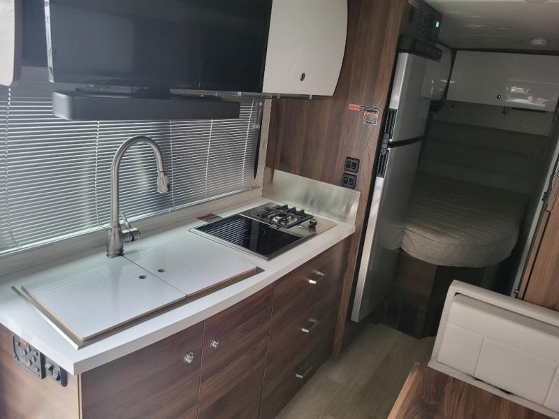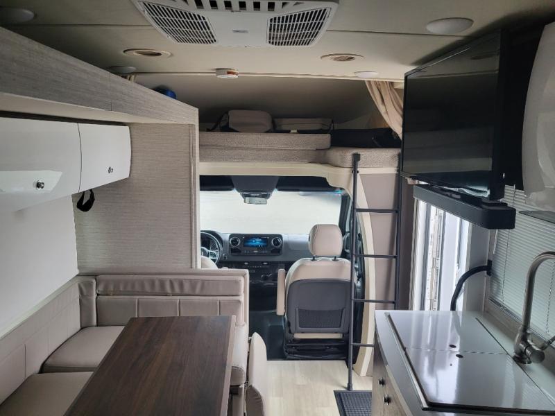 Your family will enjoy seeing the views riding down the road in this View Class C diesel motorhome. The kids can play games at the U-shaped dinette that has three seatbelts, and once at your destination, the dinette footrests may come in handy. The driver and passenger will enjoy the heated, power cab seats that can swivel for more seating. Everyone will enjoy the look and convenience of the curved cabinets, the lighted soft-close galley drawers, and the sprung-cushion dinette seats. The cross-coach storage holds larger items, and the above-bed Anything Keeper storage stows things away such as your cellphone. You might like to add the theater seating option with swivel tables in place of the U-shaped dinette if you don't need that extra sleeping space. The cook will appreciate the kitchen appliances to make meals, and the bathroom has the bath sink just outside the door.