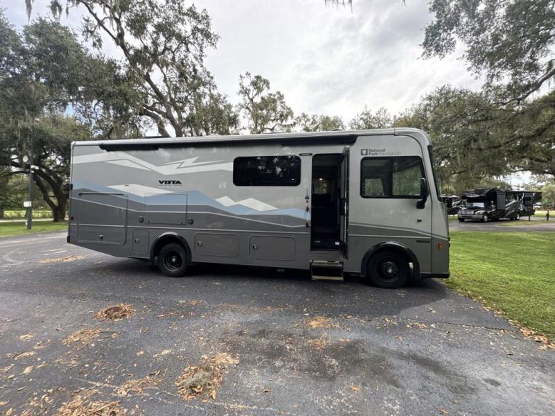 The Winnebago Vista National Park Foundation Limited Edition Class A gas motorhome is designed to fit almost any campsite! You can go off the grid with the upgraded solar energy system which has a standard 320 amp hour lithium-ion battery, a charge controller, and three solar panels for three times the unplugged power. The Batwing awning overlaps the standard armless patio awning for two sides of seamless wraparound protection to enhance your outdoor living. Speaking of enhanced outdoor living, the exterior kitchen included in the Tailgate package comes with a refrigerator, a sink, and a quick connect LP hose for a portable stove or grill, plus more convenient accessories. The outdoors are brought inside through the frameless tinted windows and the beautiful Salinas oak cabinets. Come check it out today!