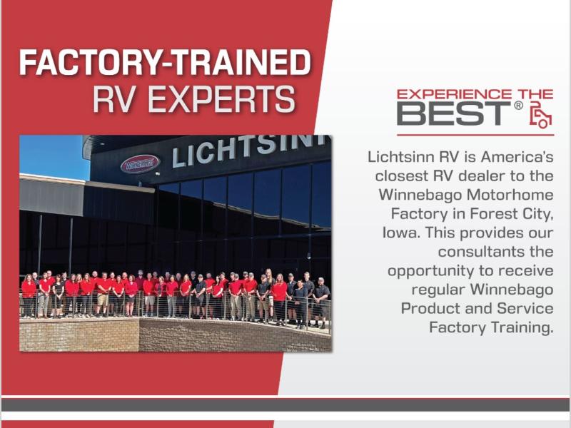 At Lichtsinn RV our website has full video walkarounds on each RV, making it easy for you to purchase. On our website you can go for a virtual test drive, purchase your RV over the phone or the internet, and then take delivery at our dealership, which is only 1 Mile from the Winnebago Motorhome Factory here in Forest City, Iowa!