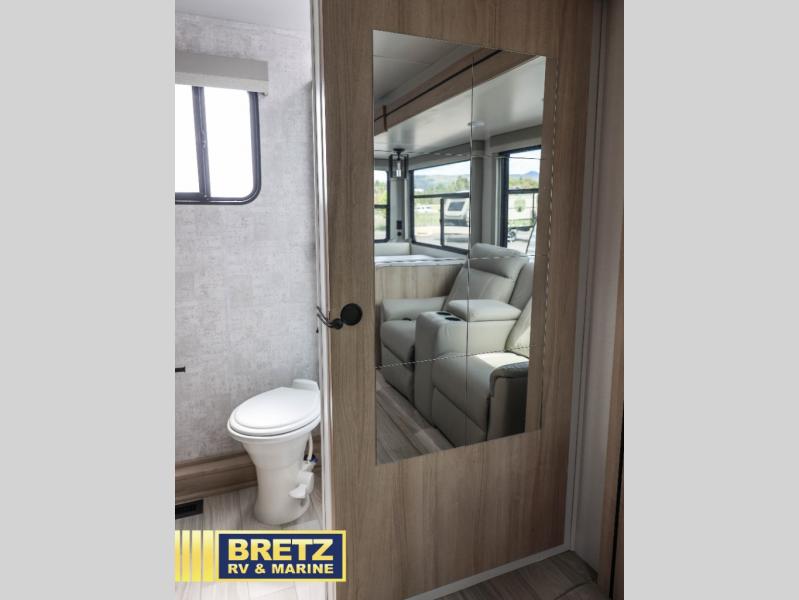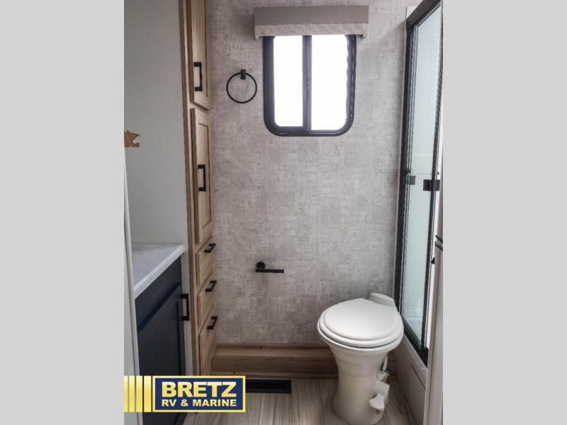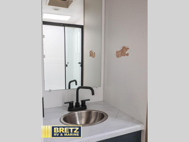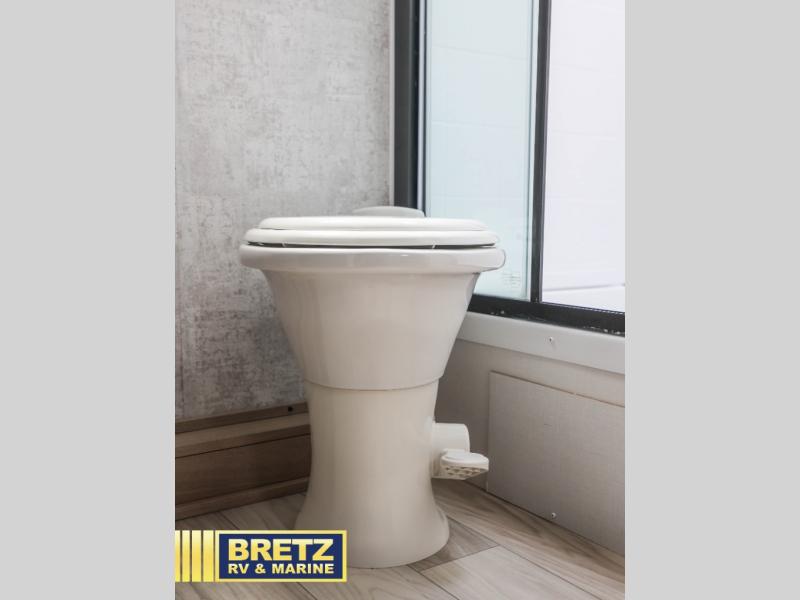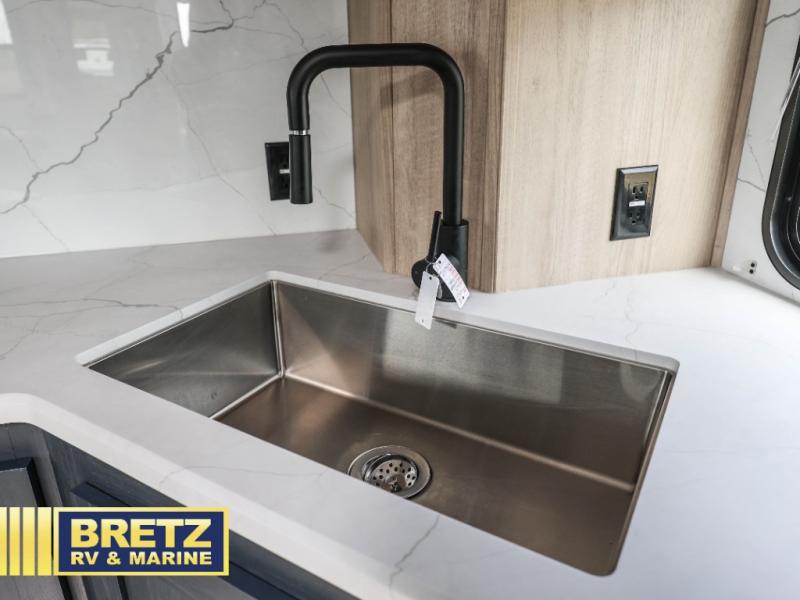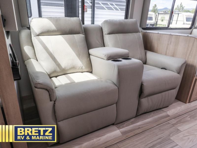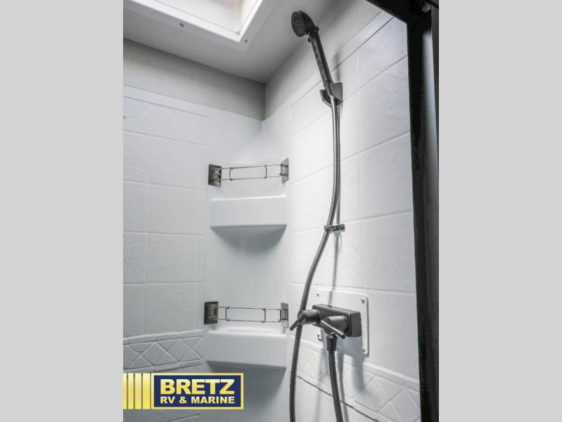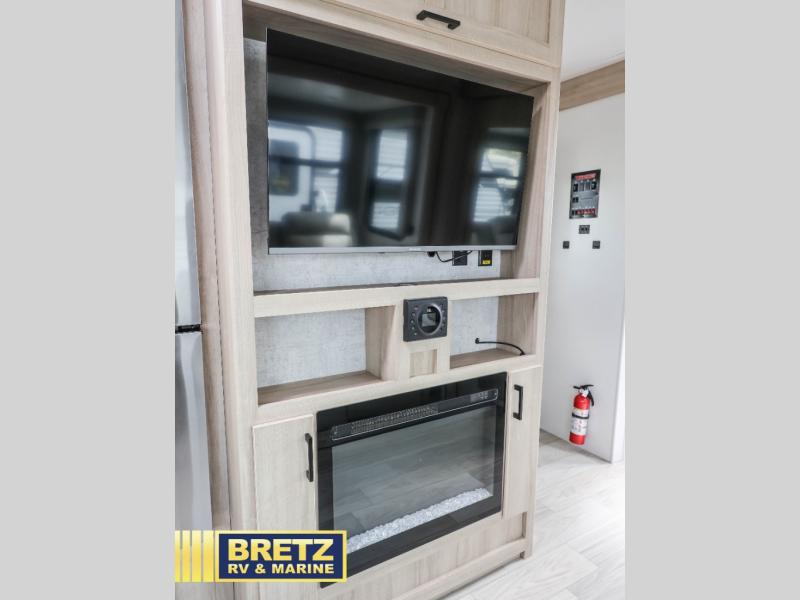 You camp because you love the outdoors, and you won't have to give up creature-comforts when you have this trailer at your campsite! The interior is spacious with dual opposing slide outs in the main living area that you can enjoy while you sit back on theater seating or at the free-standing table with chairs while watching the Smart TV opposite. A tri-fold sofa with end tables can be found along the back wall which will provide more seating and additional sleeping space. The cook will love the kitchen island, the hutch for dishes, and the appliances including a convection microwave and a large pantry. All will enjoy having a full bathroom with a large skylight and residential bath fixtures, and the private bedroom with its queen-size bed is going to provide a peaceful night's rest after a fun day of camping. You can even choose the optional king bed if you wish to have a bit more sleeping space. This unit also features washer/dryer prep inside the largest wardrobe making it easy to add the appliances if you like.