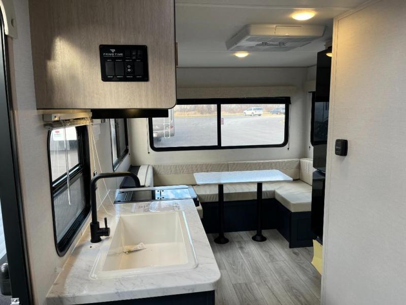 With any Avenger LT travel trailer by Prime Time, the exterior includes an aerodynamic smooth front metal, a front diamond plate for protection on the road, and two stabilizer jacks. There is also exclusive Everlast construction, a PVC roof membrane, and solar prep for the option to go off-grid. The interior offers seamless Carefree Congoleum flooring for easy cleanup and durability, pleated night shades throughout for privacy, a bottle opener, and residential extended ball bearing drawer guides.