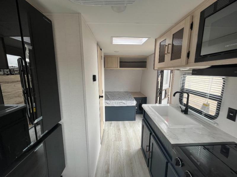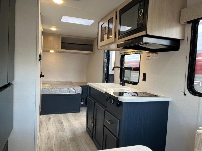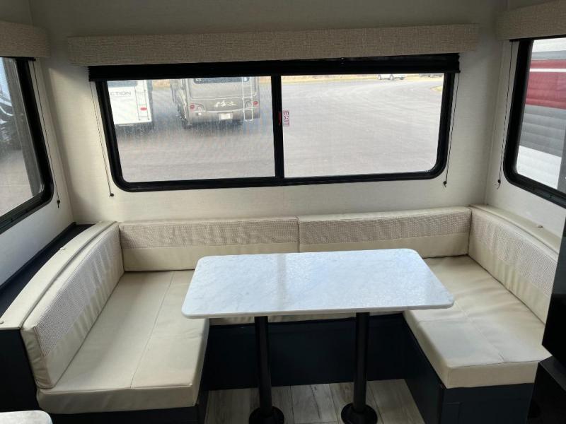 Camping with your friends or family doesn't have to be hard! This easy-to-tow, store and clean up RV allows two to four people to sleep comfortably on the U-shaped dinette along the rear wall with a large window and the front bed with nightstand. The kitchen includes a 10.7 cu. ft. 12V refrigerator, a microwave, plus a two-burner cooktop for preparing meals just like you do at home.