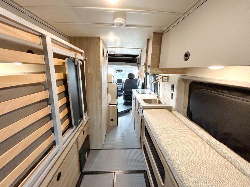 This camper van with an L-track storage system is perfect for those needing more storage space for their hiking and biking gear. You can stay powered up with the 2,800-watt gas generator, and there is a 13,500 BTU air conditioner with directional ducts and dial control that will allow you to come inside to cool off after a trail ride. A Murphy+ bed comes standard, and any guests that tag along can sleep in the pop-top sleeping area! If you choose to remove the pop-top, you'll enjoy the deluxe powered ventilator fan instead. You'll find the wet bath to come in handy when you want to clean up, and the dinette seating with a removable pedestal table will provide a place to enjoy your dinner at.