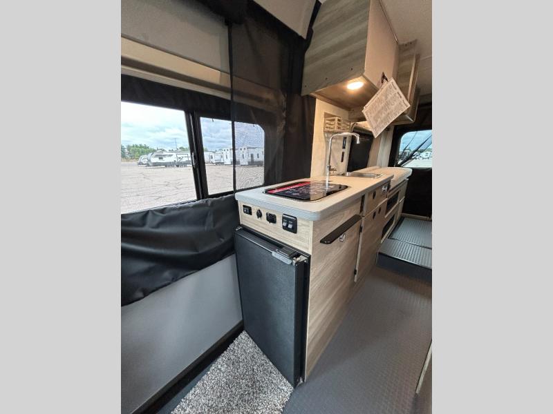 Each Solis Class B gas motorhome by Winnebago sits upon a fuel-efficient Ram ProMaster chassis with a 3.6L V6 engine to power your adventures. You will love the cab conveniences that make each trip enjoyable, like the radio/review monitor system touchscreen and the crosswind assist to keep you steady on the road. Some of the hassle-free amenities you will appreciate are the exterior wash station, the Eco-Hot water system, and the water center control panel located inside the right rear door. Head indoors to find heavy-duty vinyl flooring throughout, a laminate countertop and a stainless steel sink in the galley, plus tinted coach windows for added privacy. The Solis also features off-grid capabilities with its two deep-cycle Group 31 batteries and 220-watt flexible surface solar panel with a controller. Adventures awaits in the Solis Class B gas motorhome!