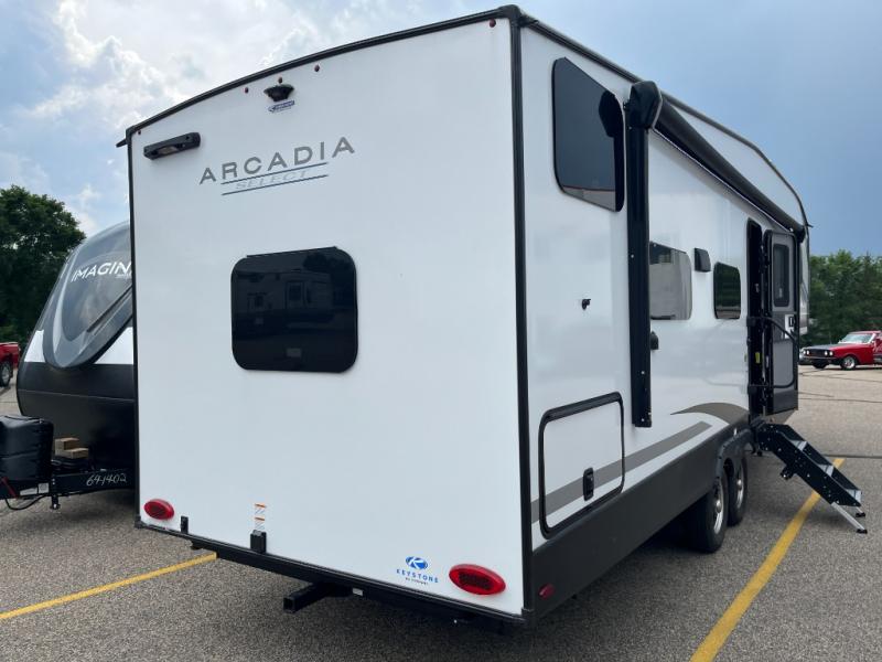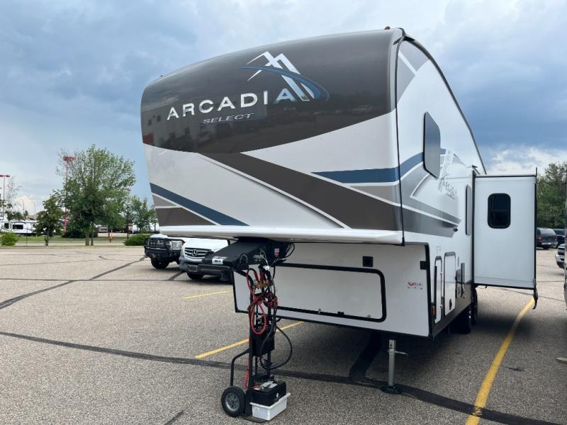 With any Arcadia Select fifth wheel by Keystone you will enjoy easy towability and at-home comforts at an affordable price! The laminated sidewalls with five sided aluminum superstructure will provide a strong foundation so you can enjoy your RV for years to come, plus a one-piece, heated and enclosed polypropylene underbelly means you can camp year around! And an upgraded Roto-Flex hitch pin with MaxTurn technology, Road Armor rubberized equalization suspension system and Dexter Nev-R-Adjust electric brakes will make it easy to tow. Head inside to find tall slides for added space, seamless, pressed countertops, convenient underbed storage, and a large shower with a retractable door and skylight. These fifth wheels also include a Blade Pure A/C system, Girard on-demand tankless water heater, two 30 lb. LP tanks, and more utilities to make your camping experience run smoothly.