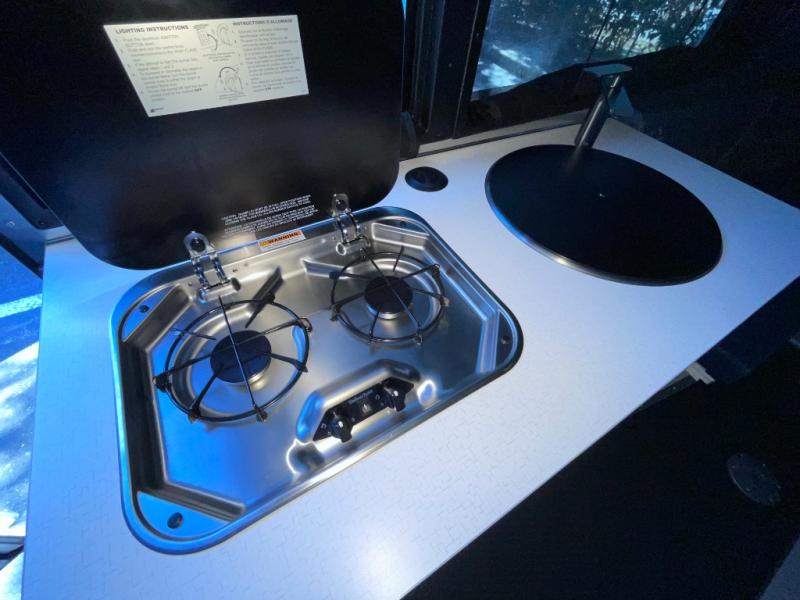 This travel trailer includes the Basecamp X Package that comes with stainless steel front stone guard protection, Goodyear off-road tires, and a 3" lift kit for added ground clearance. You can easily sleep everyone when using both the rear benches and the front U-shaped dinette. The benches provide split sleeping or a half-bed on one side and a full bed that spans the back of the trailer into an 82" x 78" area. There is storage under the cushions for the two removable tables that allow you to dine, work and relax with a place for your cellphones and such. The wet bath comes complete with a shower, sink and toilet so you can rinse off from a day outdoors, the galley kitchen gives the cook a place to make warm meals and store drinks and leftovers. This Basecamp also offers front panoramic windows, a steel entry step, a full-size spare tire, and a rear hatch allowing you to take your snowboards, skis, and paddle boards.