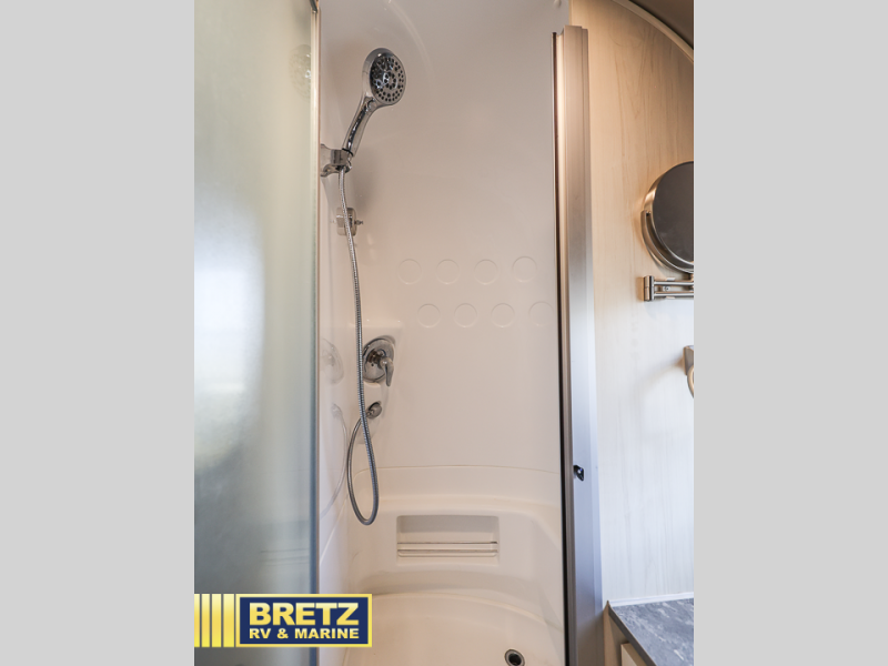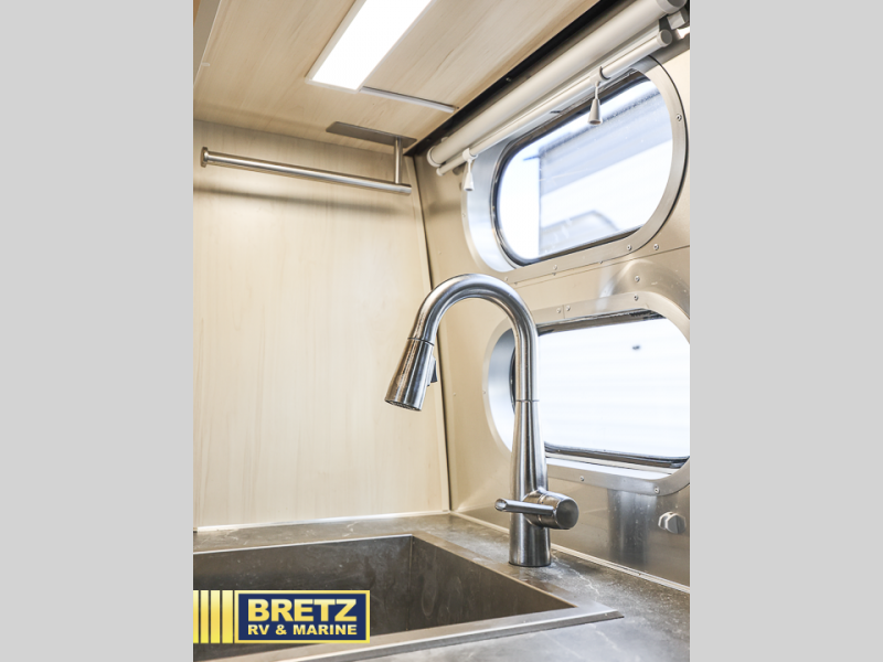 With each Flying Cloud travel trailer by Airstream, there are two axles, and each is built for ease of towing, plus there is a rear-view camera to make reversing and parking easier, and stainless steel front stone guards to protect the lower segments from road debris. The iconic Airstream design is created outside and inside by the semi-monocoque aluminum superstructure, the temperature reducing one-piece white aluminum roof, the panoramic front windows, and the stylish aluminum wheels. The interior will have you feeling right at home with handcrafted cabinetry, plenty of storage and counter space, sleek roller blinds and blackout curtains, plus residential style faucets!