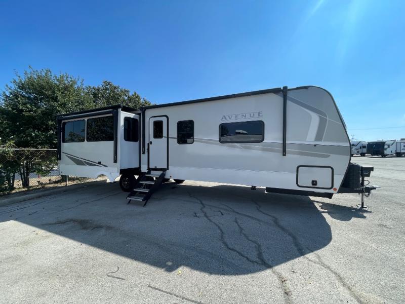 With any Avenue fifth wheel or travel trailer by Alliance RV, you will enjoy more interior space provided by the 8' 5" wide-body construction, and a long list of luxury features. Each is built with Azdel composite sidewalls both inside and out, along with a PVC roof for added strength. There are innovative storage solutions that include hidden storage behind the TV, within end tables and ottomans, and more. Since these units feature no carpet throughout, cleaning will be easier than ever, and there are flush floor slides throughout for seamless living spaces. The Avenue also comes with the OTG Solar Package with a 400 watt solar panel, inverter prep, multiple outlets, and more to keep you charged up!