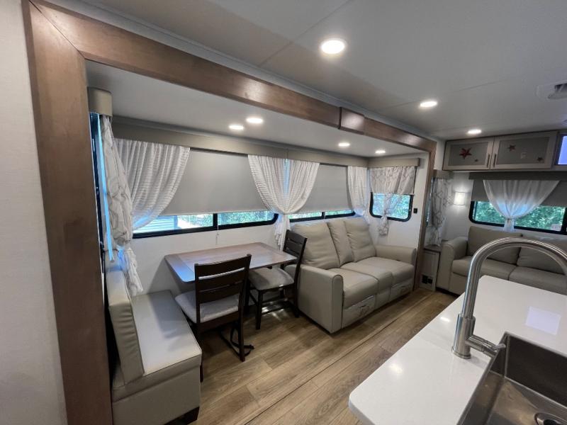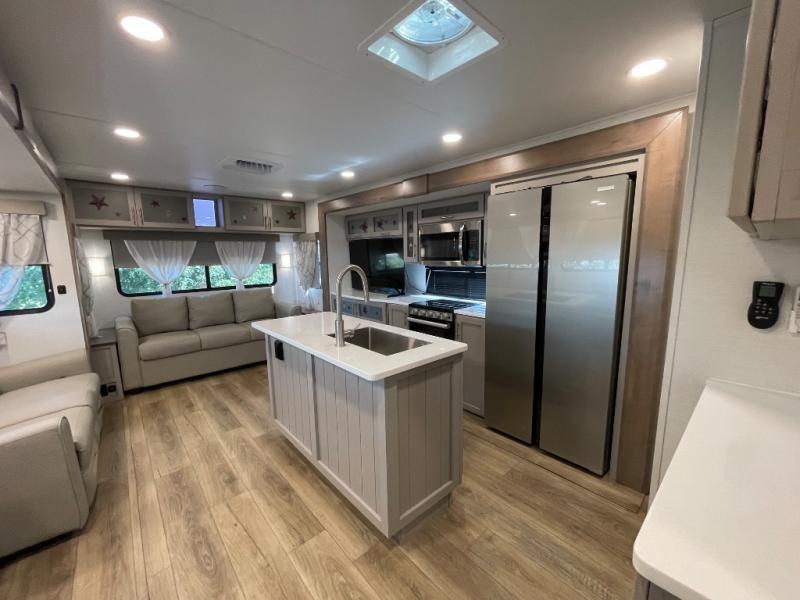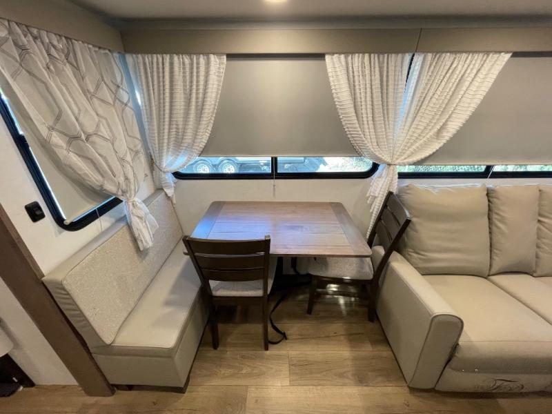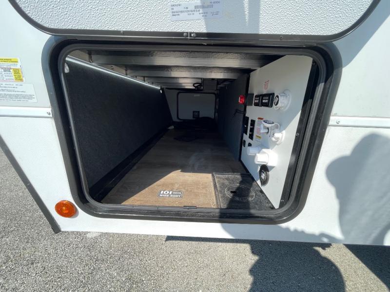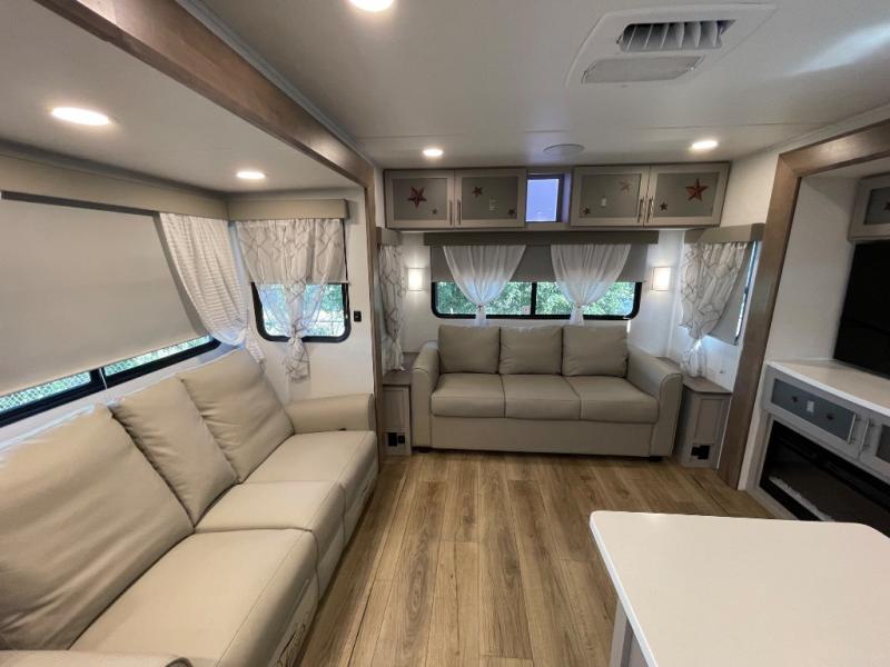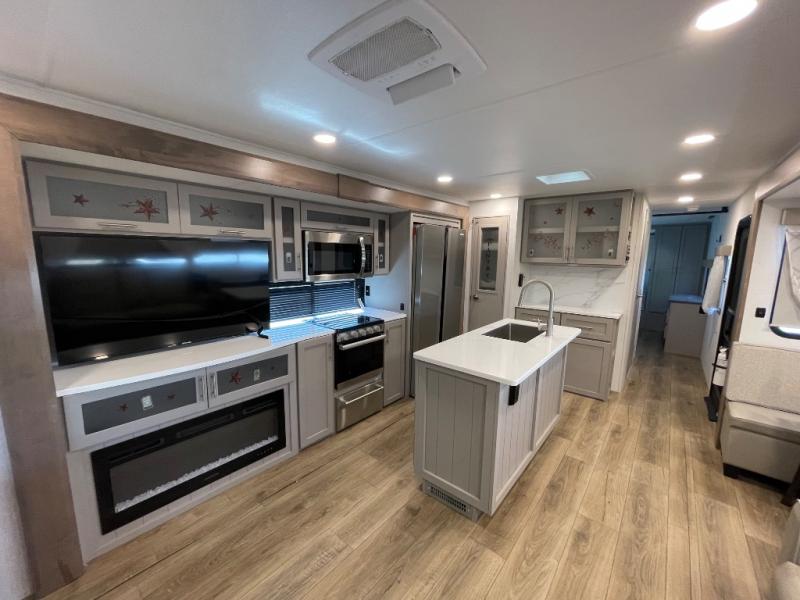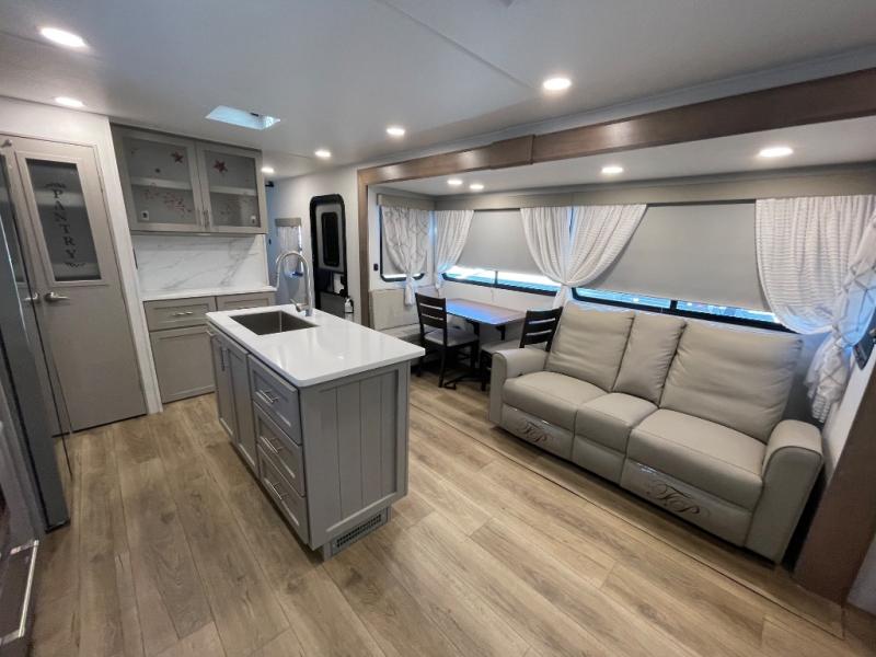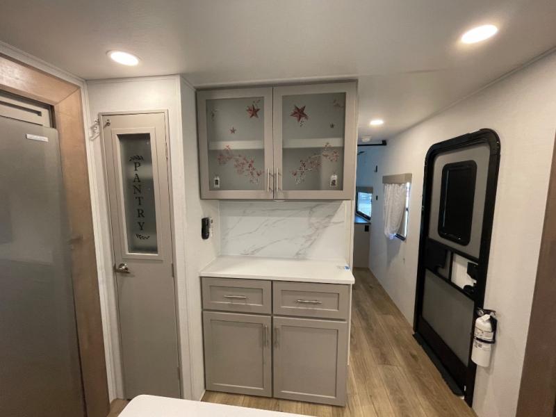 A kitchen island with countertop space makes it easy to prepare meals in this travel trailer! The floating dinette table has two chairs on one side and a movable ottoman with flip up storage on the other side to keep your games or extra table cloths in. You can store your dishes and snacks inside the hutch/pantry or in the second pantry. The front private bedroom has a queen bed slide but can be switched out for the optional king bed if you like. There is also a dresser and large wardrobe with shelving plus washer and dryer prep if you choose to add those appliances. The rear living area features a dual recliner theater seat across from an entertainment center with a 50" class HDTV with hidden storage behind it, and is also on a swing mount for all to see even at the rear sleeper sofa!