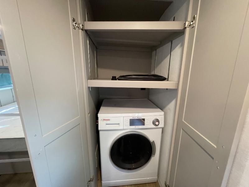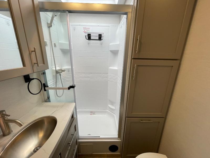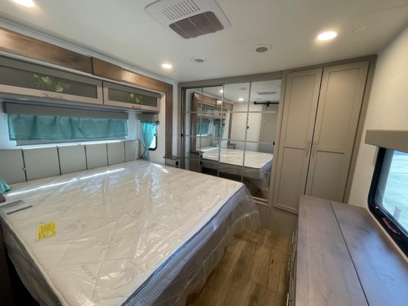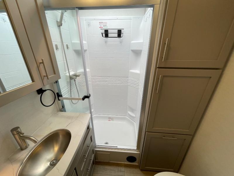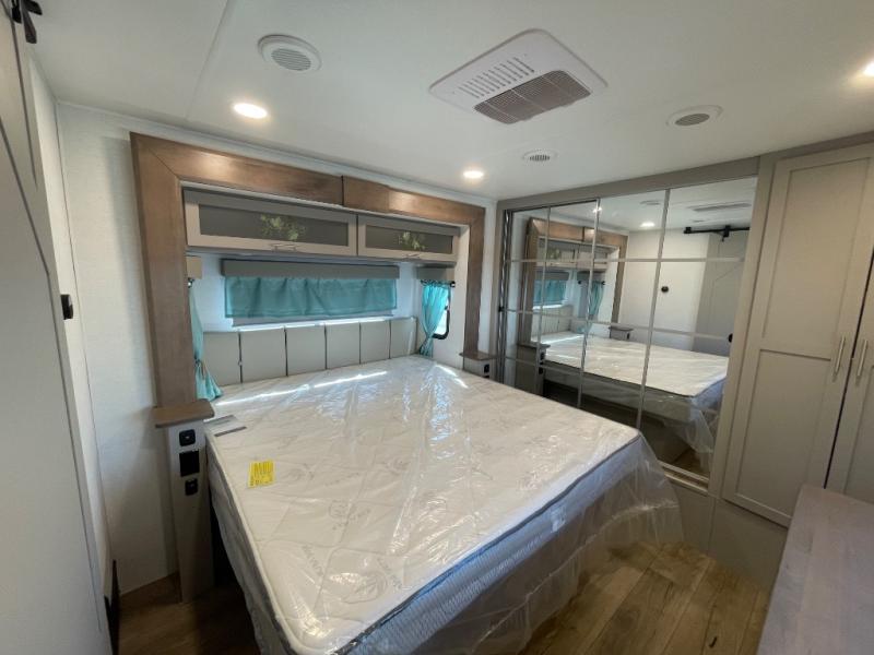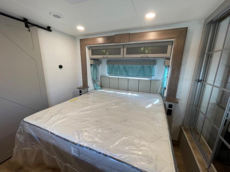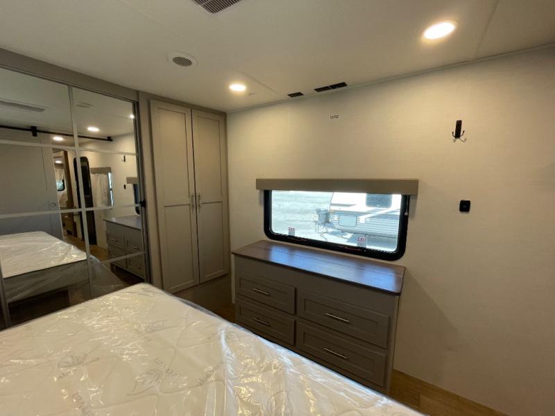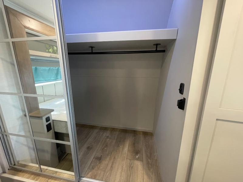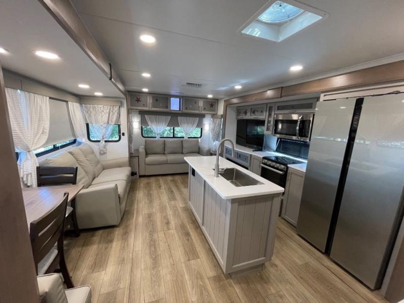 A kitchen island with countertop space makes it easy to prepare meals in this travel trailer! The floating dinette table has two chairs on one side and a movable ottoman with flip up storage on the other side to keep your games or extra table cloths in. You can store your dishes and snacks inside the hutch/pantry or in the second pantry. The front private bedroom has a queen bed slide but can be switched out for the optional king bed if you like. There is also a dresser and large wardrobe with shelving plus washer and dryer prep if you choose to add those appliances. The rear living area features a dual recliner theater seat across from an entertainment center with a 50" class HDTV with hidden storage behind it, and is also on a swing mount for all to see even at the rear sleeper sofa!