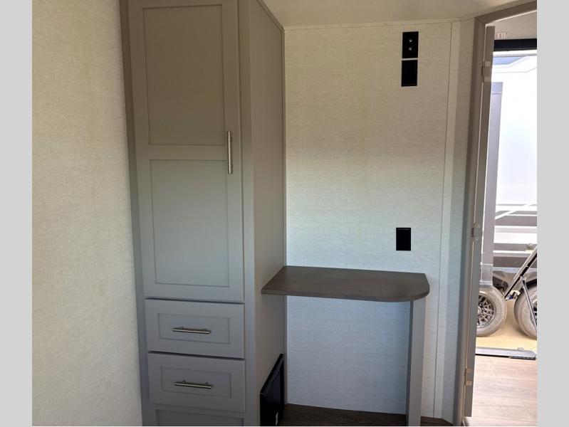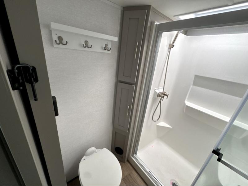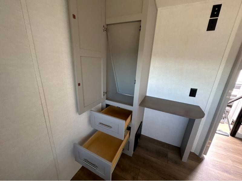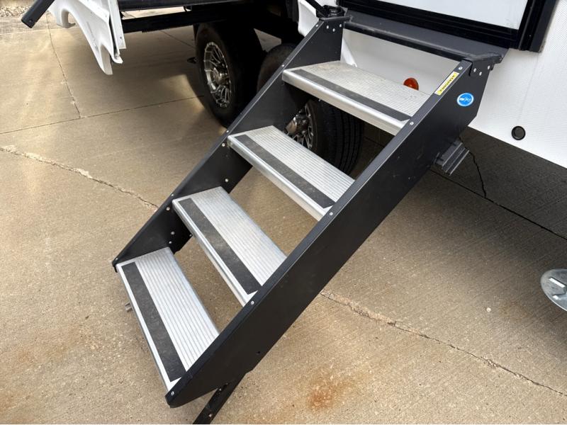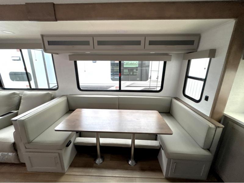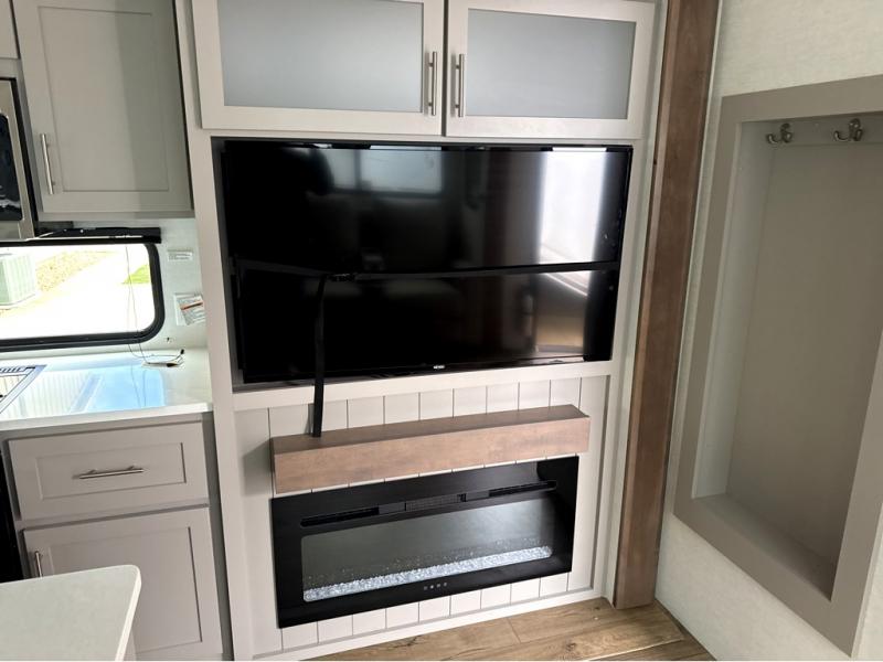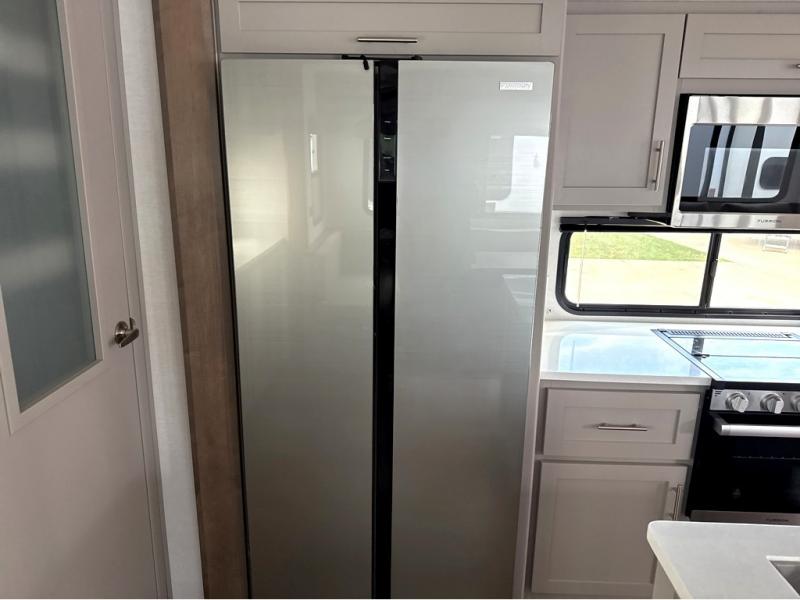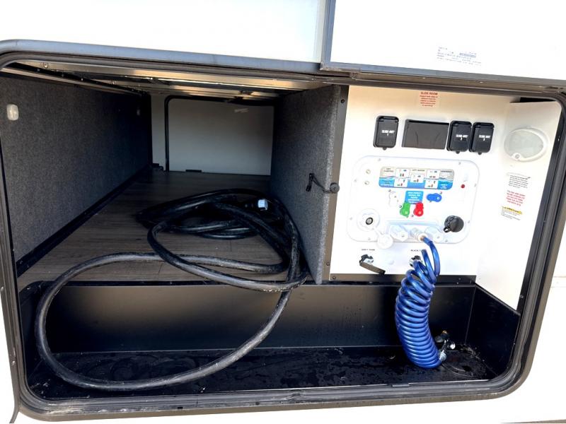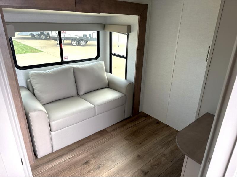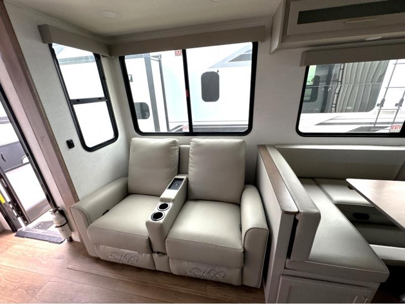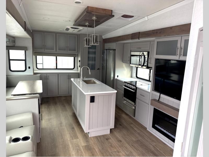 This fifth wheel is packed full with comfortable features! The front private bedroom has a queen bed slide that can be switched out for an optional king bed, a dresser, and a front wardrobe with washer and dryer prep. Freshen up each morning in the full bathroom with a 30" x 50" shower then head to the full kitchen to prepare breakfast using the kitchen island and three burner cooktop. The second bedroom has a sofa slide with a loft above it all. Relax each night on the dual recliner theater seating across from the swing mount 50" HDTV with hidden storage behind it, or play a few games at the U-shaped dinette. This model also has the option to switch out the U-shaped dinette for an optional floating dinette table beside the theater seat. You also have an outside refrigerator and outside griddle by a flip-up baggage door for storage!