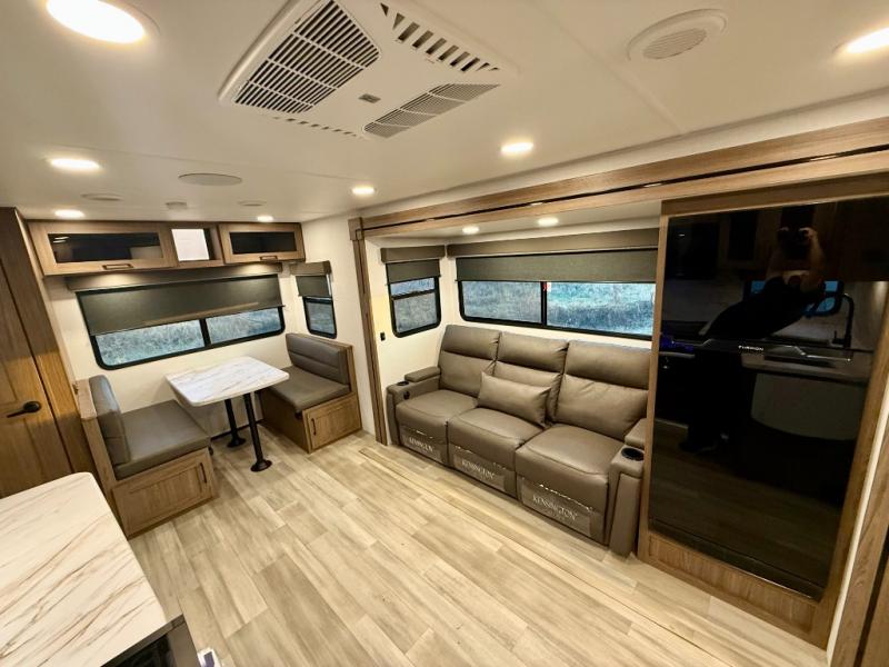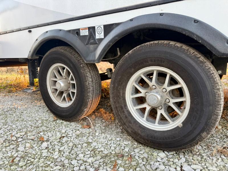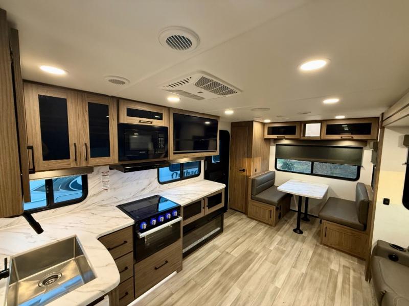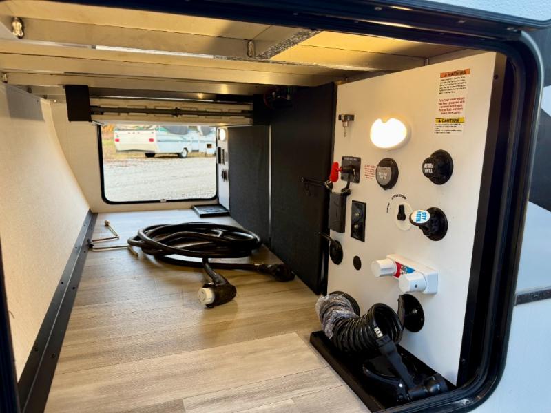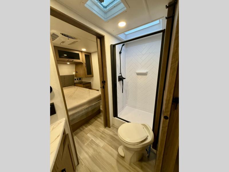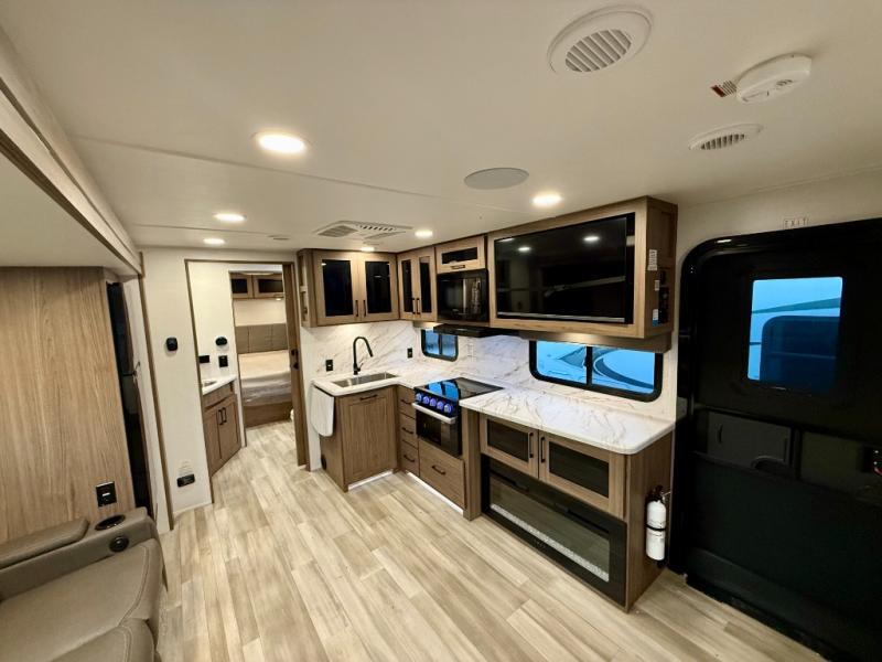 Grab your hiking boots and your sense of adventure for fun camping trips in this single slide out travel trailer. The rear booth dinette includes overhead storage for your things and the sofa slide out is in great view of the 40" HDTV. There is also a fireplace here that will make your space feel more like home plus more storage space, including an entryway pantry and storage above the 10 cu. ft. 12V refrigerator. A walk-through bath will take you to the front master bedroom with a queen bed, wardrobe nightstands, plus its own exterior entry door!