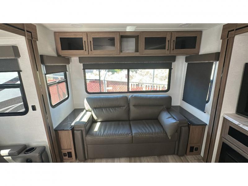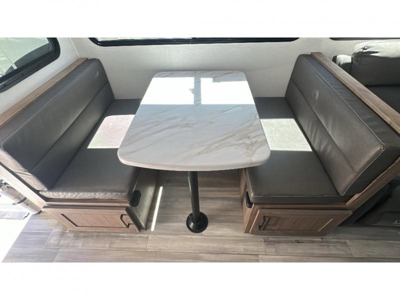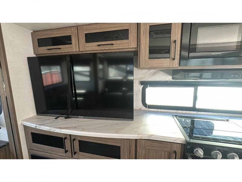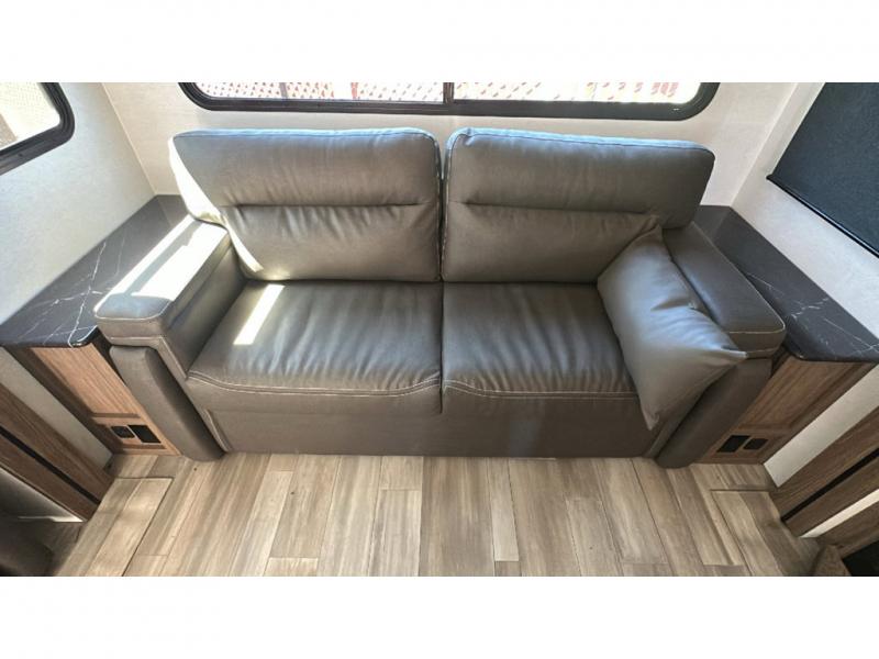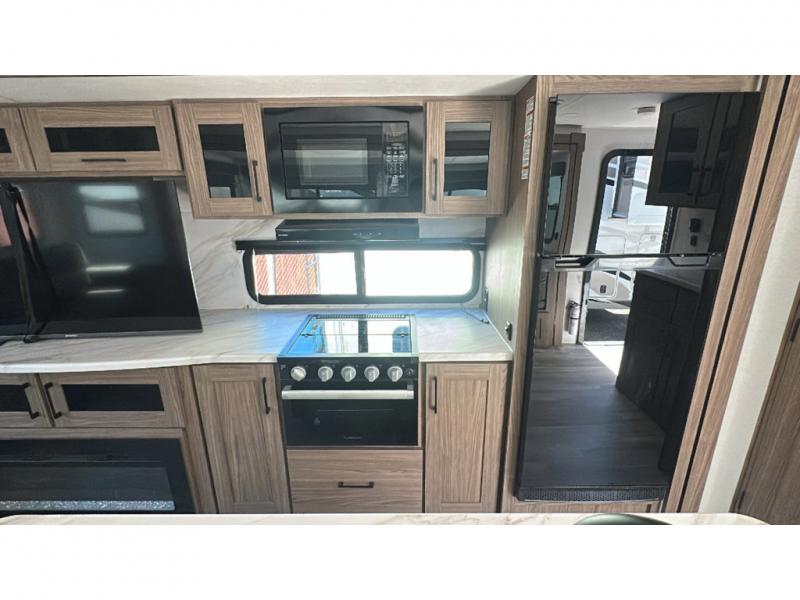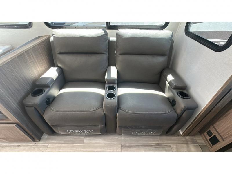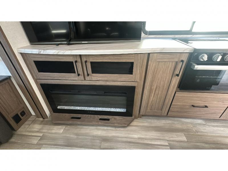 You will feel right at home camping in this travel trailer! The rear living area has a rear sofa and a set of theater seating conveniently across from the entertainment center with a 50" class HDTV above a pull-out fireplace storage for a cozy evening indoors. Prepare your best home cooked meals with the three burner cooktop, kitchen island which even has a tip-out trash can, and 10 cu. ft. 12V refrigerator. Enjoy your meals at the free standing dinette then either freshen up in the full bathroom with the 30" x 36" shower or head outside to relax under one of the two awnings. The front private bedroom has a queen bed for you to lay your head on at night and has wardrobe nightstands for your items!