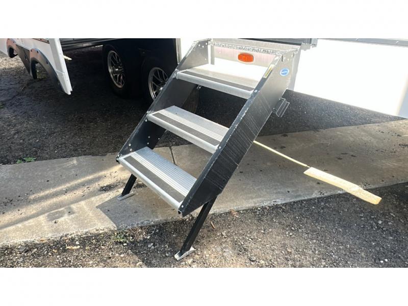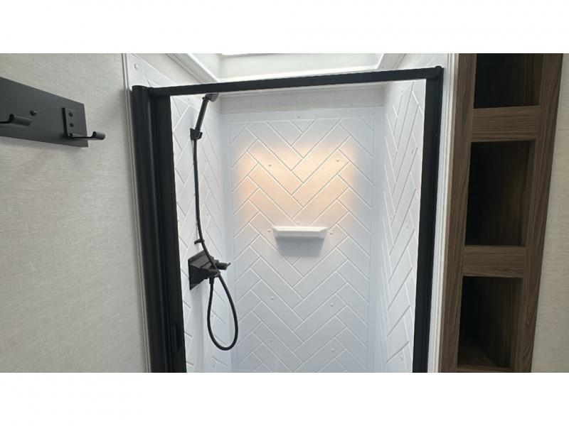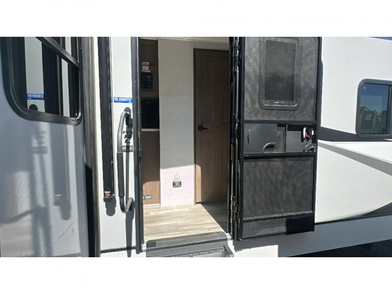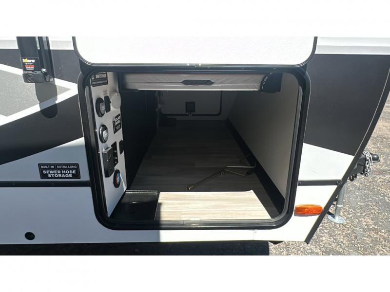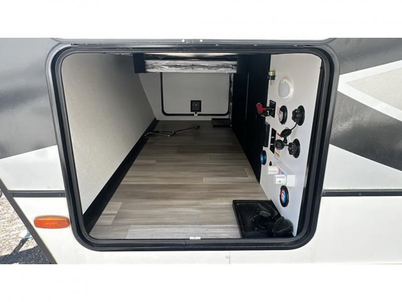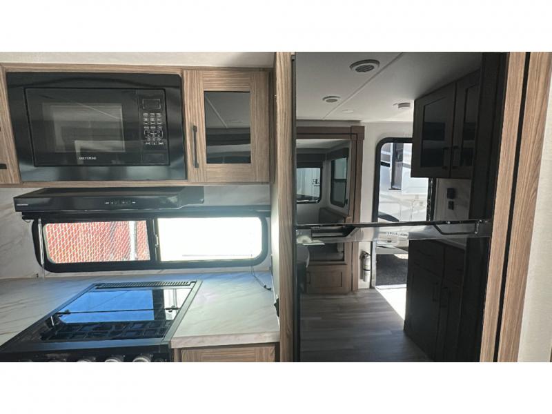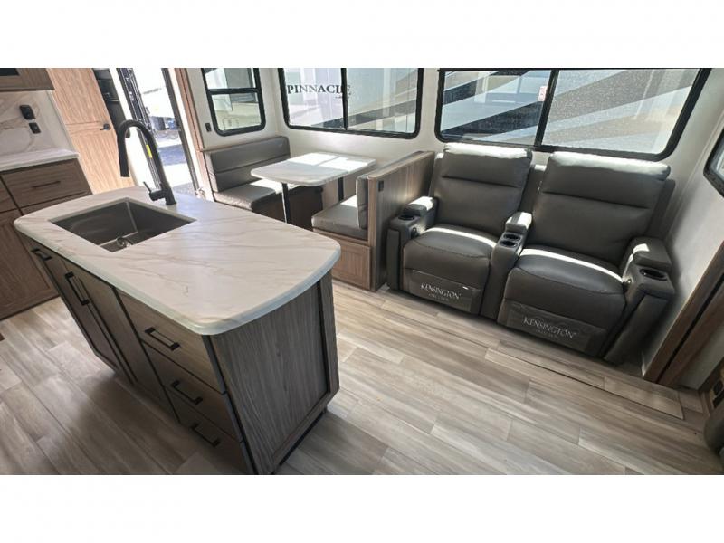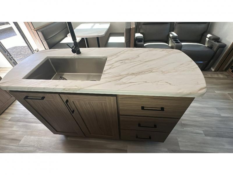 You will feel right at home camping in this travel trailer! The rear living area has a rear sofa and a set of theater seating conveniently across from the entertainment center with a 50" class HDTV above a pull-out fireplace storage for a cozy evening indoors. Prepare your best home cooked meals with the three burner cooktop, kitchen island which even has a tip-out trash can, and 10 cu. ft. 12V refrigerator. Enjoy your meals at the free standing dinette then either freshen up in the full bathroom with the 30" x 36" shower or head outside to relax under one of the two awnings. The front private bedroom has a queen bed for you to lay your head on at night and has wardrobe nightstands for your items!