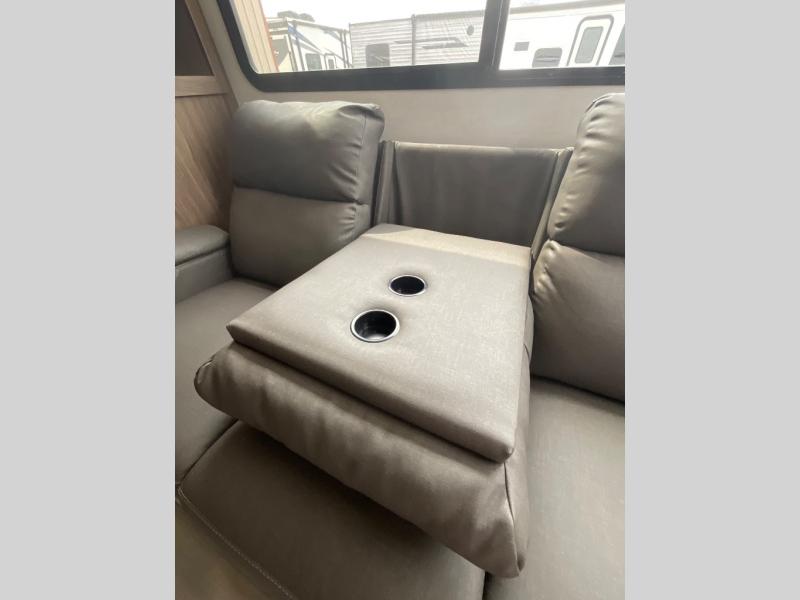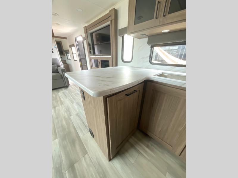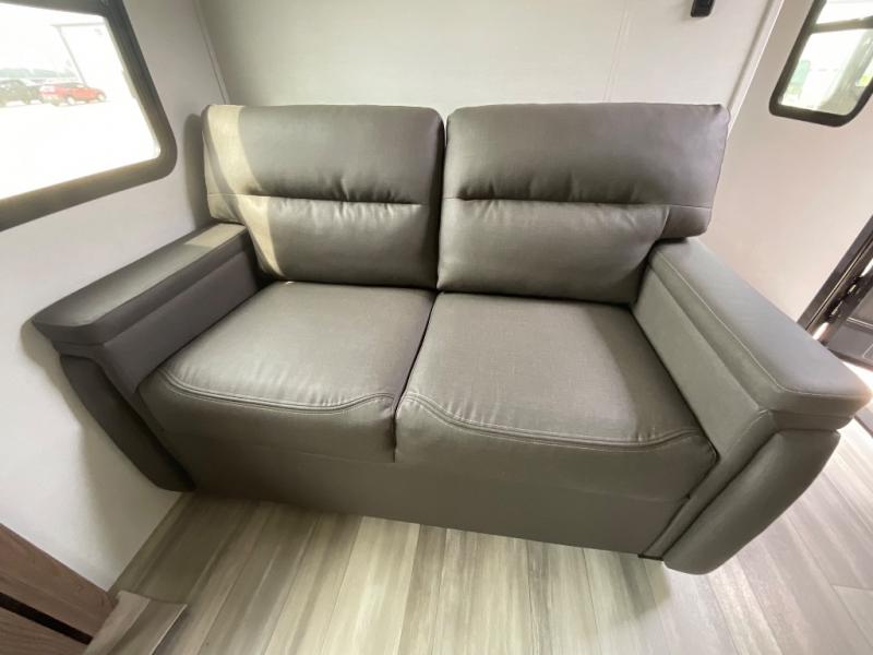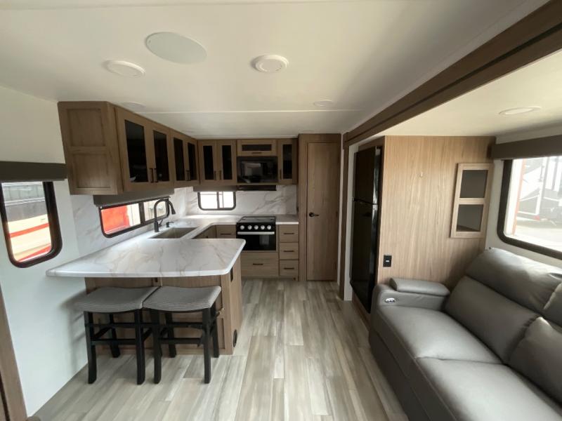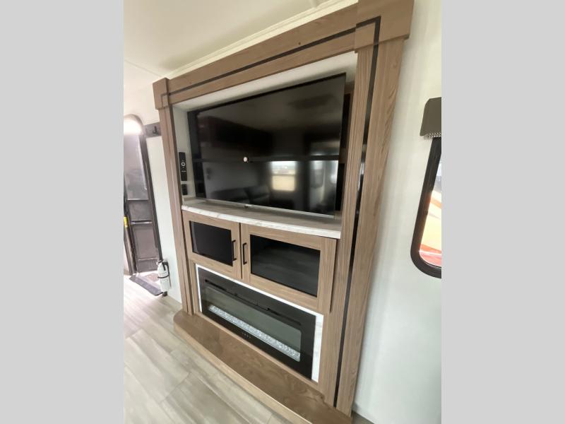 Start camping in luxury with this travel trailer! Prepare your best home cooked meals in the rear kitchen with the three burner cooktop, 10 cu. ft. 12V refrigerator, tip-out trash can, and even two bar stools to enjoy your morning coffee while reading the newspaper. Freshen up in the full bathroom with the 30" x 36" shower or head outside to relax under one of the two awnings. There is even an outdoor griddle/grill underneath one of the awnings to protect you while you grill up some juicy burgers, plus an outside 32" TV. The front private bedroom has a queen bed for you to lay your head on at night and has wardrobe nightstands for your items. Relax in true comfort each night on one of the two furniture spots in front of the entertainment center with a 50" class HDTV with a fireplace below it!