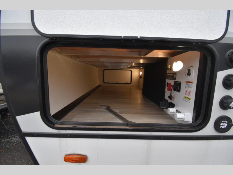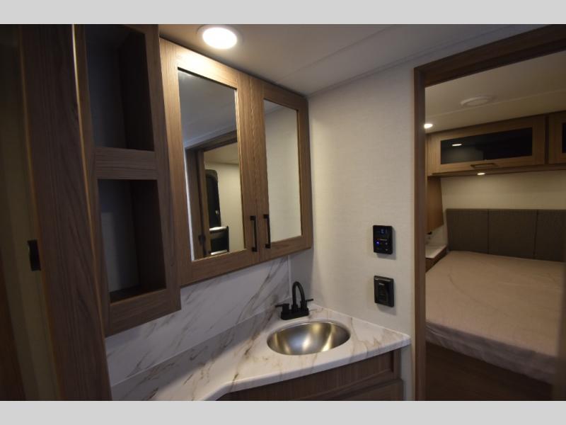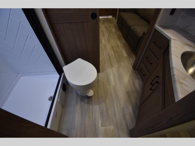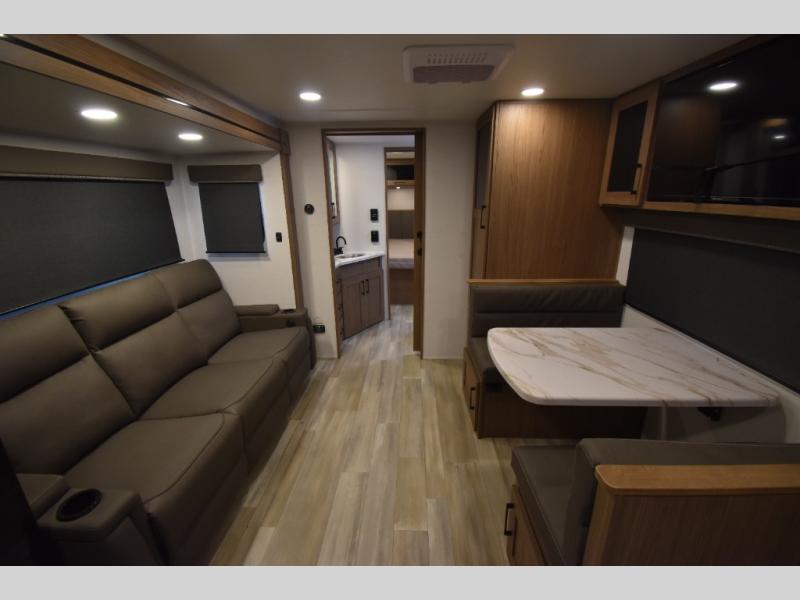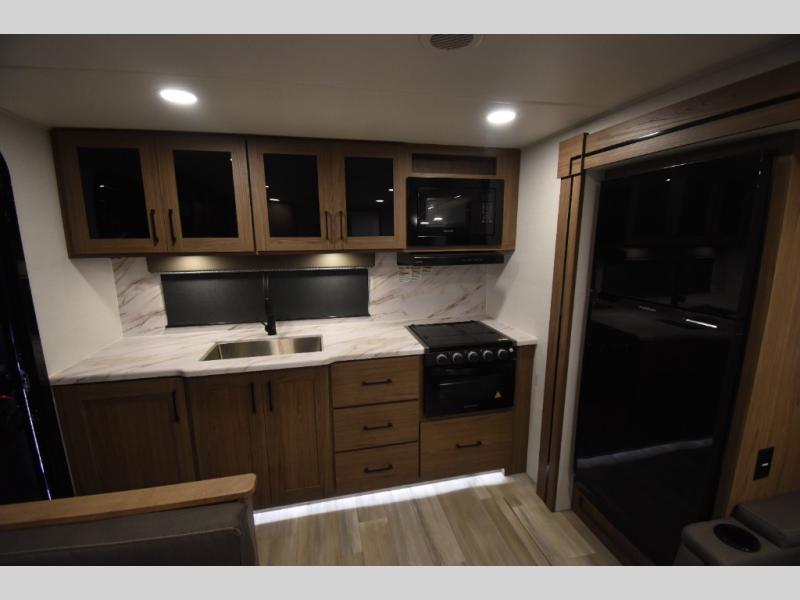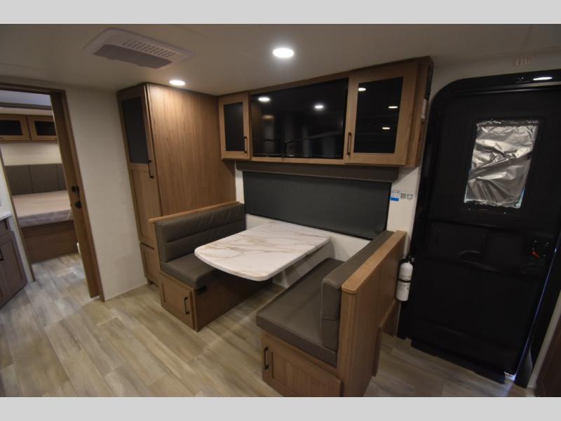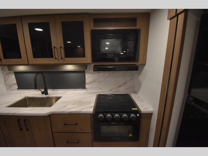 You'll love camping in this rear kitchen travel trailer with generous counter space and overhead storage for spices, dishes, and more. You can dine each day at the booth dinette or relax on the sofa slide out, which will provide more floor space. The spacious walk-thru bath includes a 30" x 36" shower, toilet, and vanity so you can clean up each day. Head to the front master bedroom where you can sleep soundly on the walk-around queen bed with dual nightstands and wardrobes. The second entry door is also found in this room so you can slip out for an early morning run!