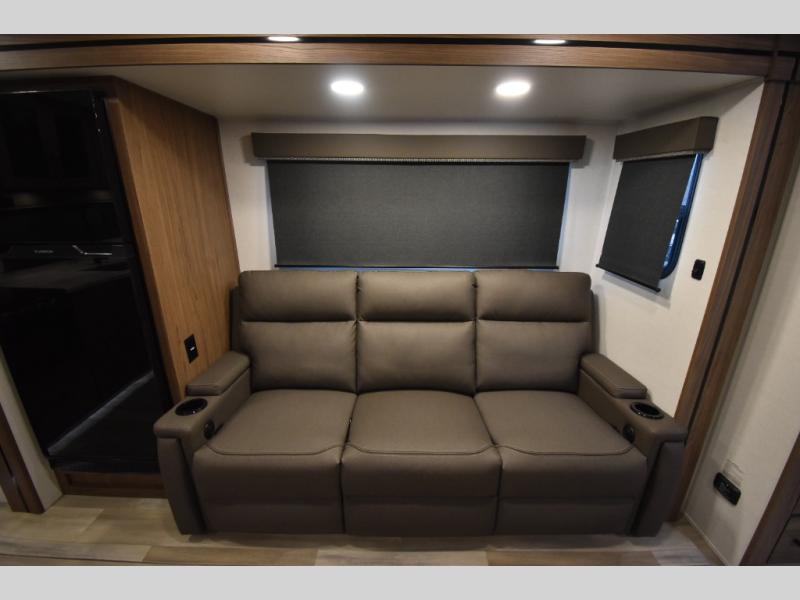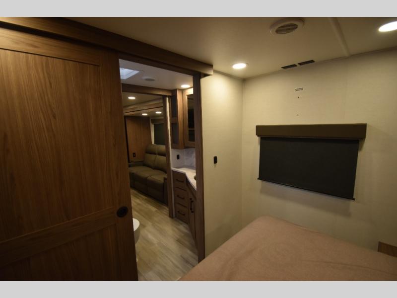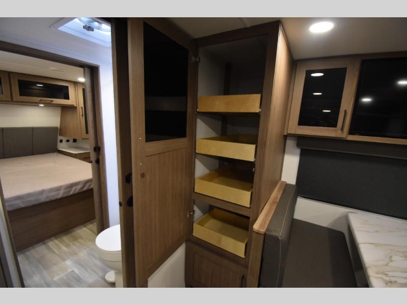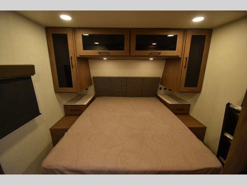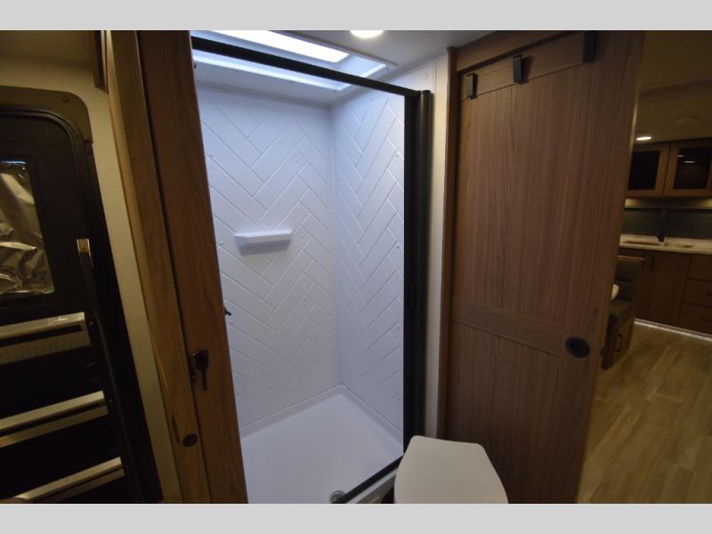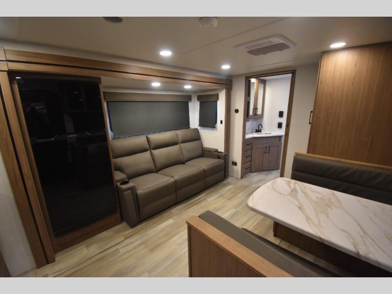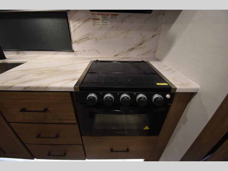 You'll love camping in this rear kitchen travel trailer with generous counter space and overhead storage for spices, dishes, and more. You can dine each day at the booth dinette or relax on the sofa slide out, which will provide more floor space. The spacious walk-thru bath includes a 30" x 36" shower, toilet, and vanity so you can clean up each day. Head to the front master bedroom where you can sleep soundly on the walk-around queen bed with dual nightstands and wardrobes. The second entry door is also found in this room so you can slip out for an early morning run!