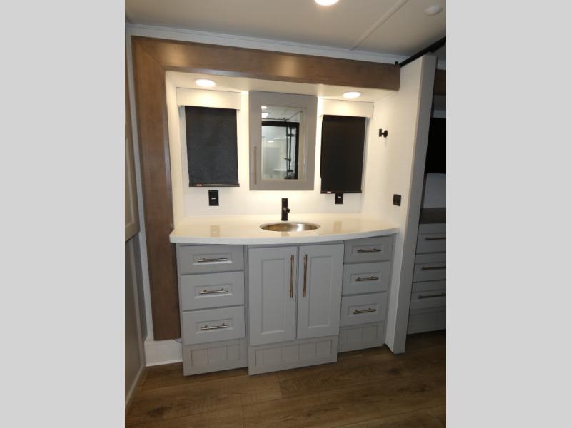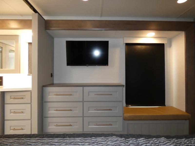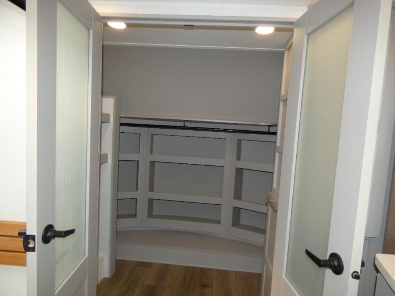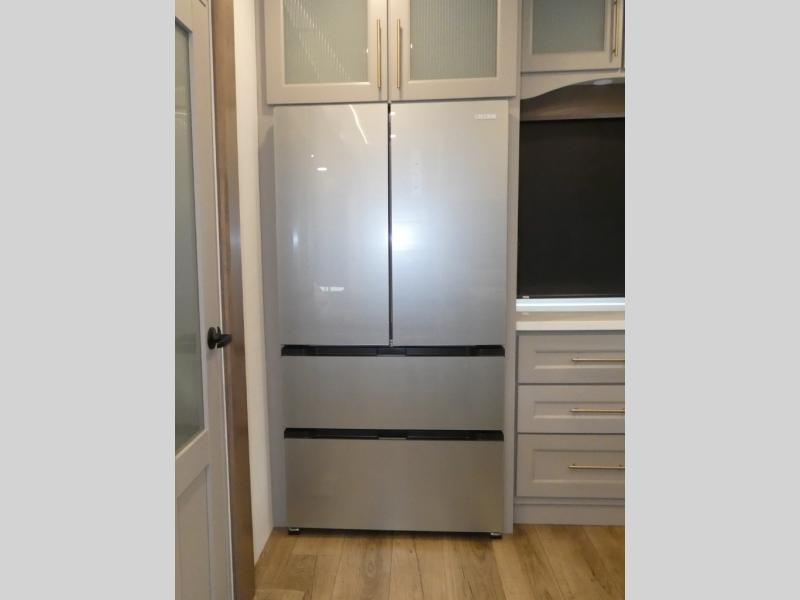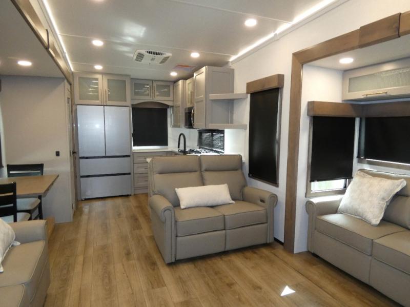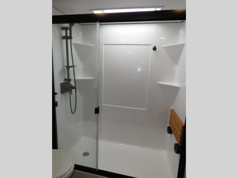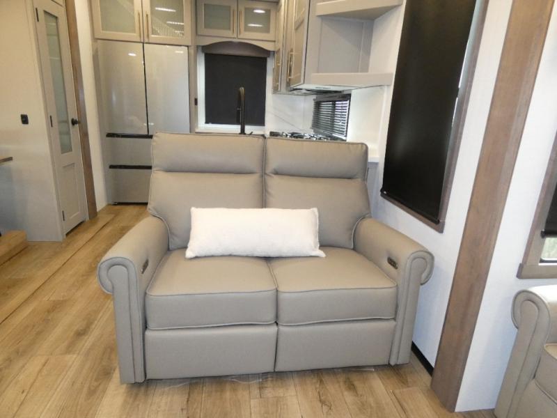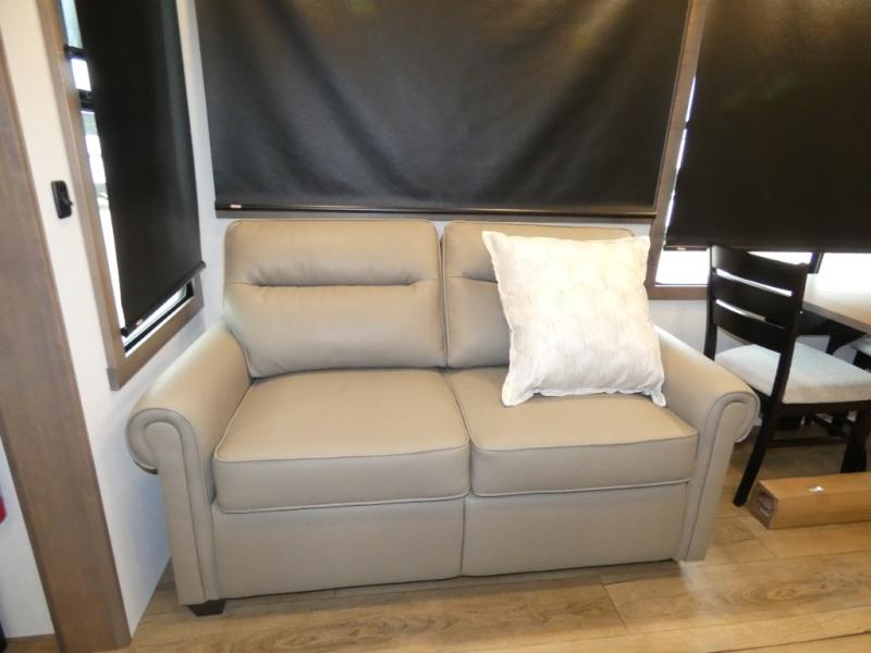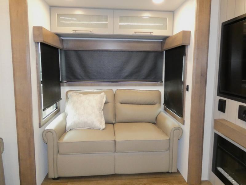 You won't want to camp any other way once you step inside this fifth wheel! the chef will enjoy all of the space in the rear kitchen with ample counter space, a 19 cu. ft. 12 volt residential refrigerator, and a pantry for snacks. Everyone will love to meet in the middle living area that includes dual sleeper sofas and a dual recliner loveseat across from the 50" Smart TV and fireplace. The half bathroom is nearby for quick bathroom breaks too. You will feel right at home in the master suite with a king bed slide to lay your head on at night, a flip top dresser with a Smart TV above it to watch your movies in true comfort, and a seat with storage, plus access to the front full bathroom. Inside the bathroom, you will find a 61" x 30" shower to freshen up in and a walk-in closet with a hamper and shelves.